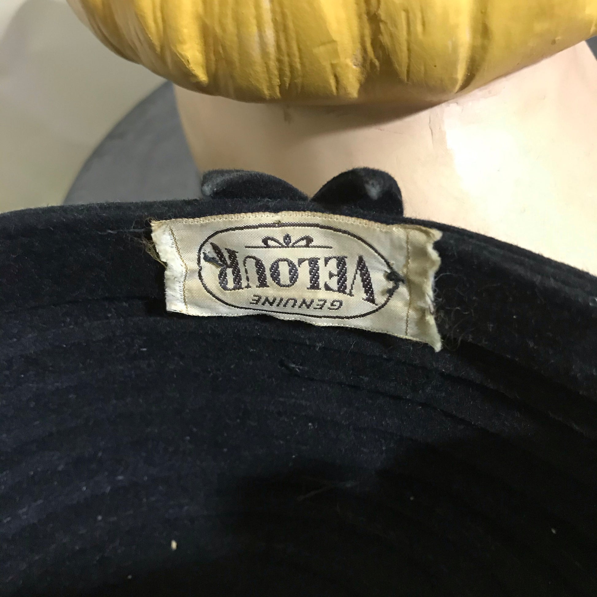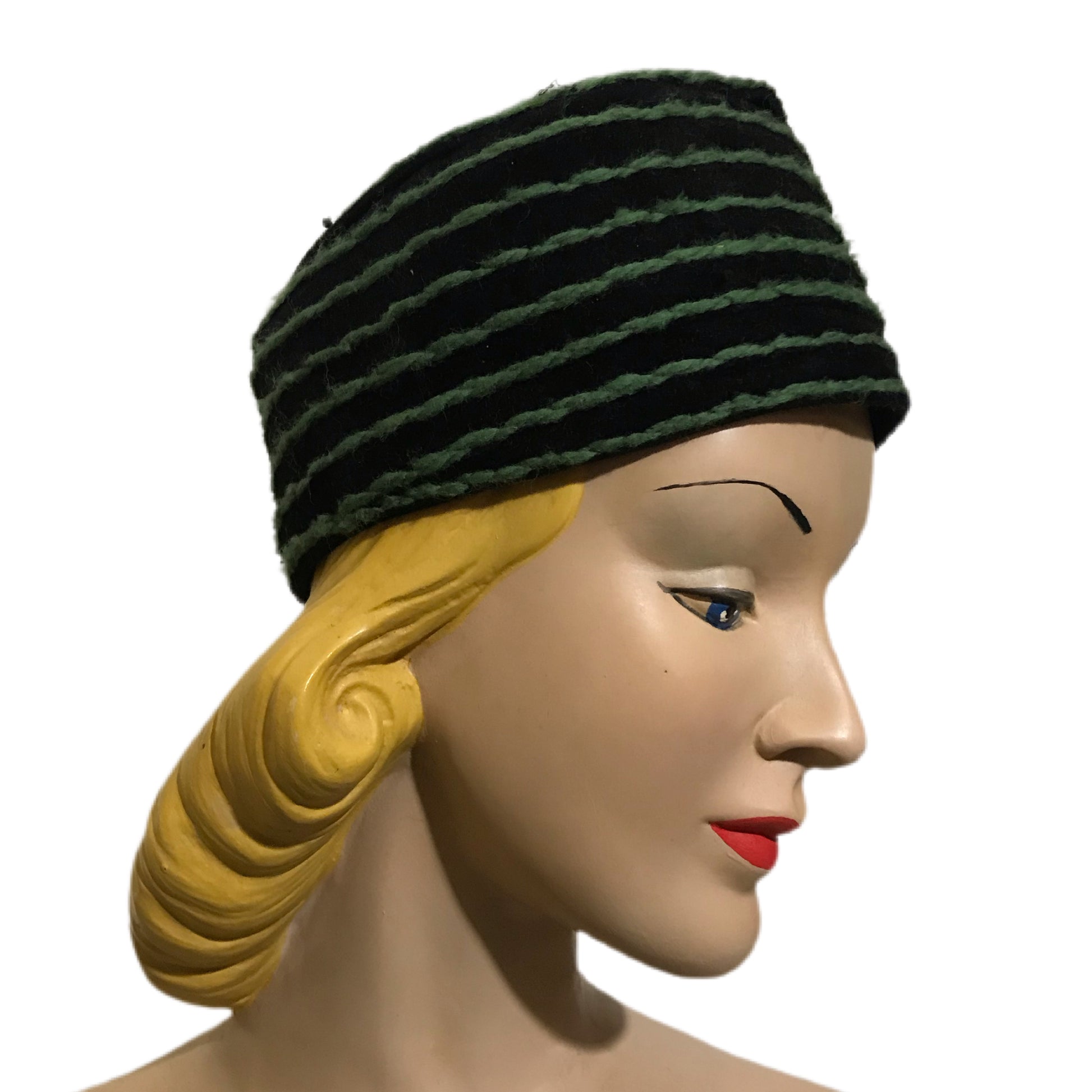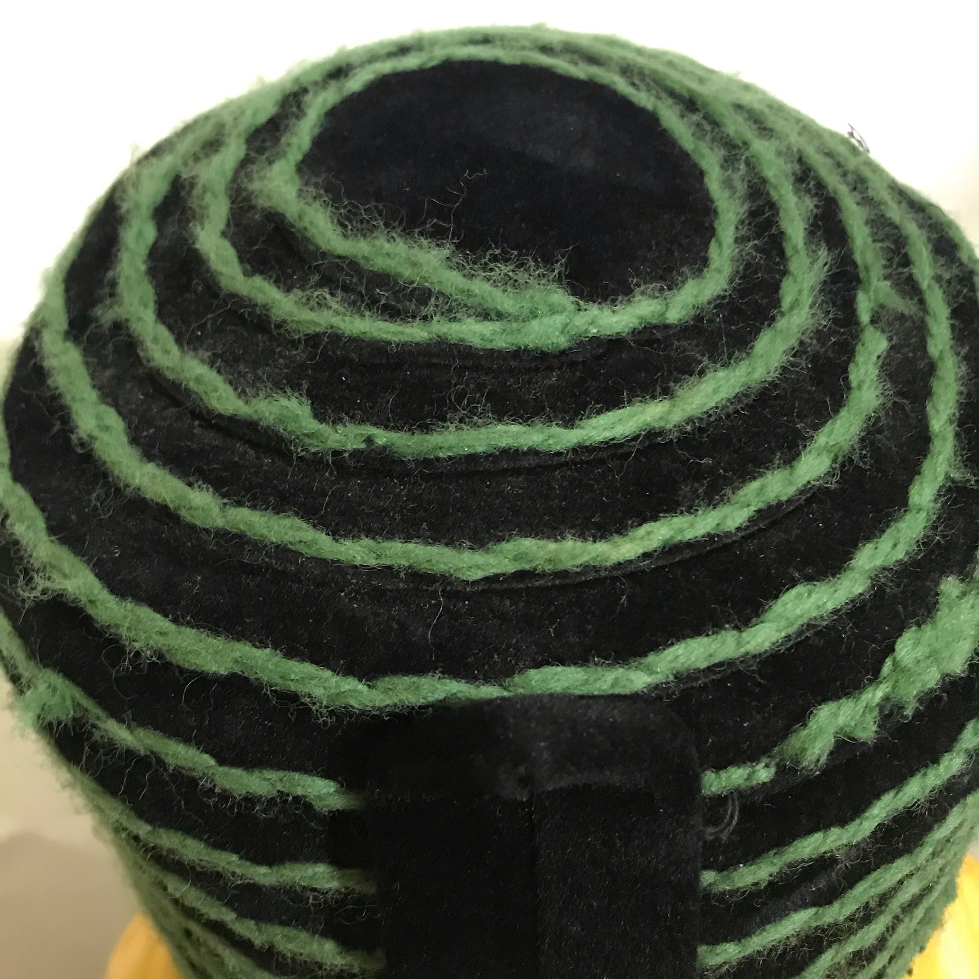 Black Felted Wool Fez Style Hat Green Yarn Top Stitch Detail circa 1960s