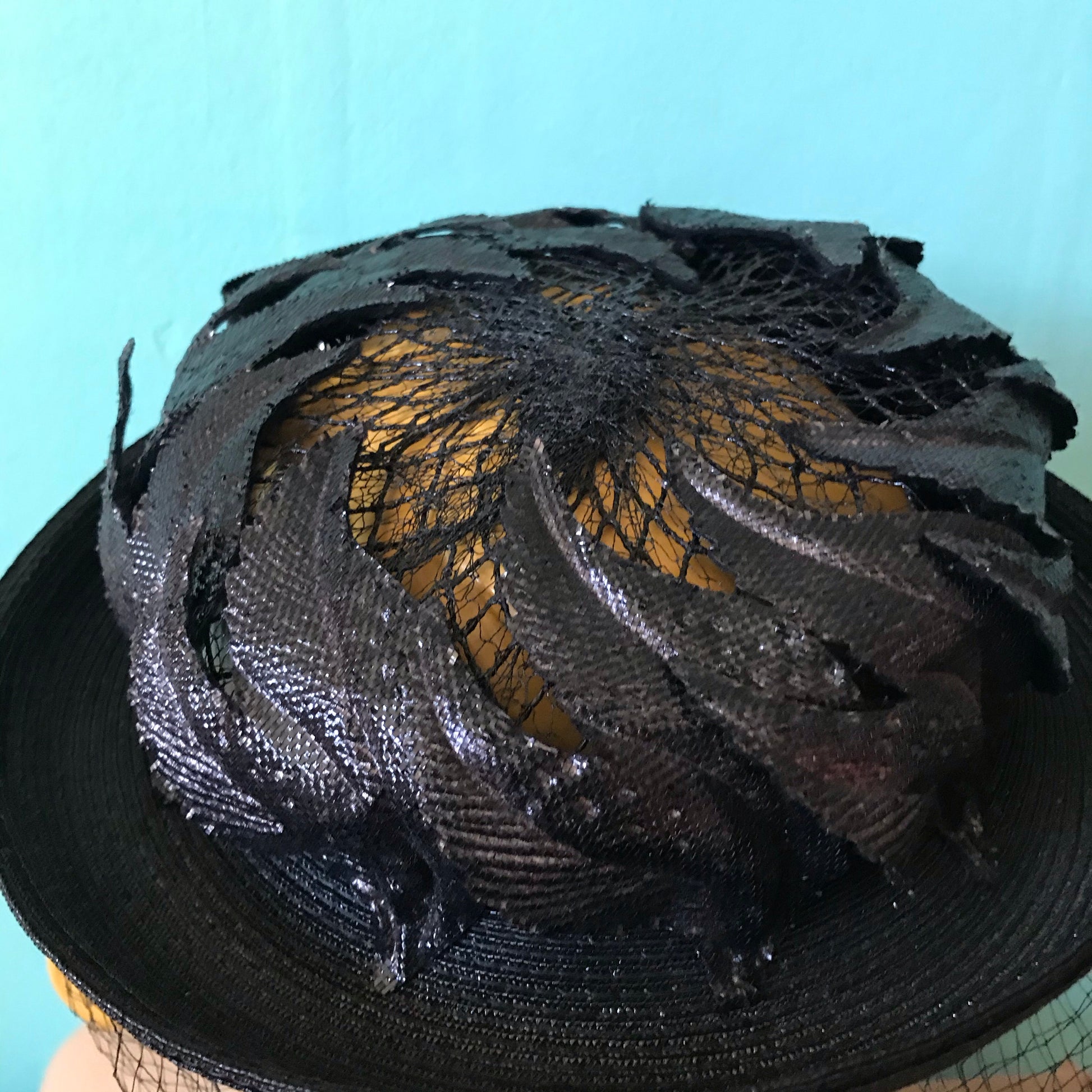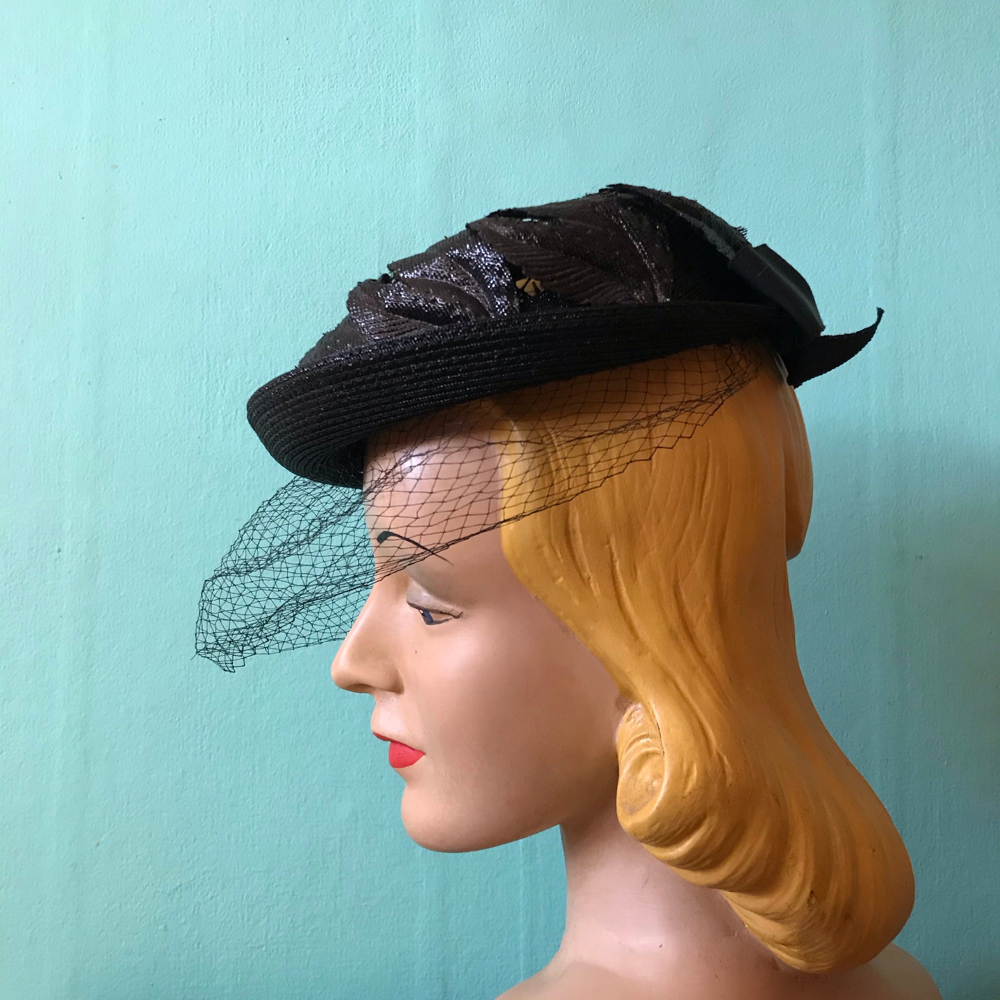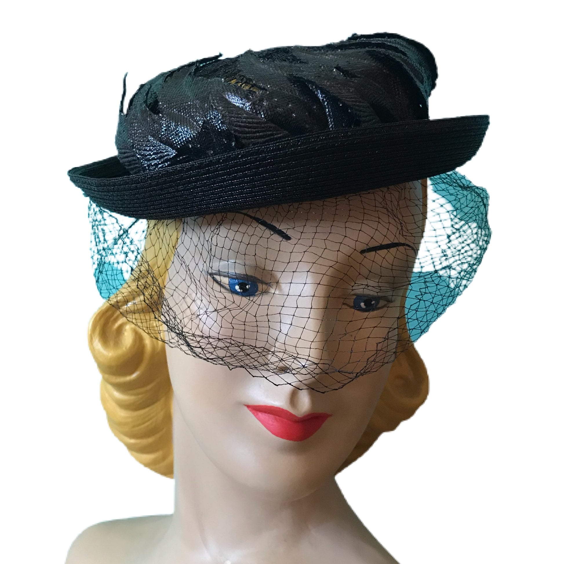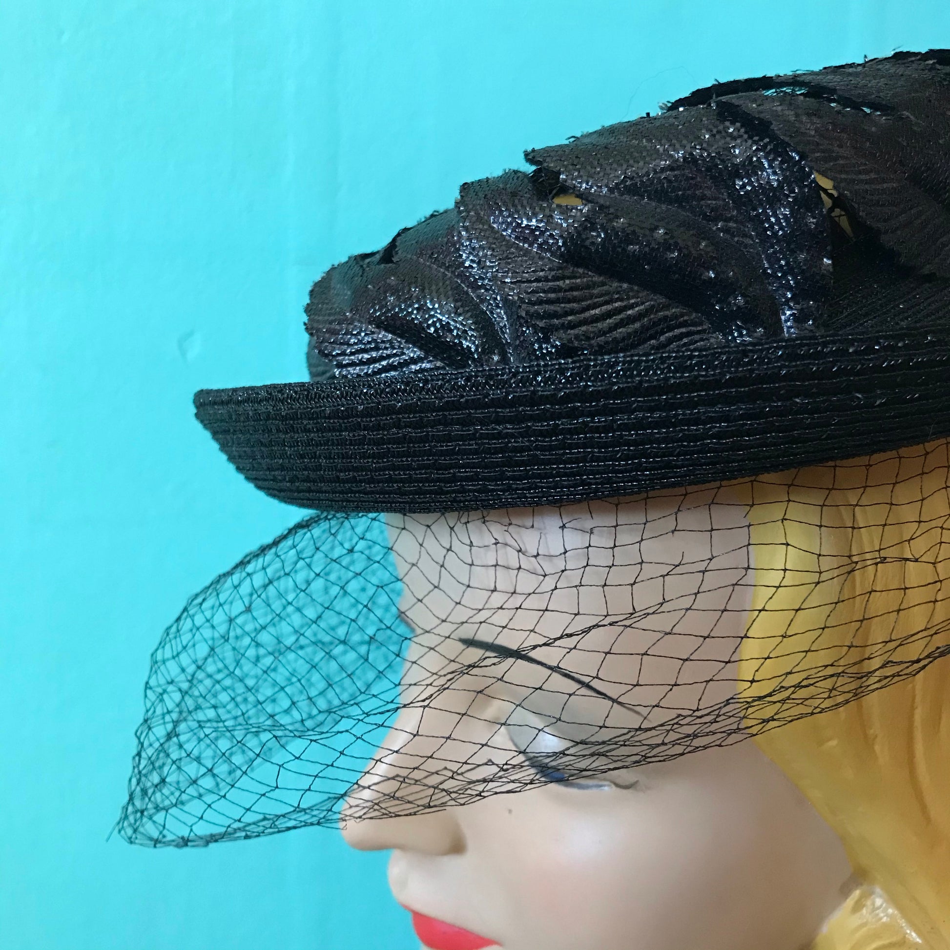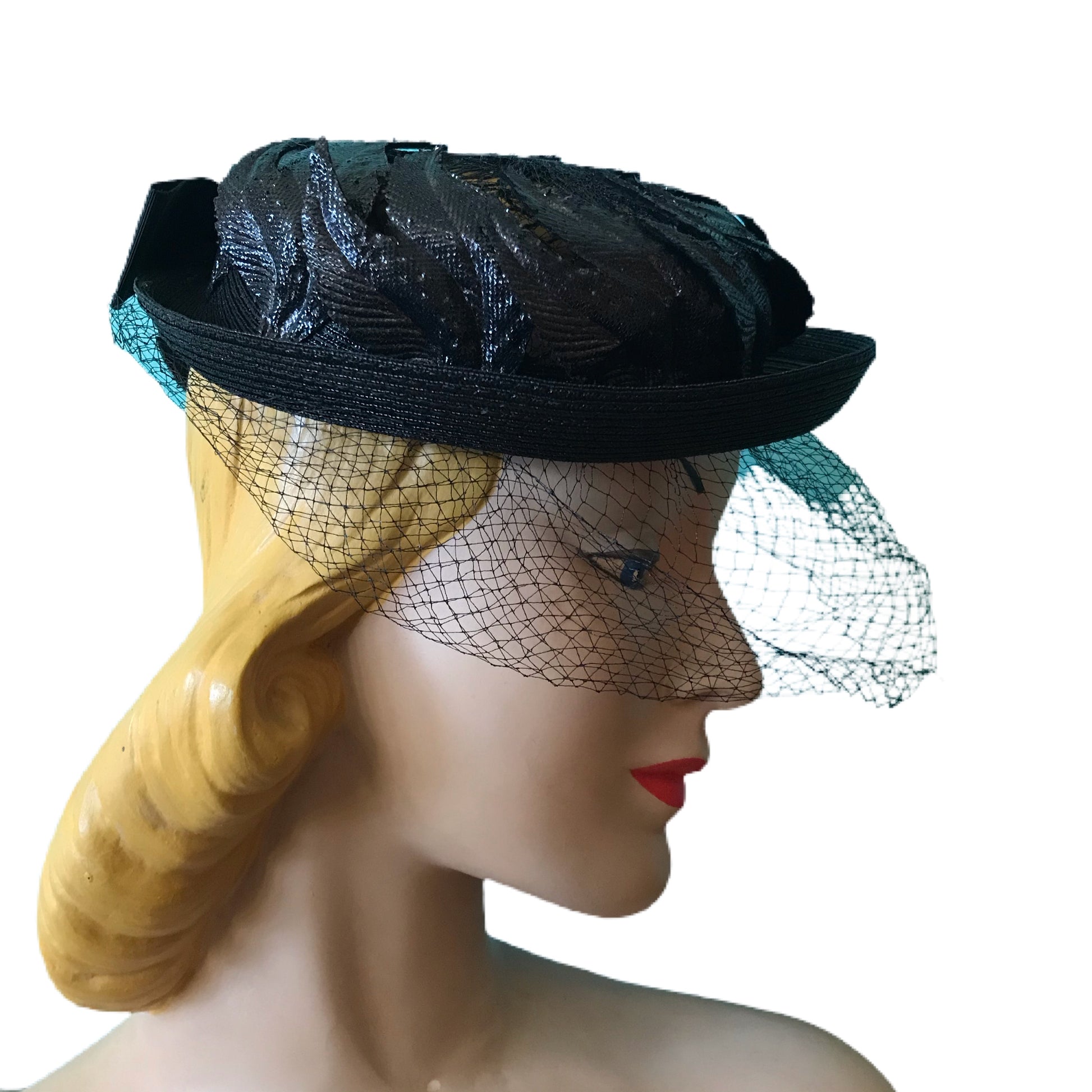 1960s black narrow brimmed hat with curved, flame shaped leaves around crown- open top has mesh insert. Veil around face is black (no blue- photo picked up my wall color!). By Miss Sally Victor, one size, no flaws.