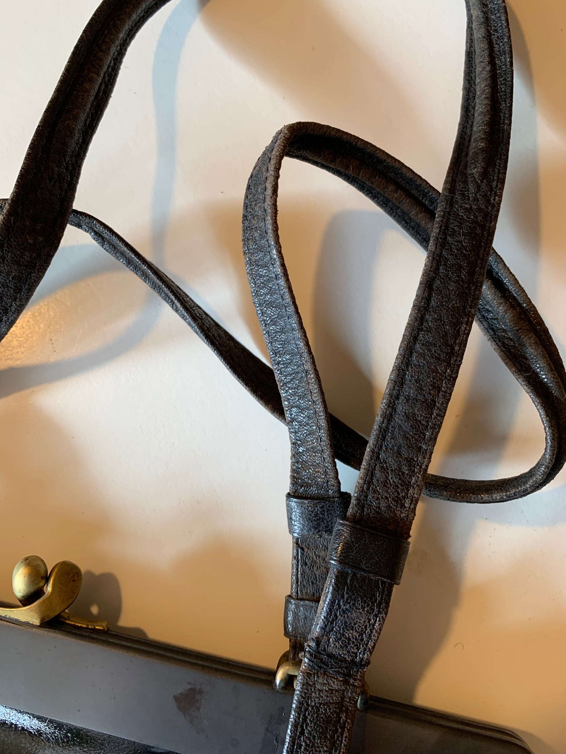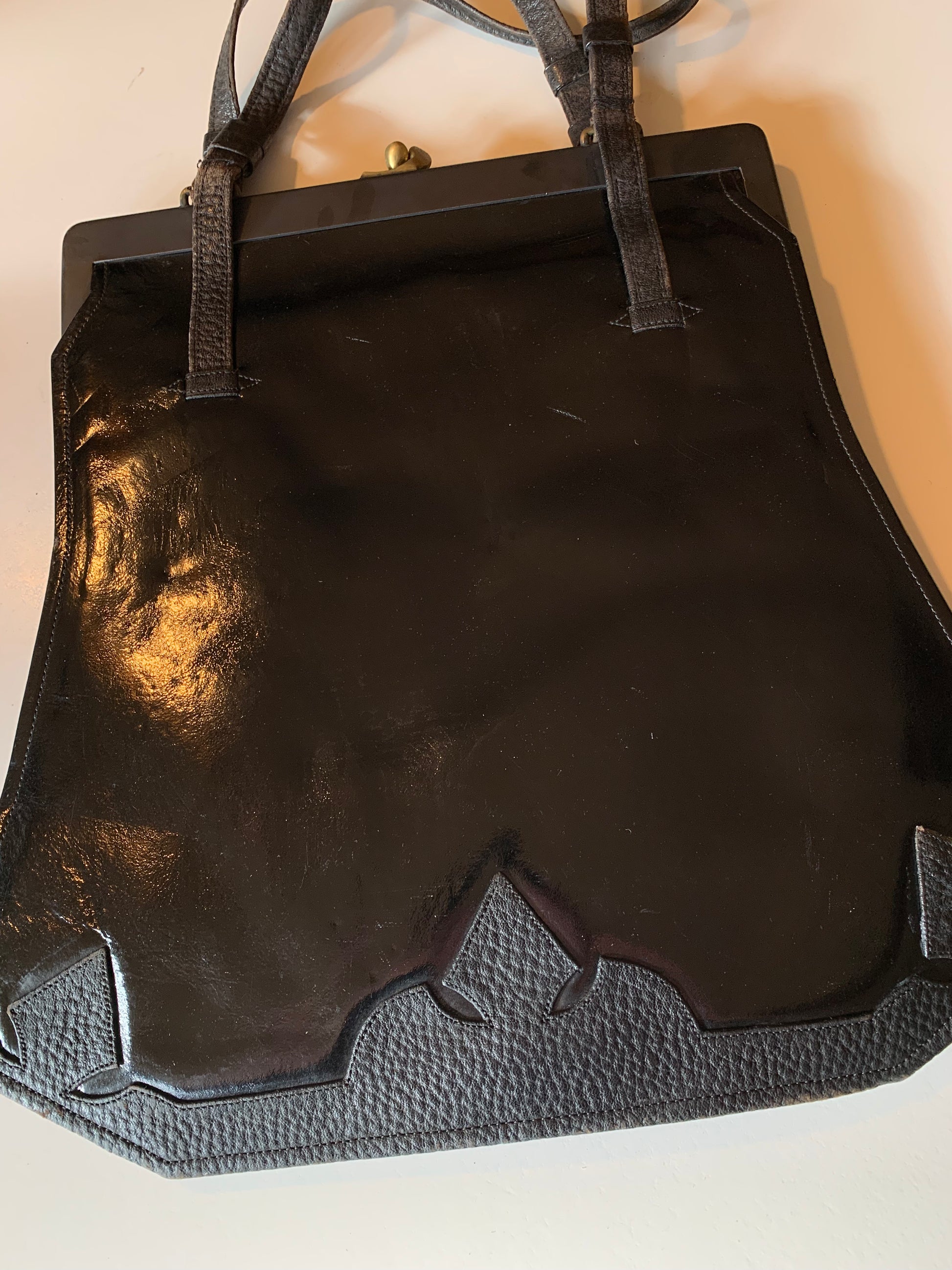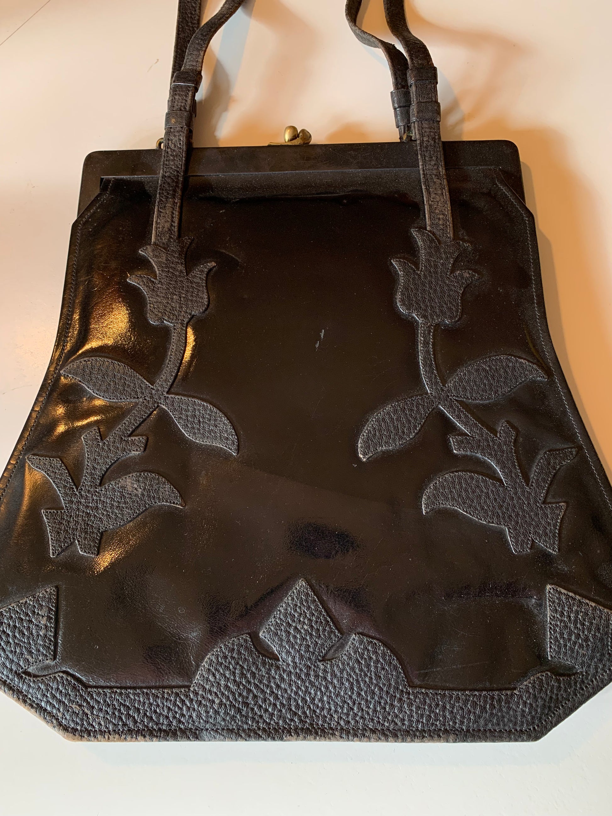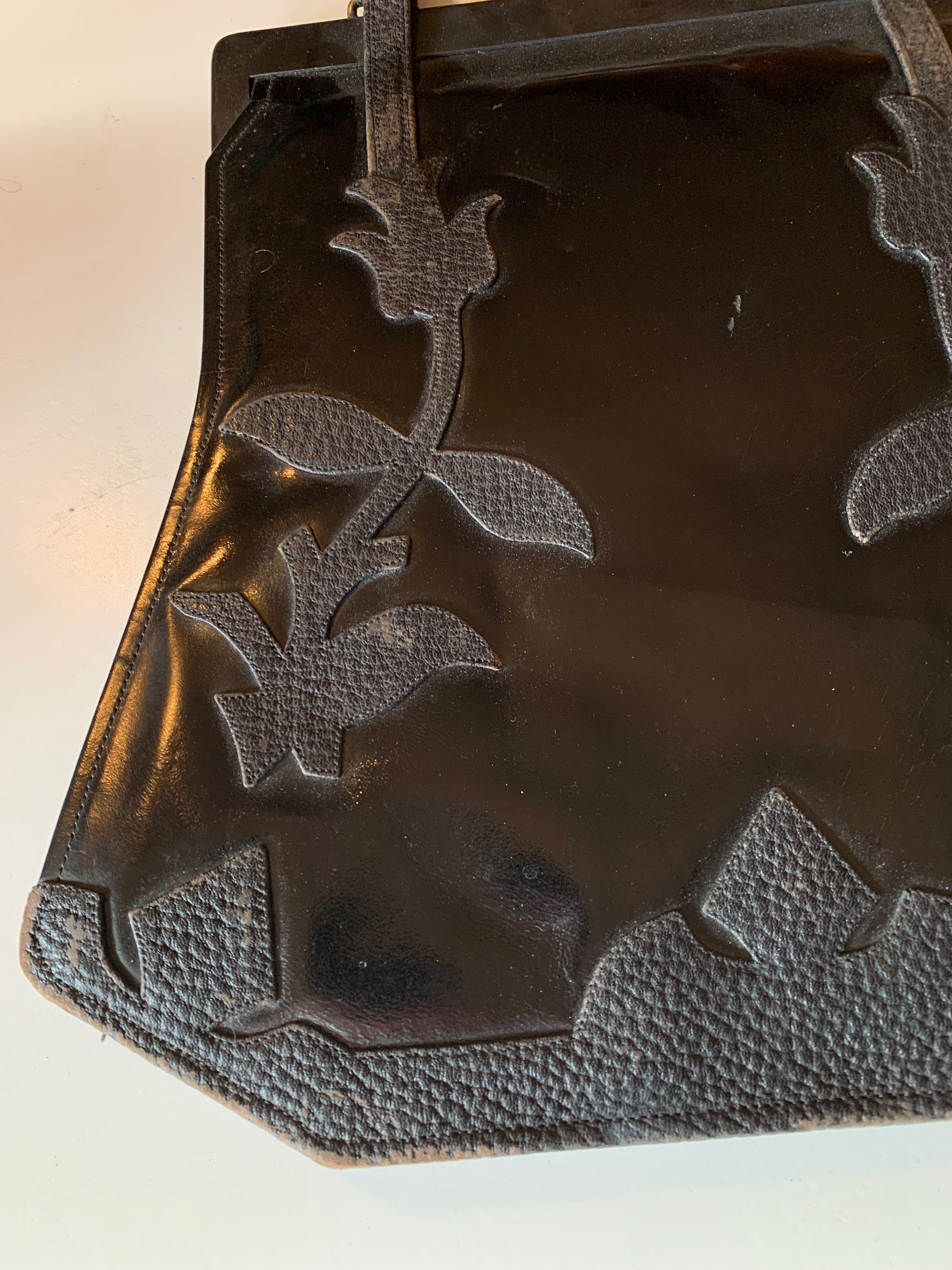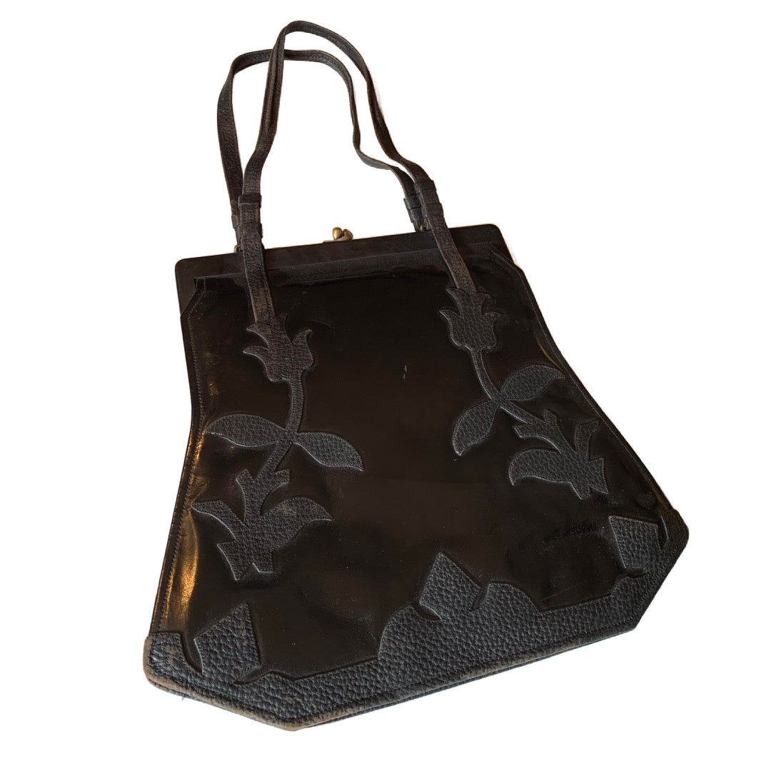 Large Black Patent Leather Handbag with Textured Leather Floral Design circa 1910s