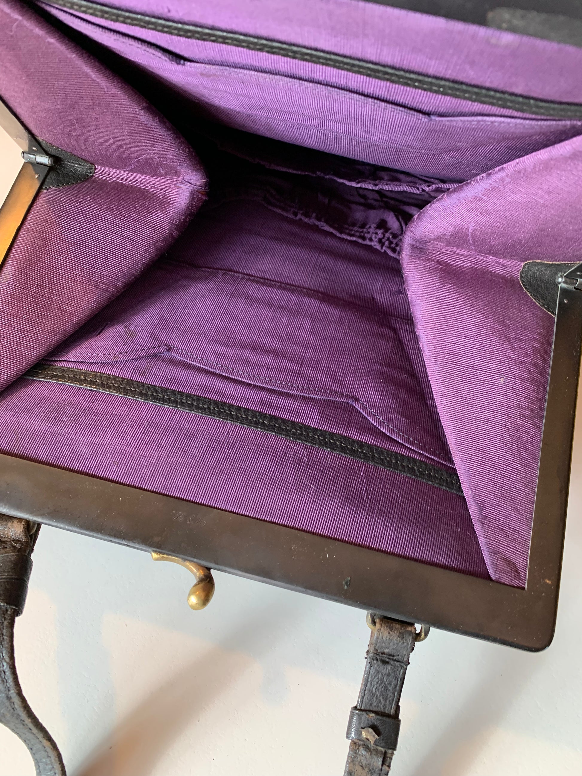 Amazing 1910s black patent metal frame handbag with textured leather floral vine design on front, matching handles. Elegant purple faille rayon interior with several pockets. Minor wear.