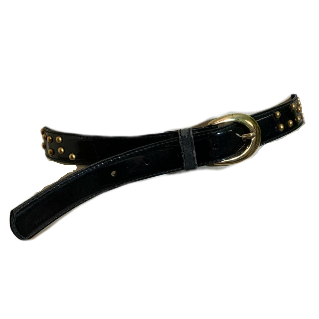 Black patent vinyl skinny belt from the 1980s with gold tone metal studs. No flaws.