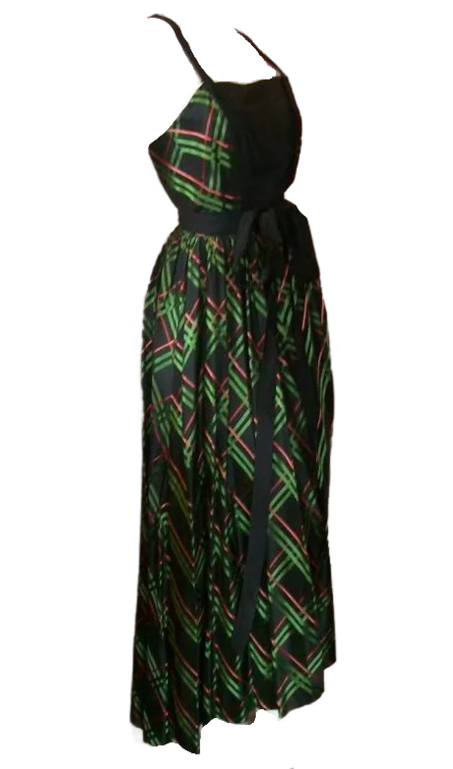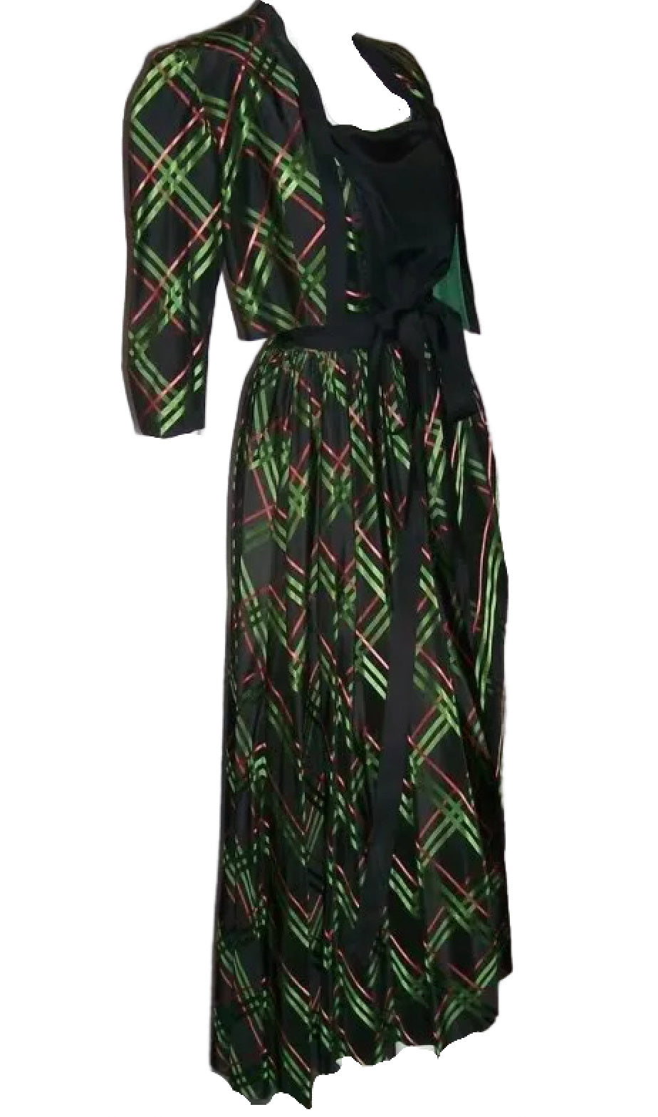 Black, Red and Green Shimmering Taffeta Dress with Bolero Jacket circa 1940s