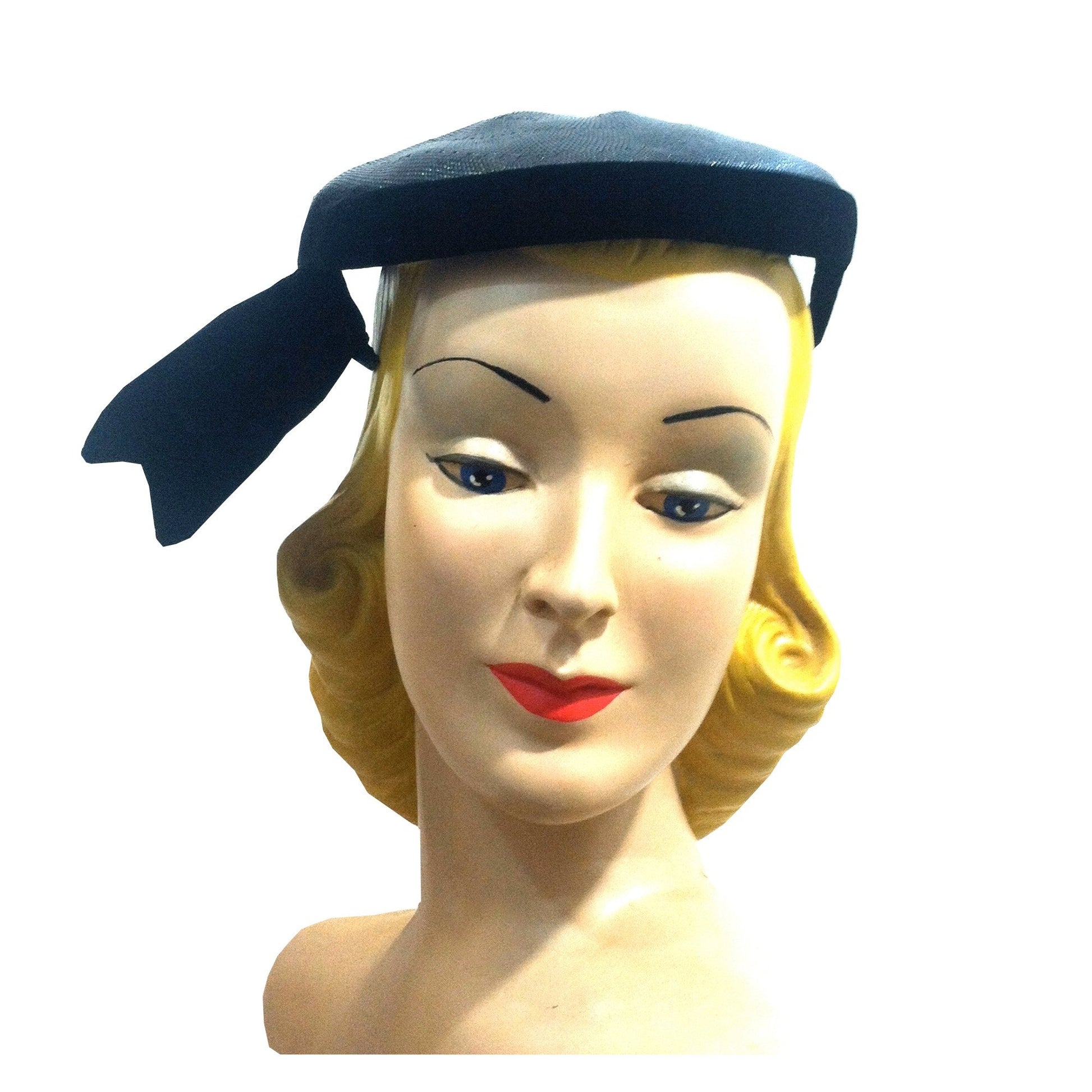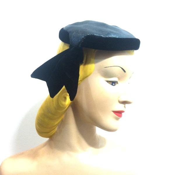 Black Sisal and Velvet Cocktail Hat with Side Tab circa 1950s