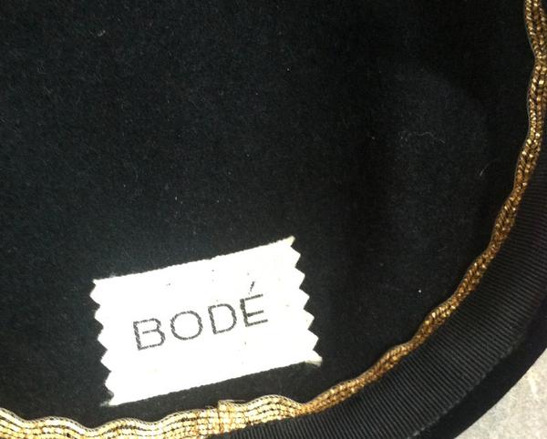 1950s black cocktail hat with sisal crown, velvet ribbon wrap and wired black velvet ribbon trim off to side. Black velvet trimmed clips secure to head. One size, no flaws. By Bodé.