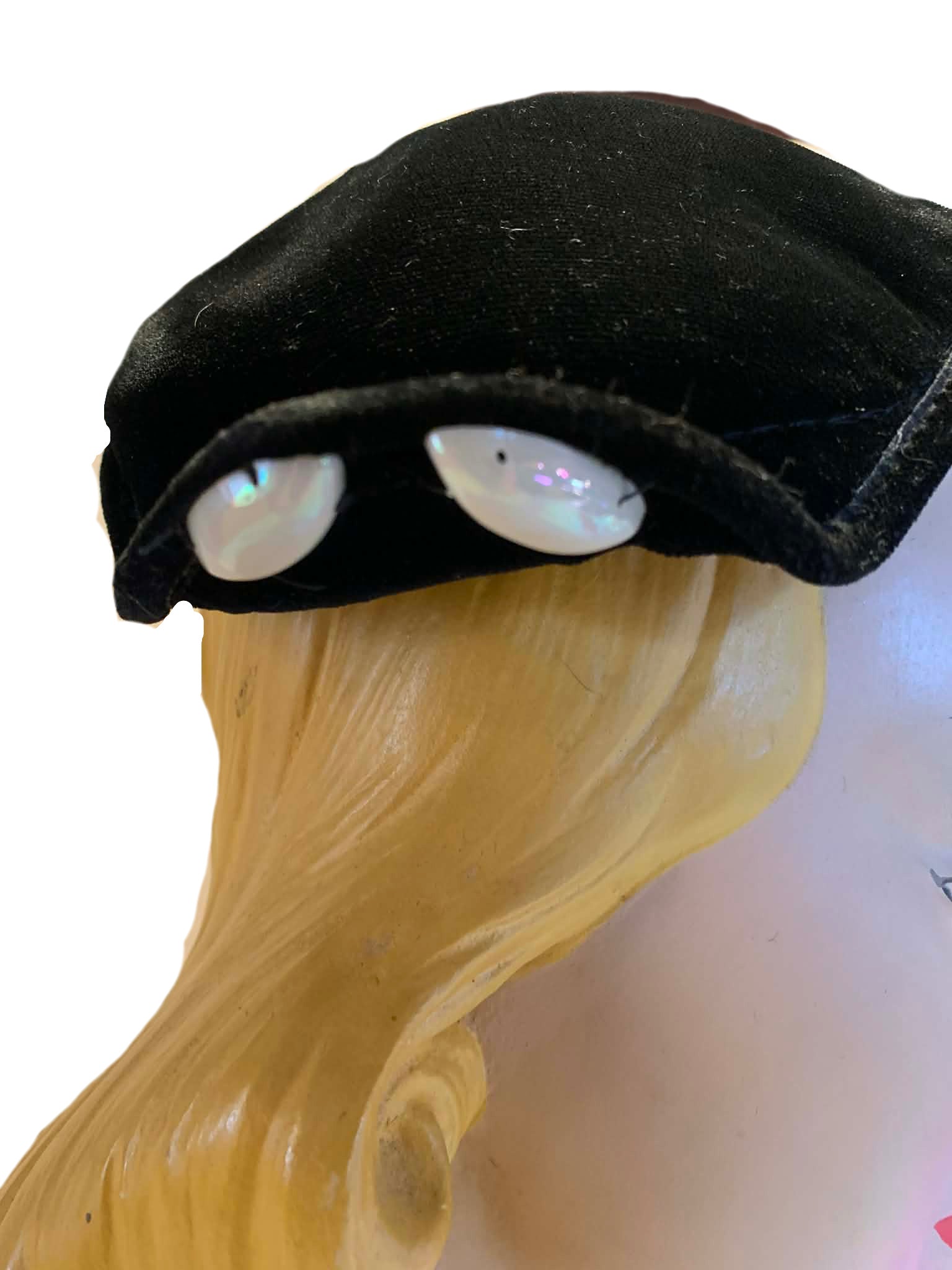 Black velvet 1950s hat with winged sides dotted with pearlescent bead. One size. No label, no flaws.
