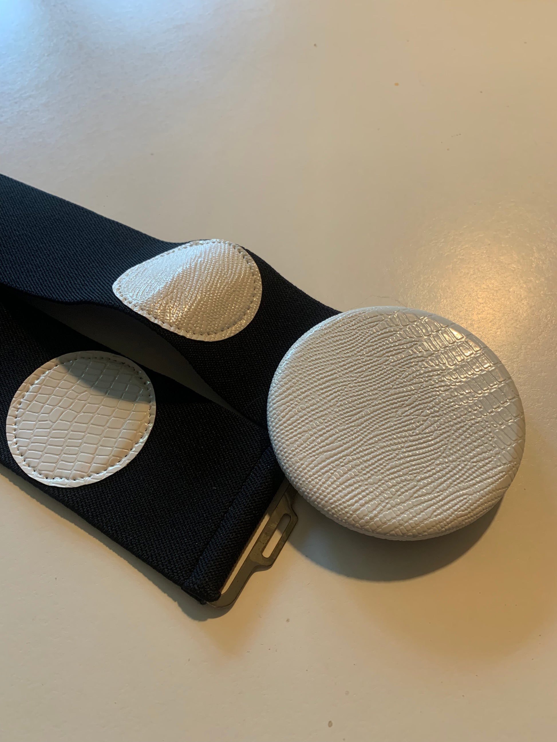 1980s black elastic wide belt with white vinyl polka dots and white circle clasp. 26-32" around, 2" wide