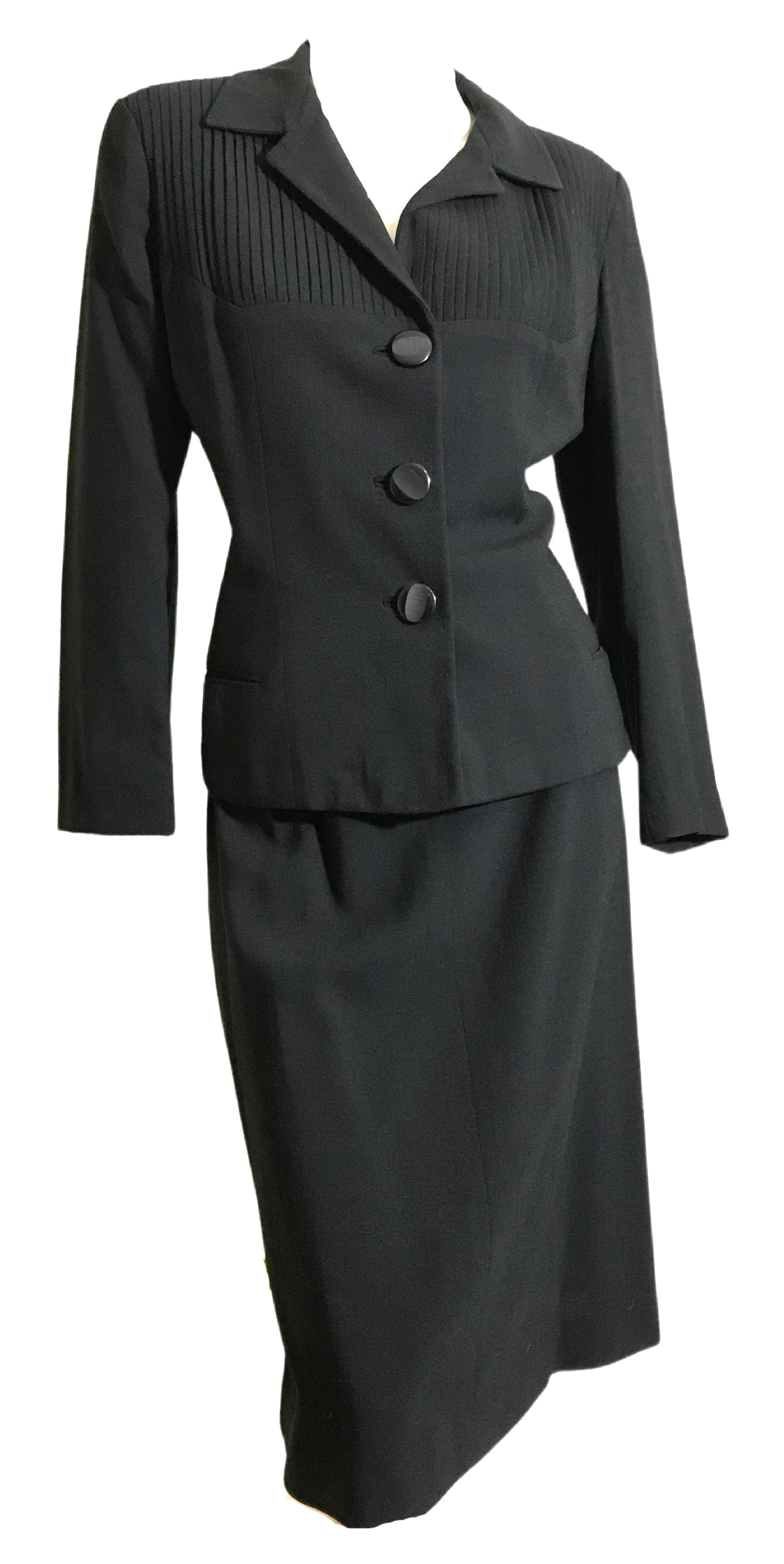 Black Wool Classic Suit with Pleated Accents circa 1950s