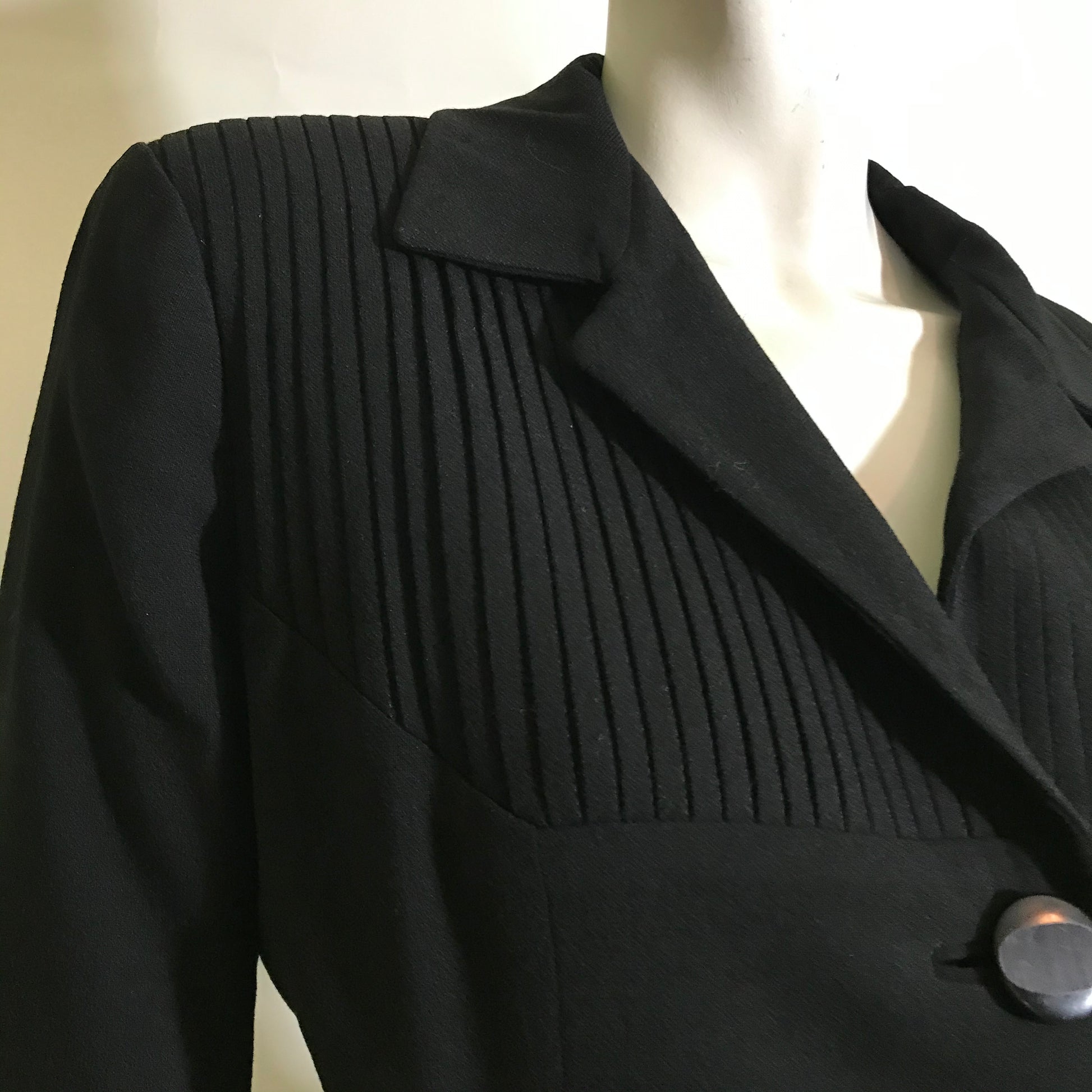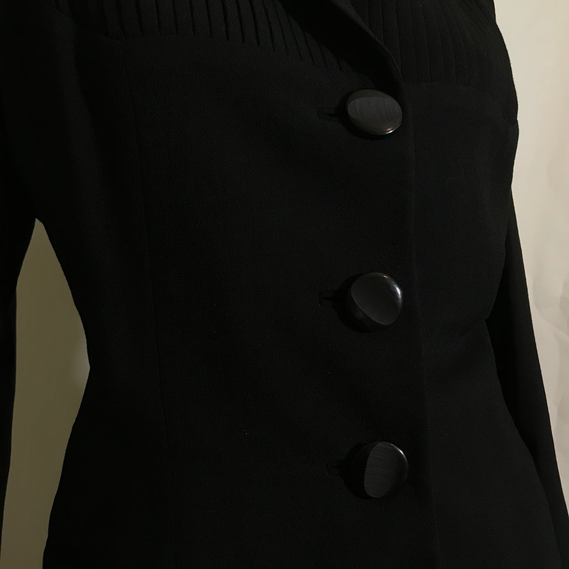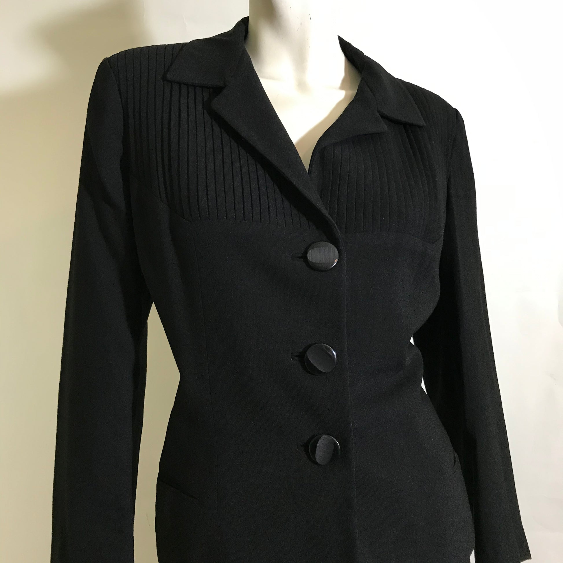 1950s black wool classic suit with pleated accents on bodice of jacket. Side metal zip on skirt, lined, no label. No flaws.