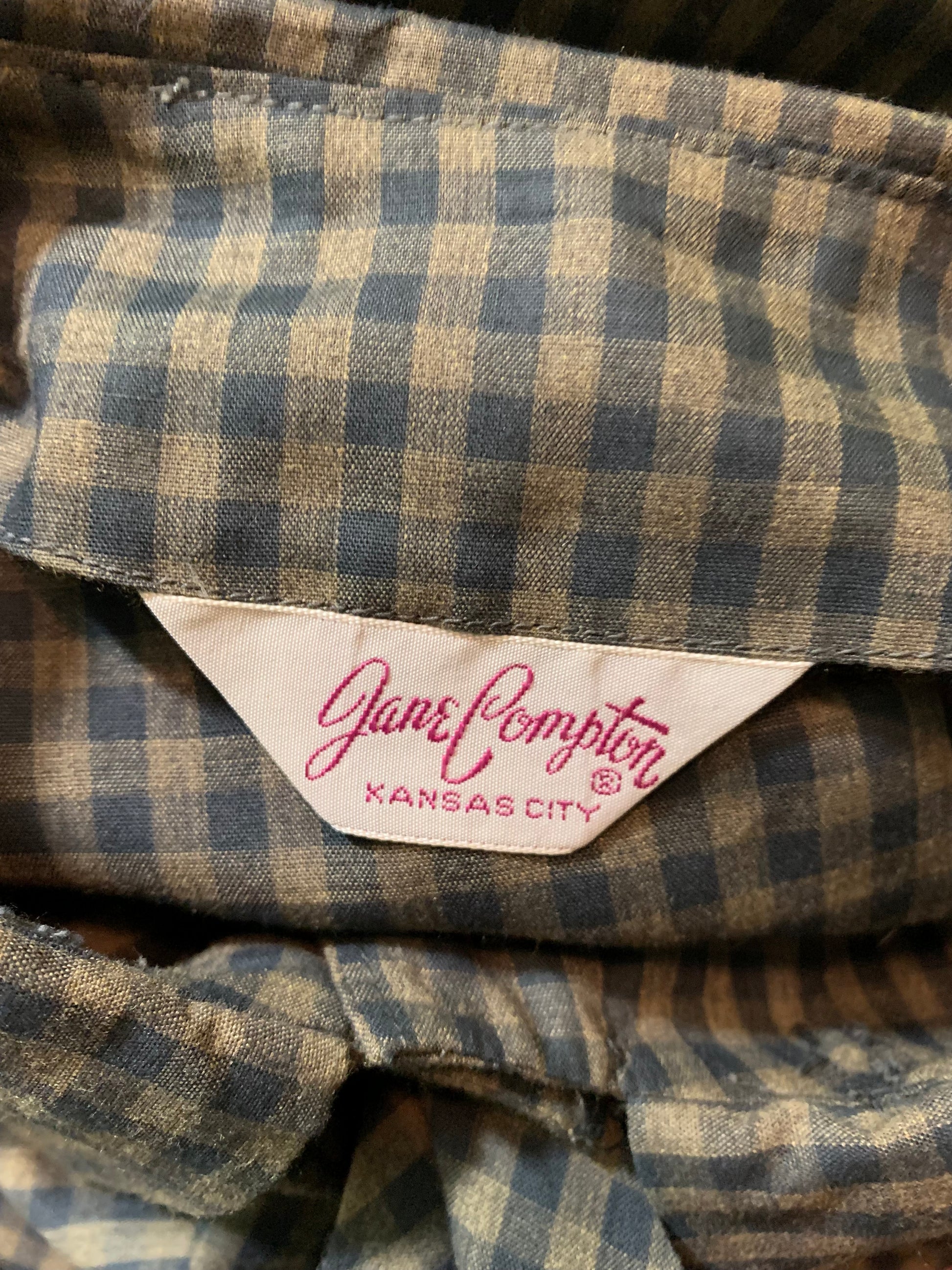 Blue and tan gingham checked cotton 1960s dress with full skirt, round collar and big bow at neckline. Back zip. No flaws.
