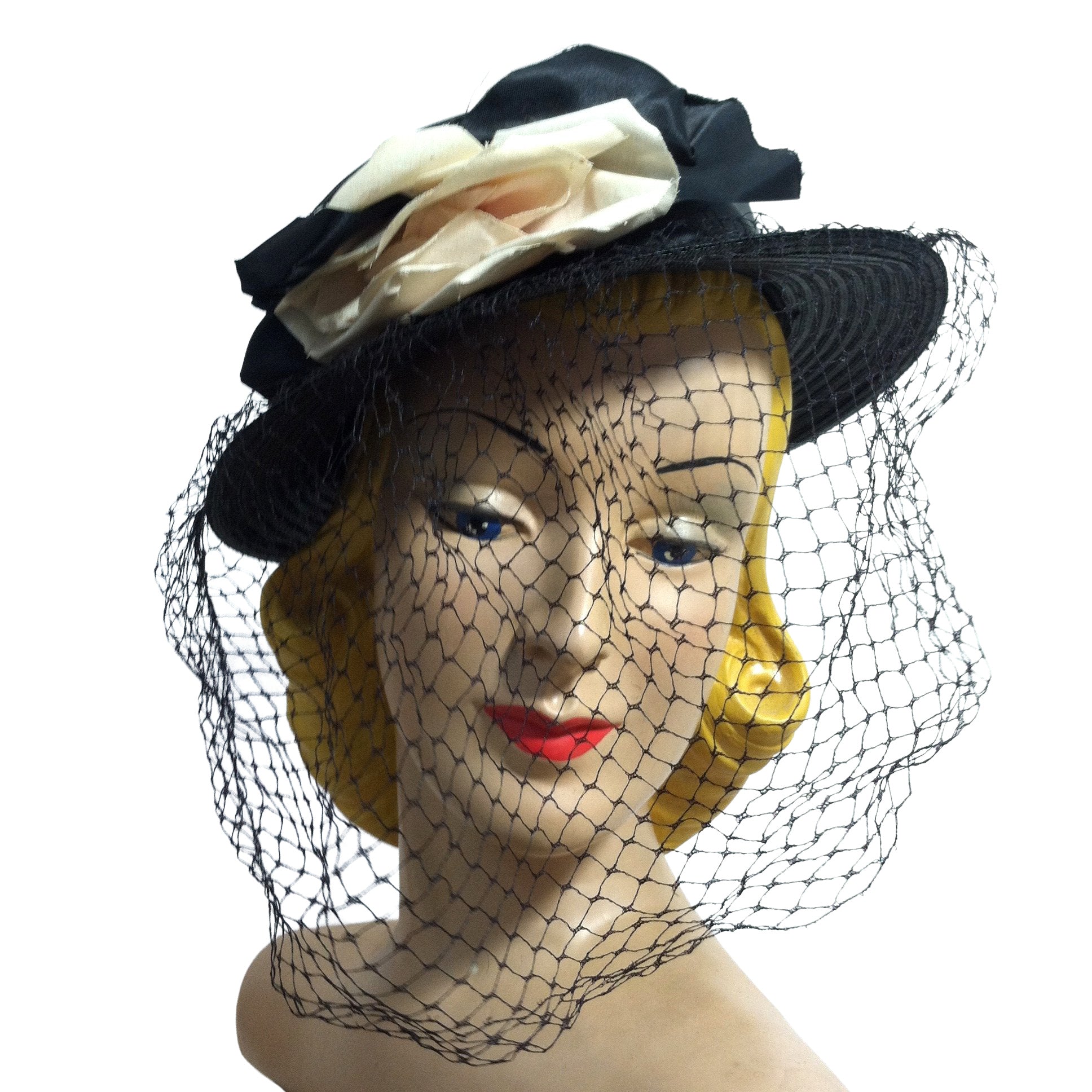 Blush Rose Black Hat w/ Dramatic Veil circa 1940s