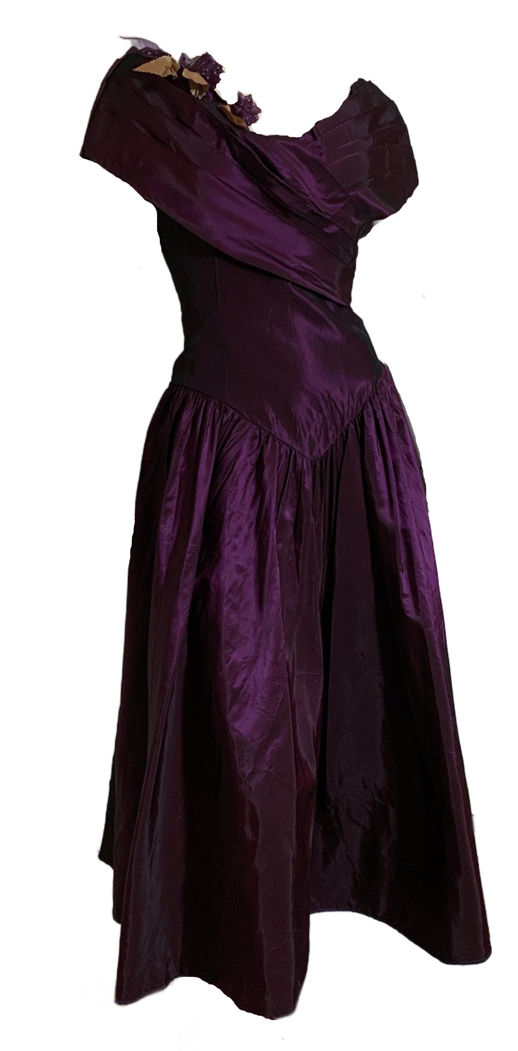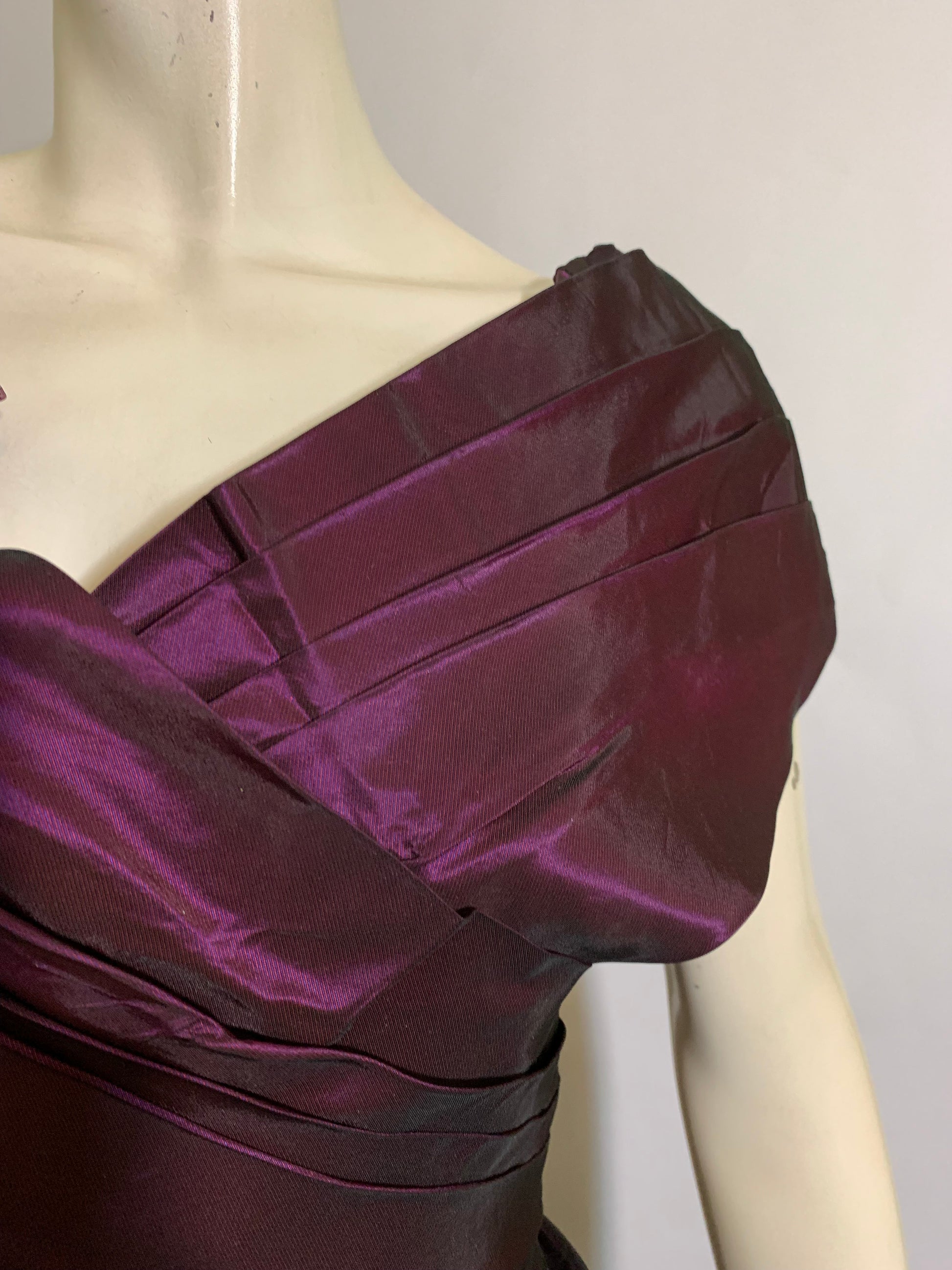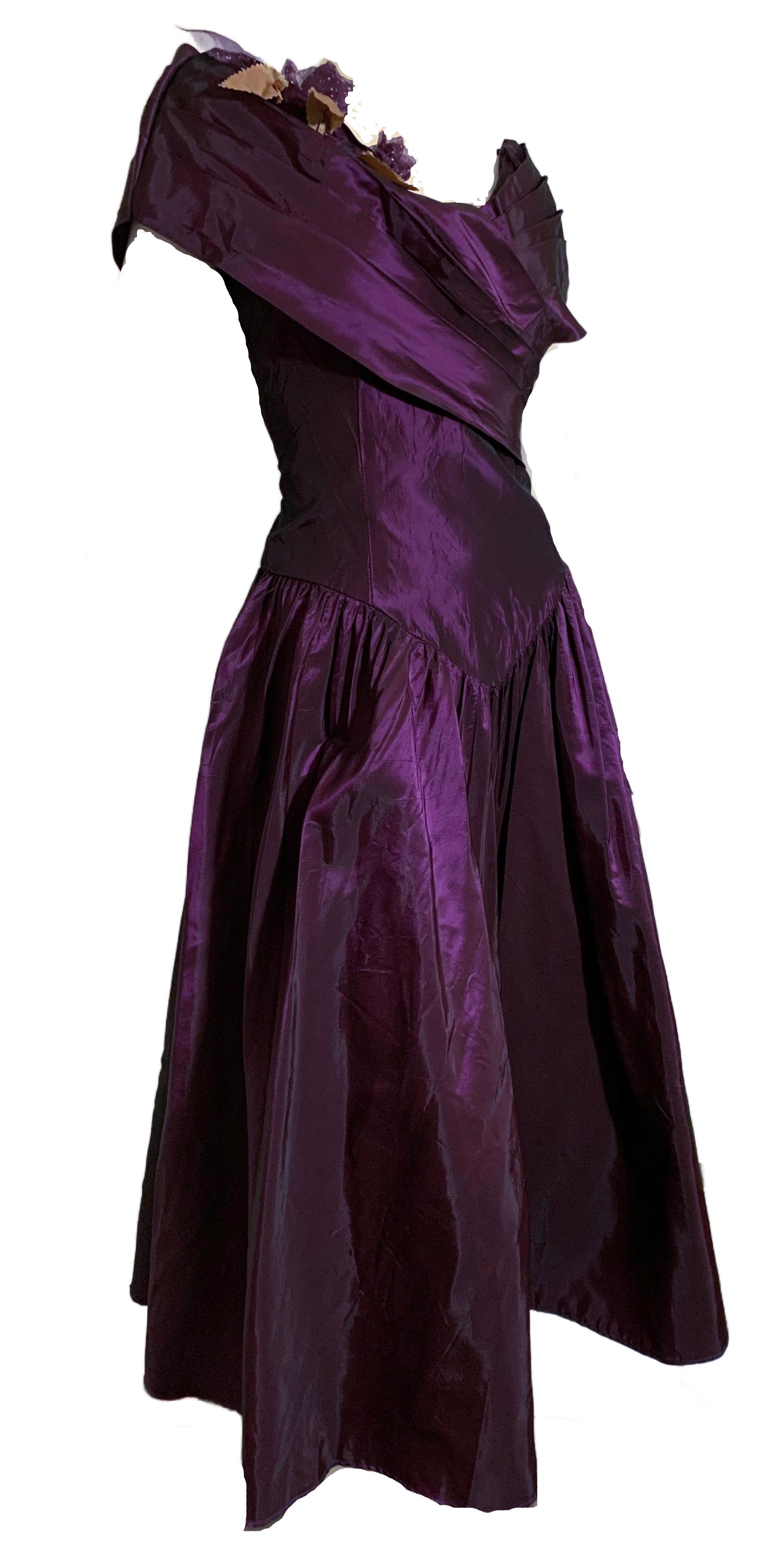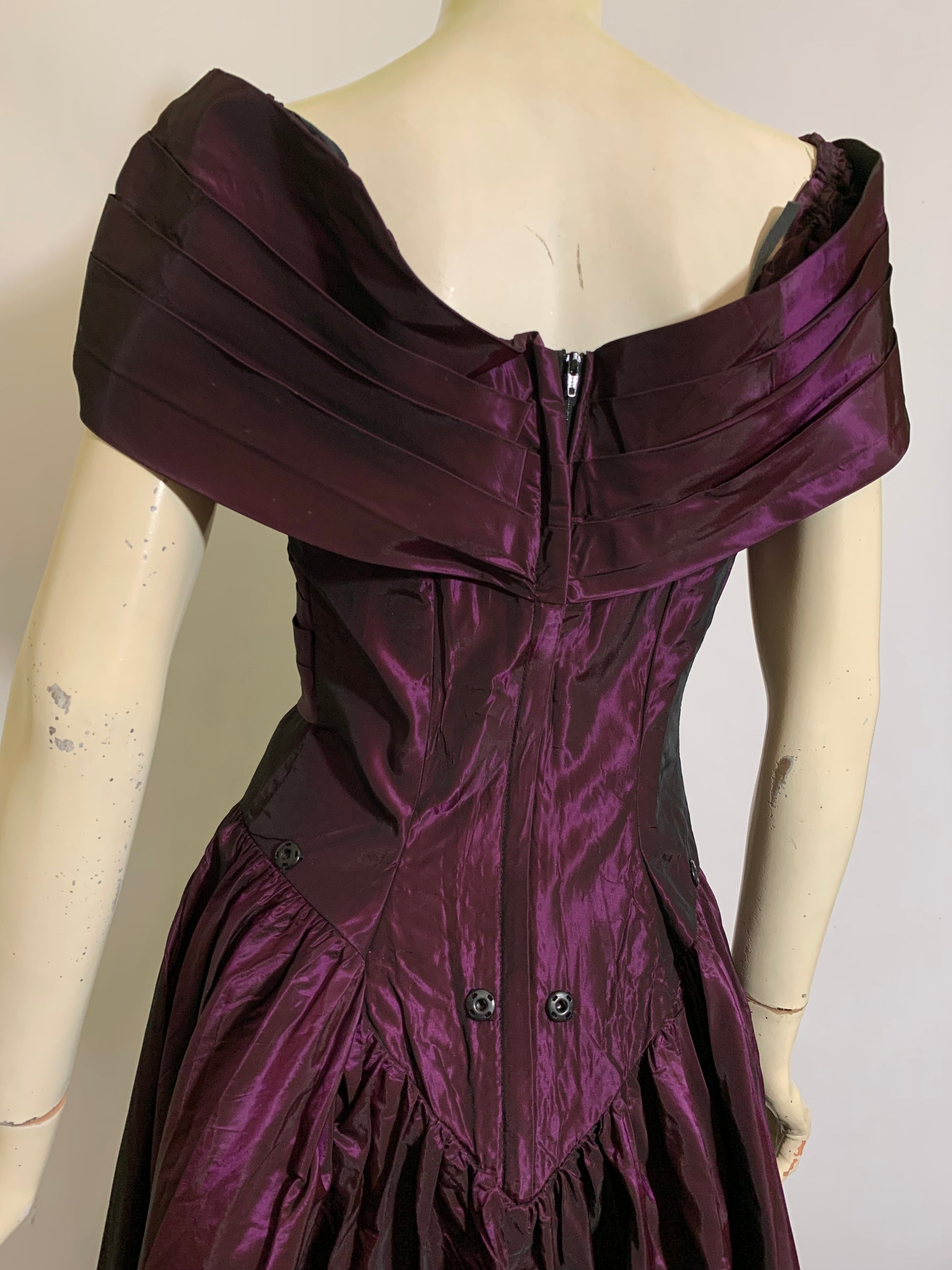 Luxe changeable taffeta purple 1980s party dress with pleated portrait collar, basque waist, full skirt. Tulle flowers on neckline, back zipper. Has snaps on back that likely held a big bow- can be removed, or a bow could be made to add on. Minor wear. Unlined.