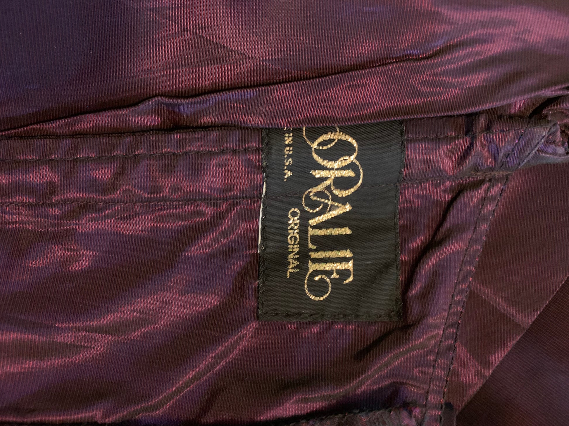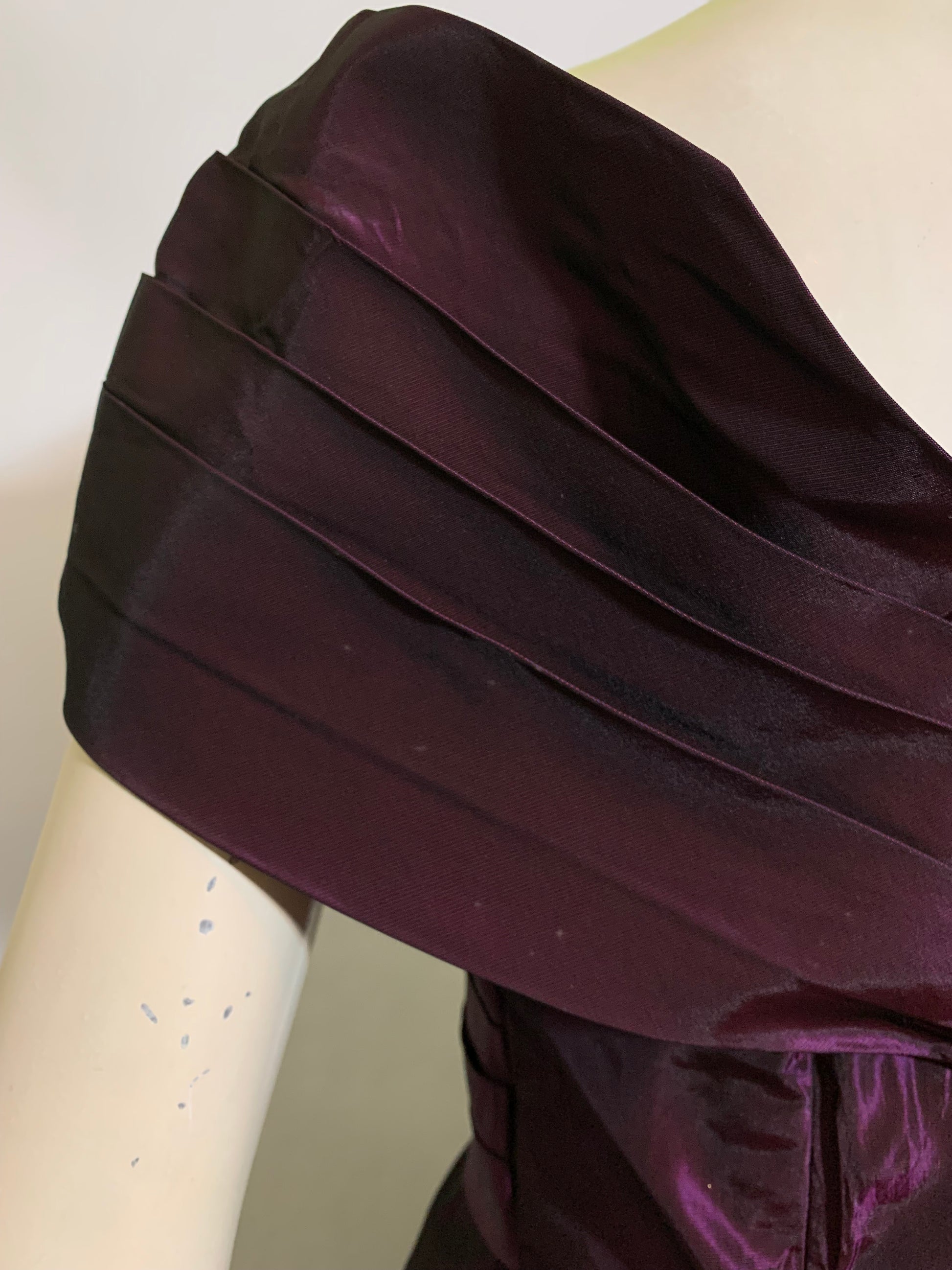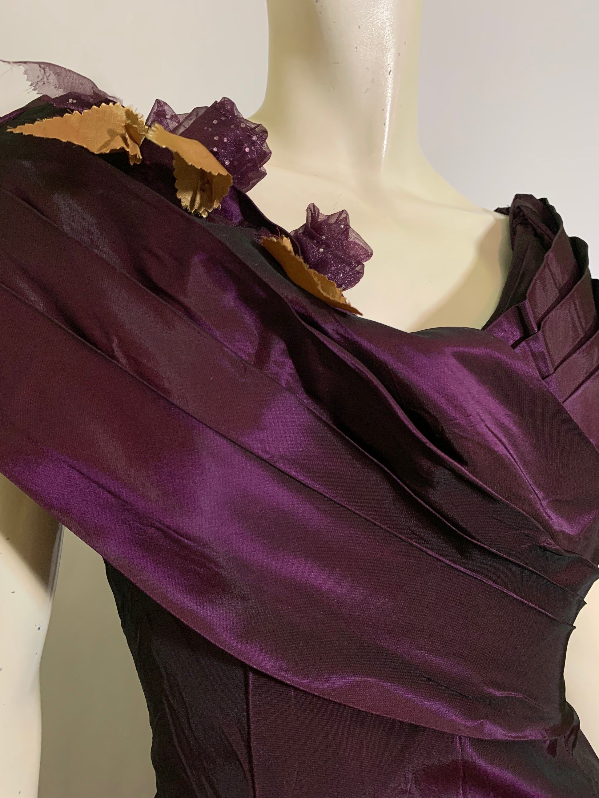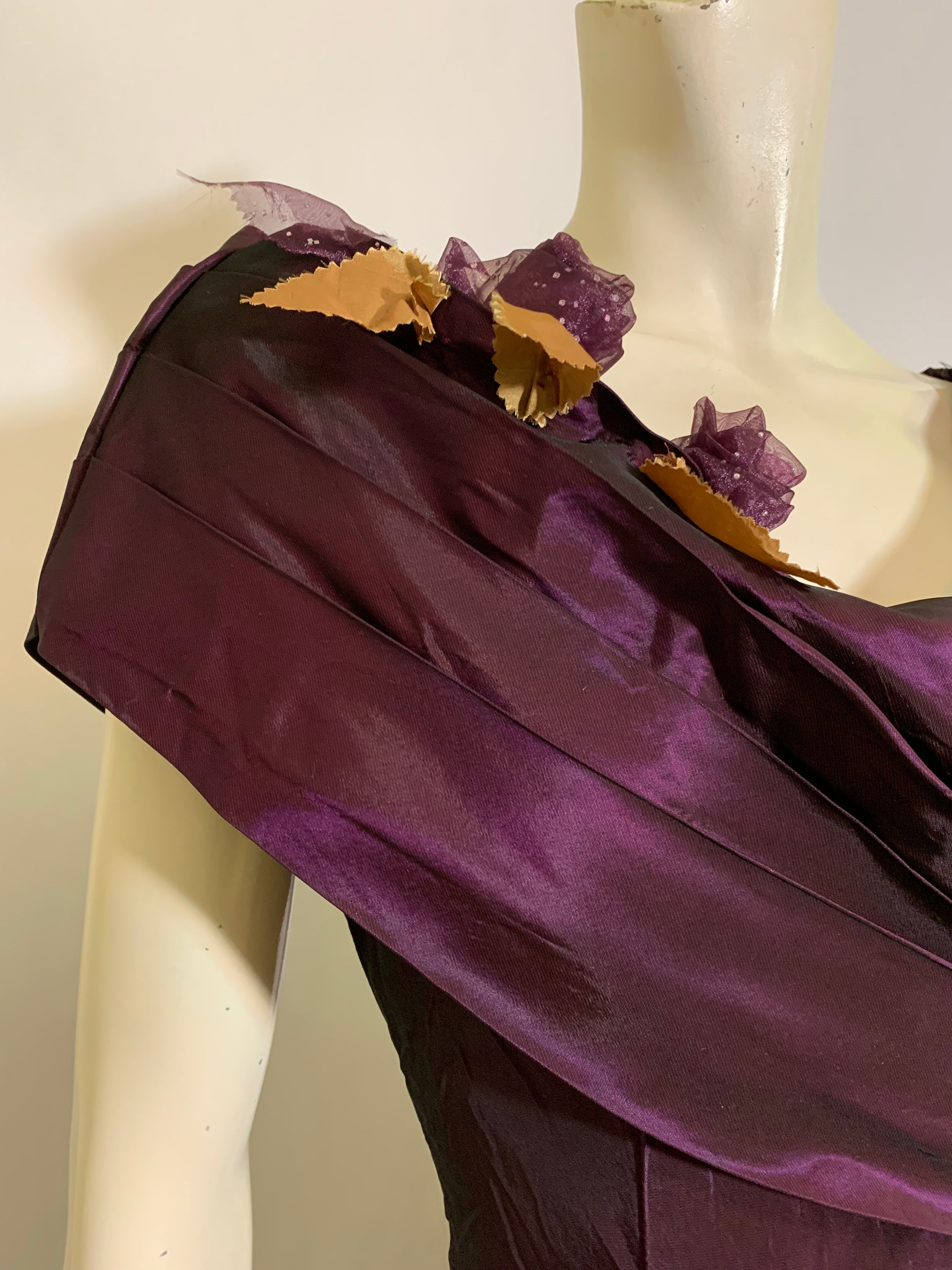 Luxe changeable taffeta purple 1980s party dress with pleated portrait collar, basque waist, full skirt. Tulle flowers on neckline, back zipper. Has snaps on back that likely held a big bow- can be removed, or a bow could be made to add on. Minor wear. Unlined.
