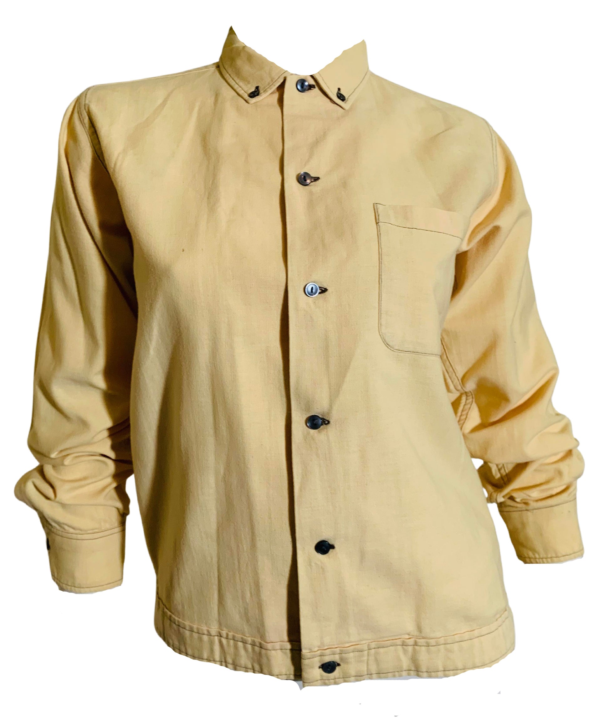 1960s butter yellow canvas cotton button front shirt-jac. Button down collar, cuffs and sides of waist. Extra buttonholes added at sides.