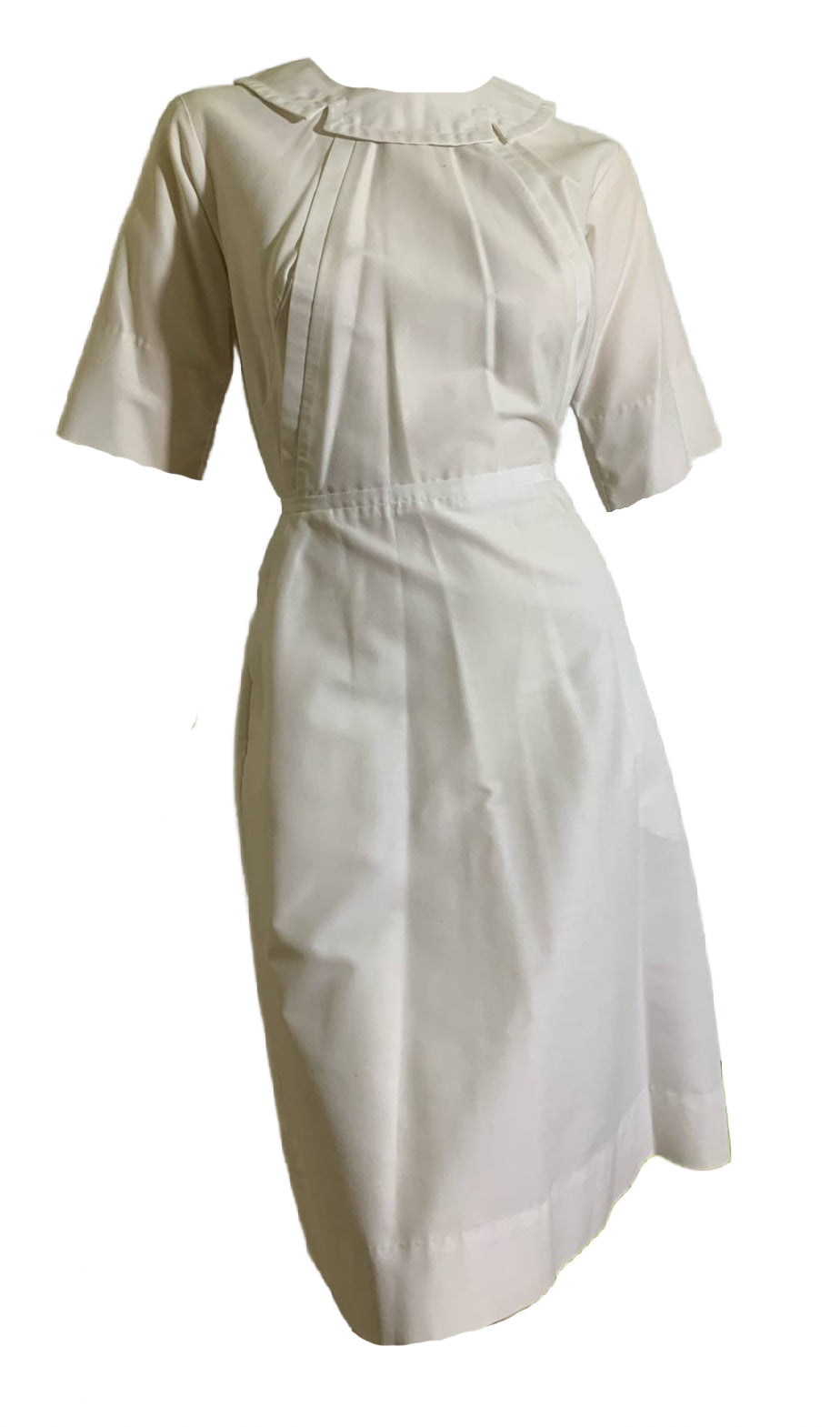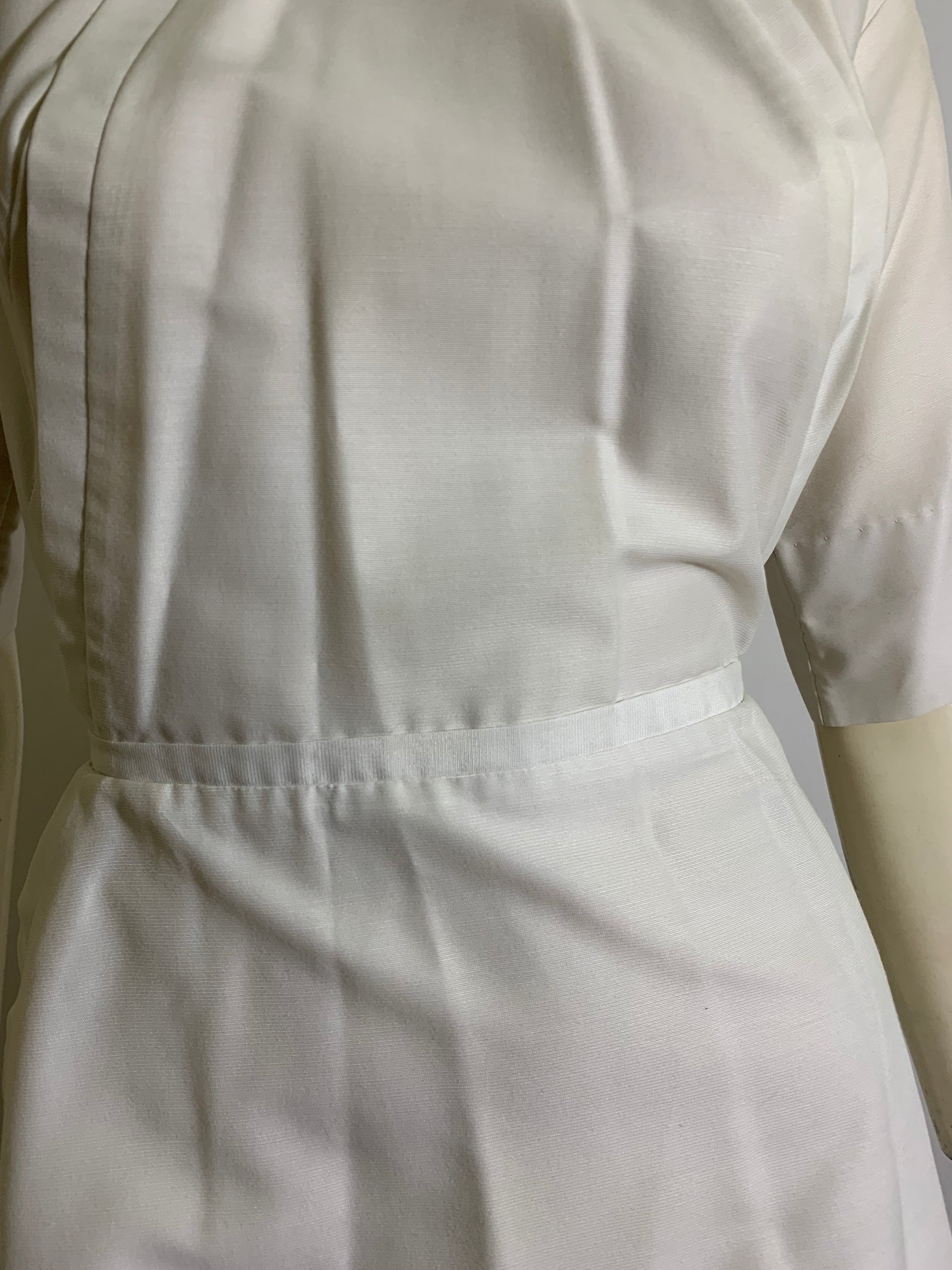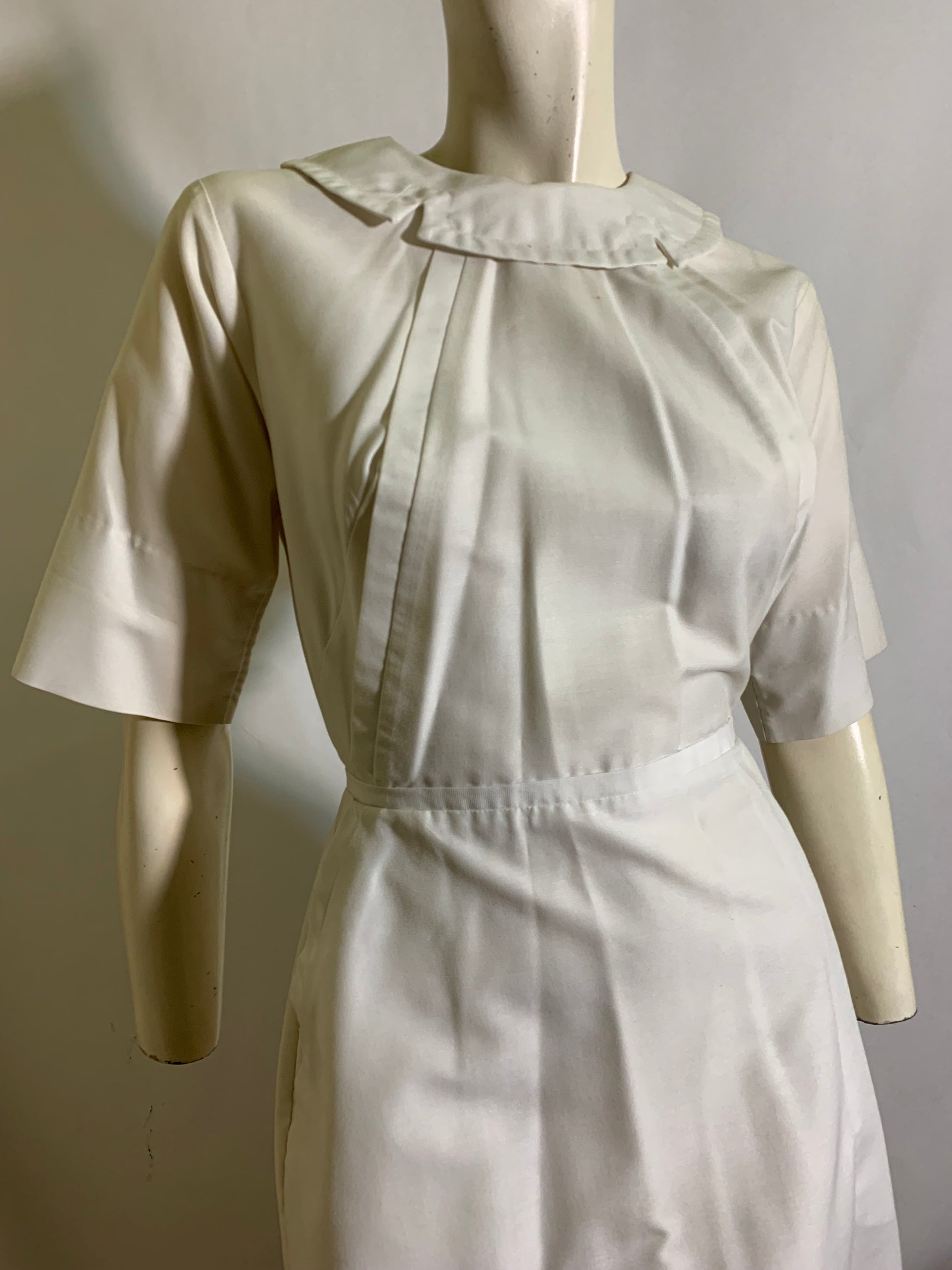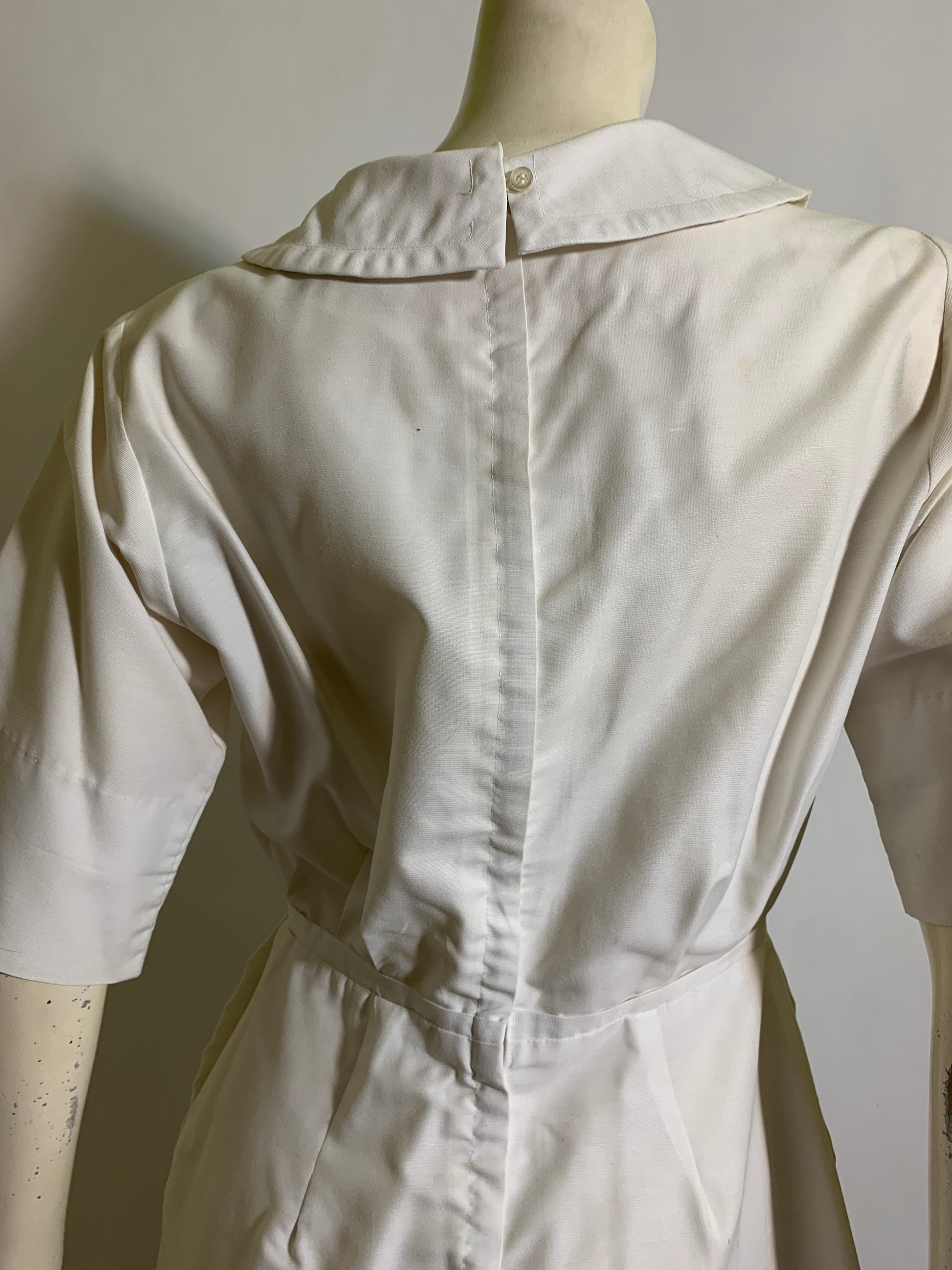 1960s white cotton blend button back nurse dress by 24 Hour Duty. Some discoloration, as is.
