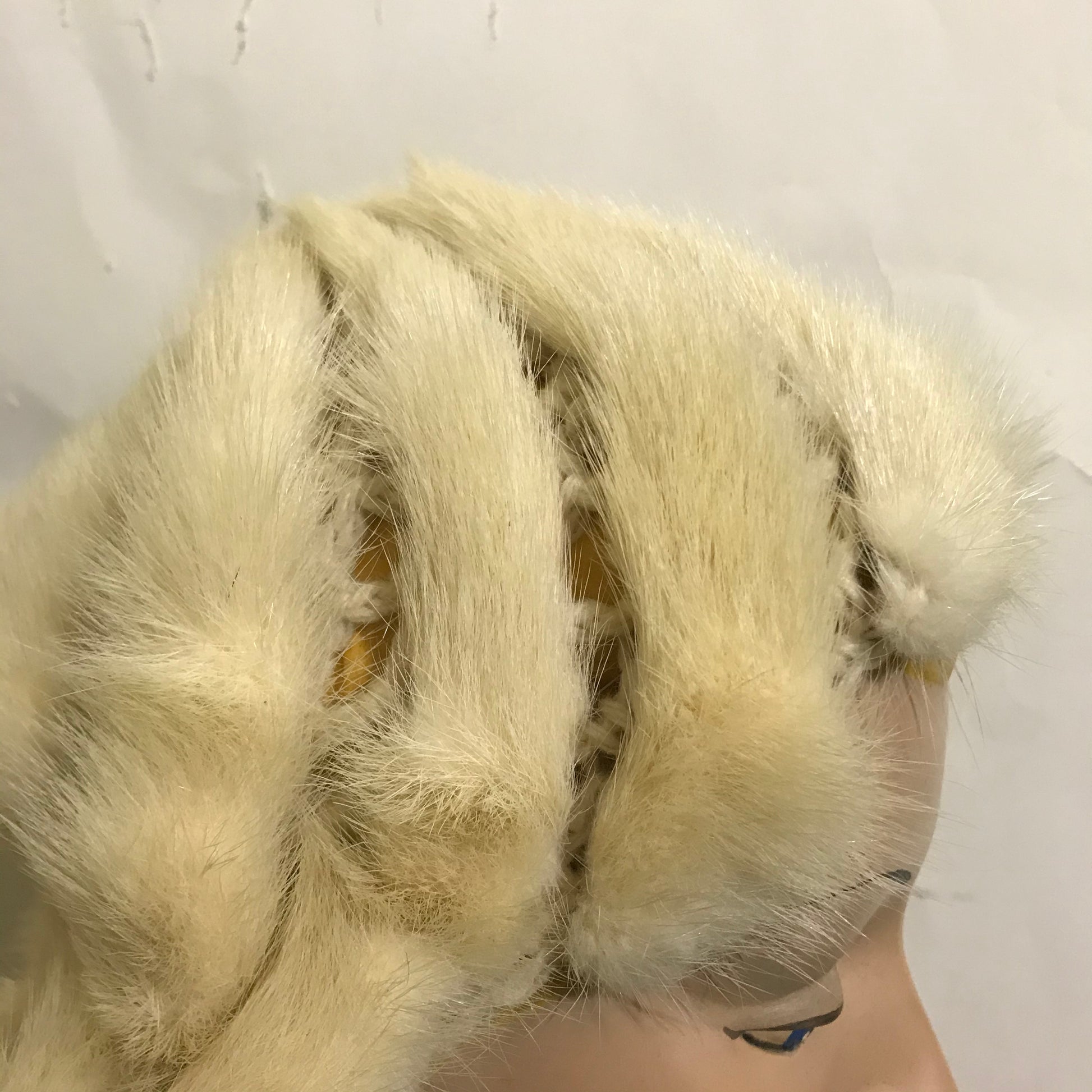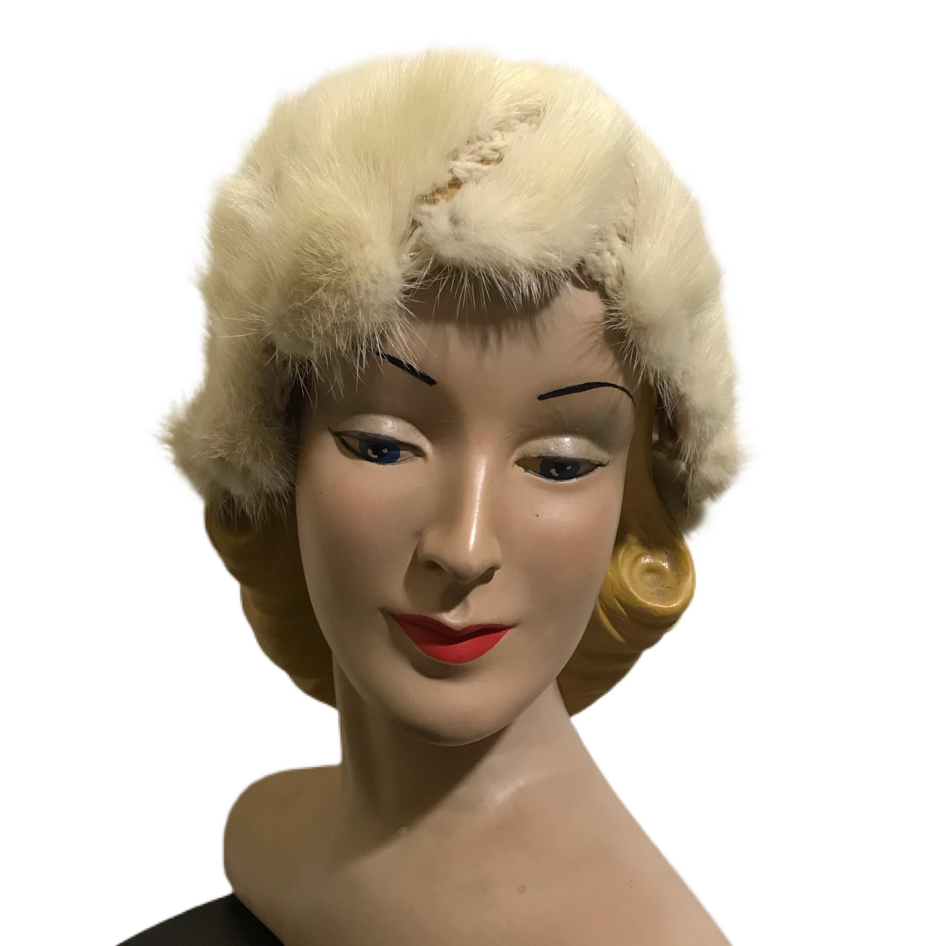 1940s cafe au lait wool crochet fitted cap with spiraled mink tails! Whimsical and sweet. No flaws, one size.