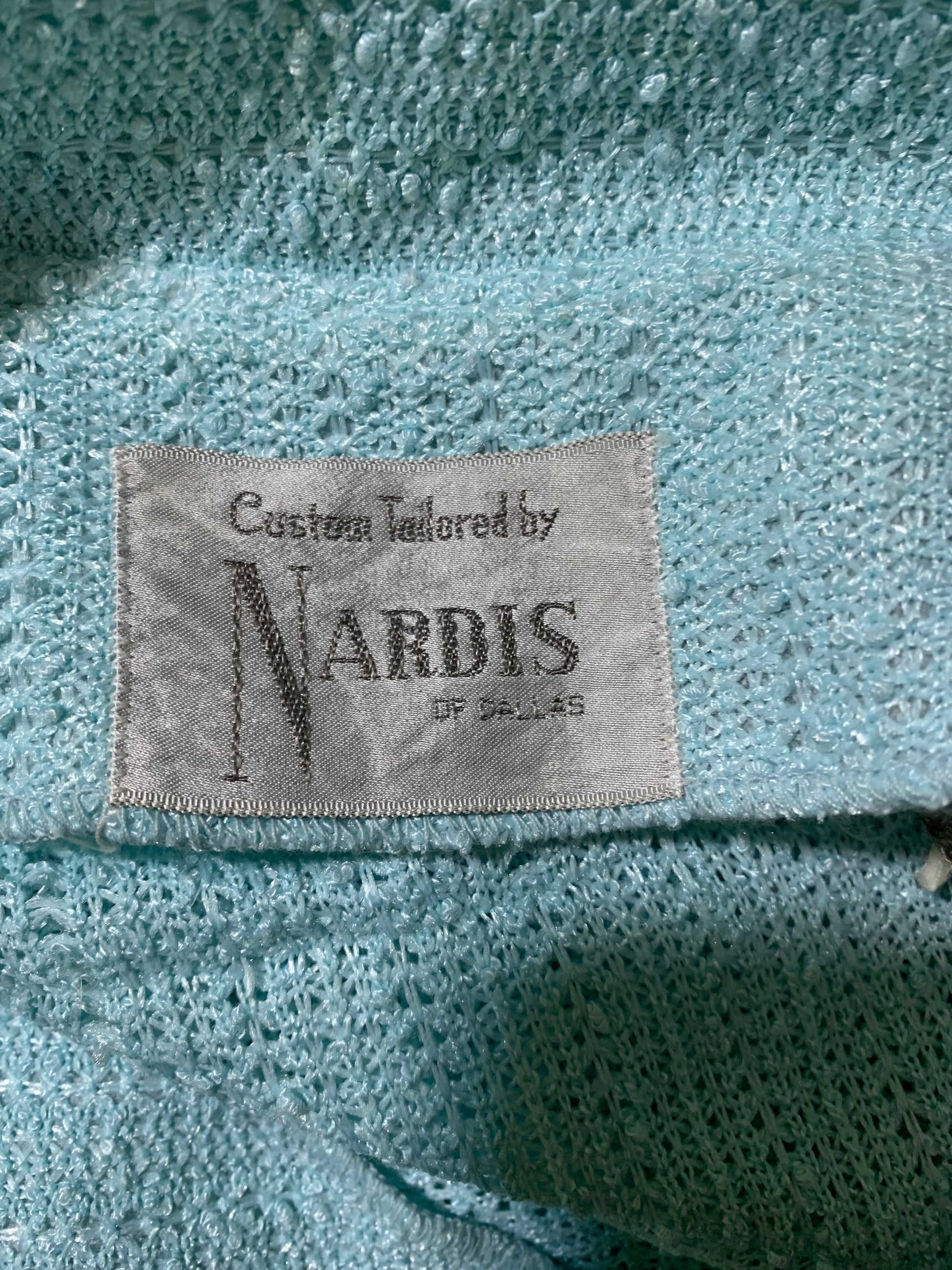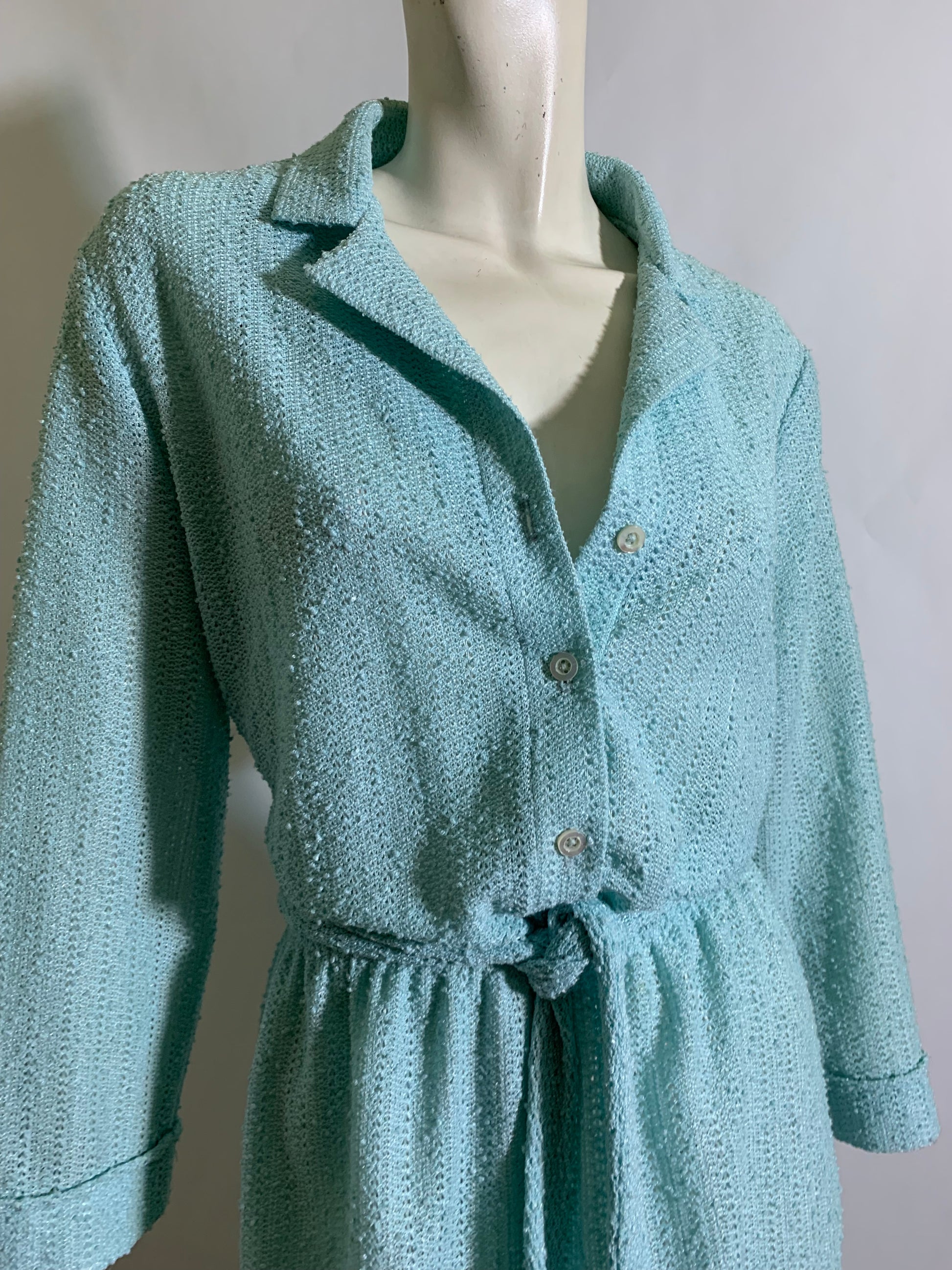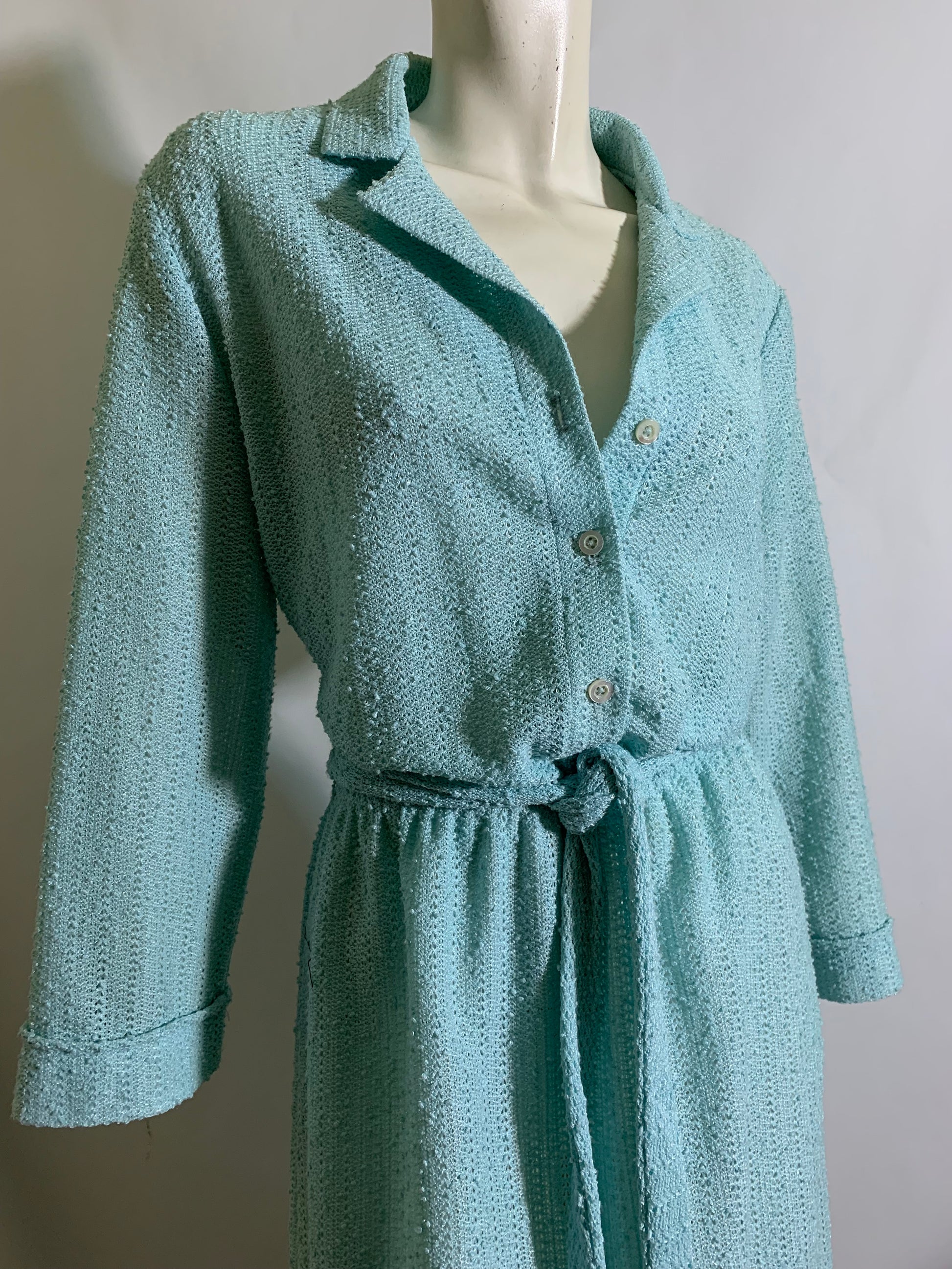 1970s textured knit rayon Carolina blue shirt dress with sash, button up blouson bodice. Elastic waist. From Nardis of Dallas. No flaws. Would look fantastic with brown boots and hat!