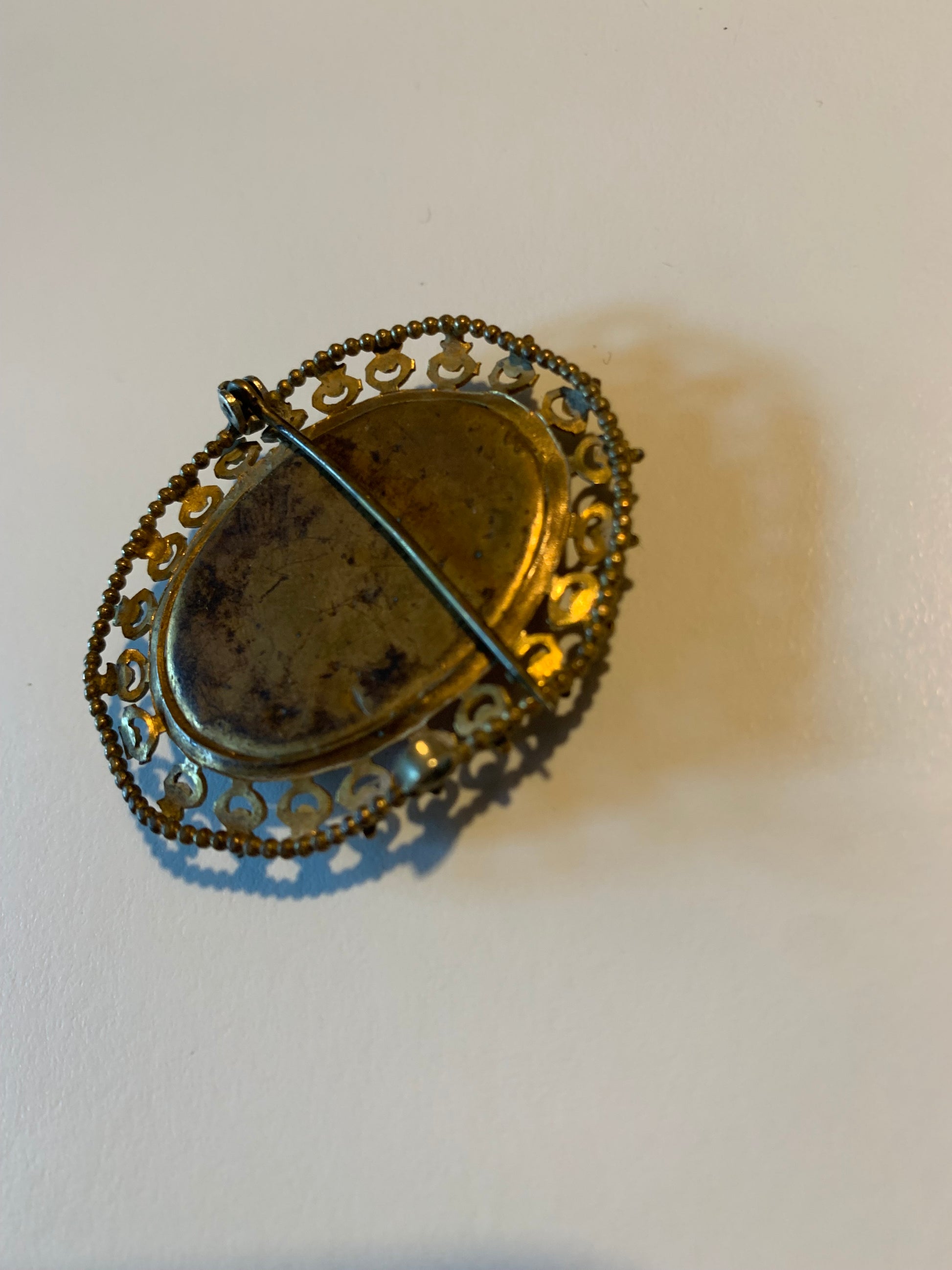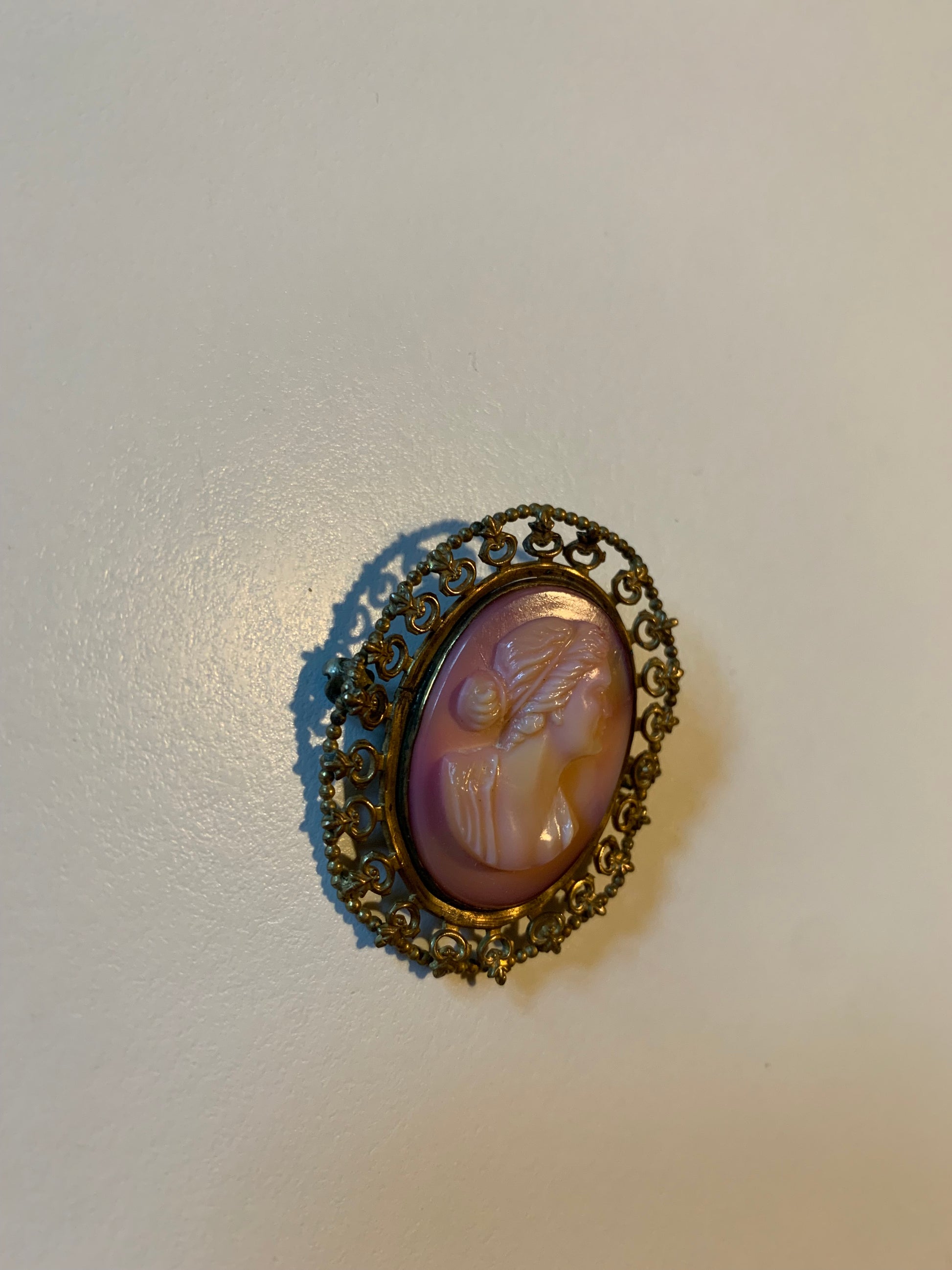 Early 1900s pink carved cameo lady portrait with filgree gold tone metal brooch, C-clasp. Minor wear, no markings.