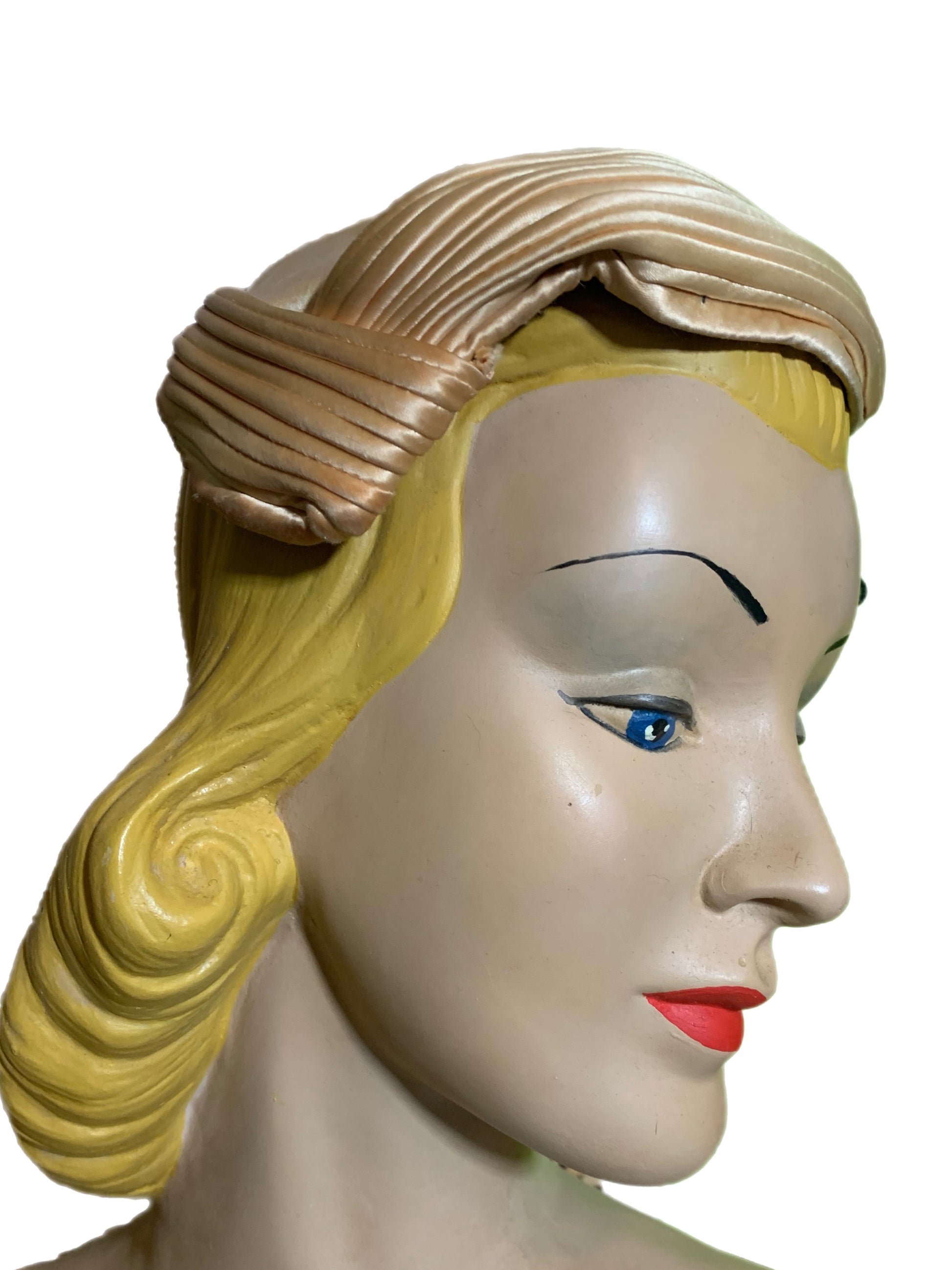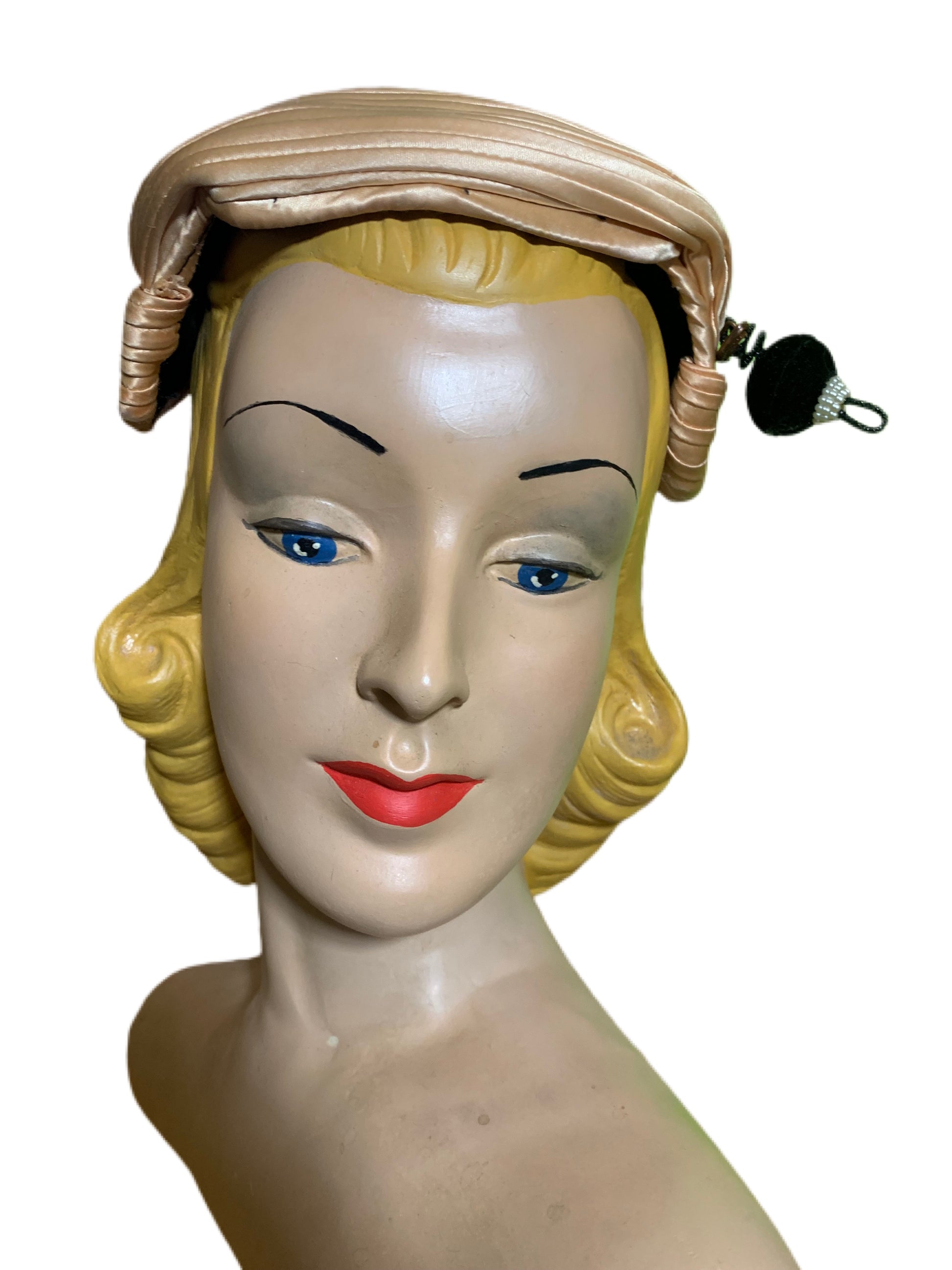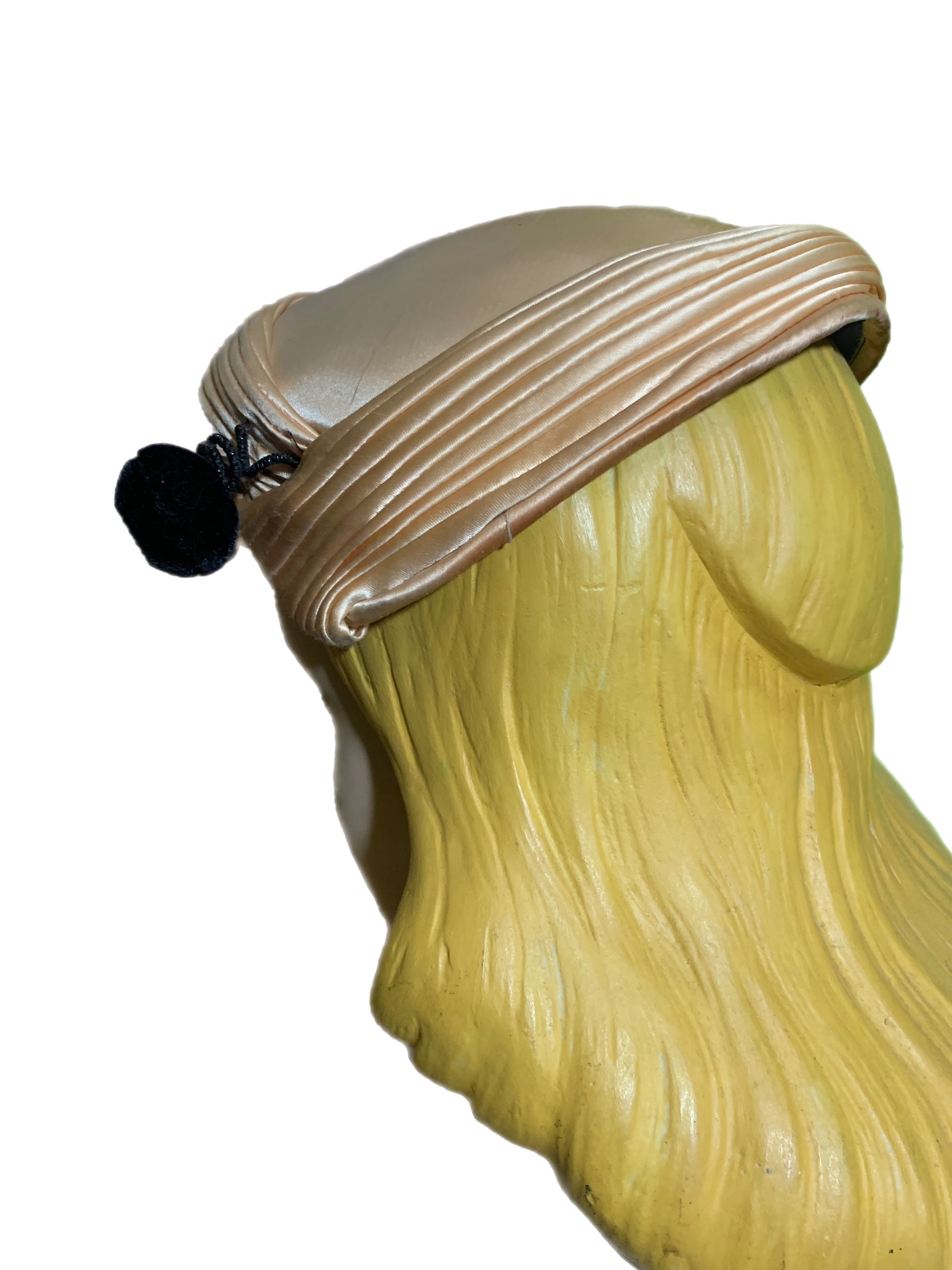 1950s champagne satin hat with buckram base, wired sides. Darling black velvet fob off to side with faux pearls, rhinestone accent on hat, beads on stem. No label, minor wear. One size.