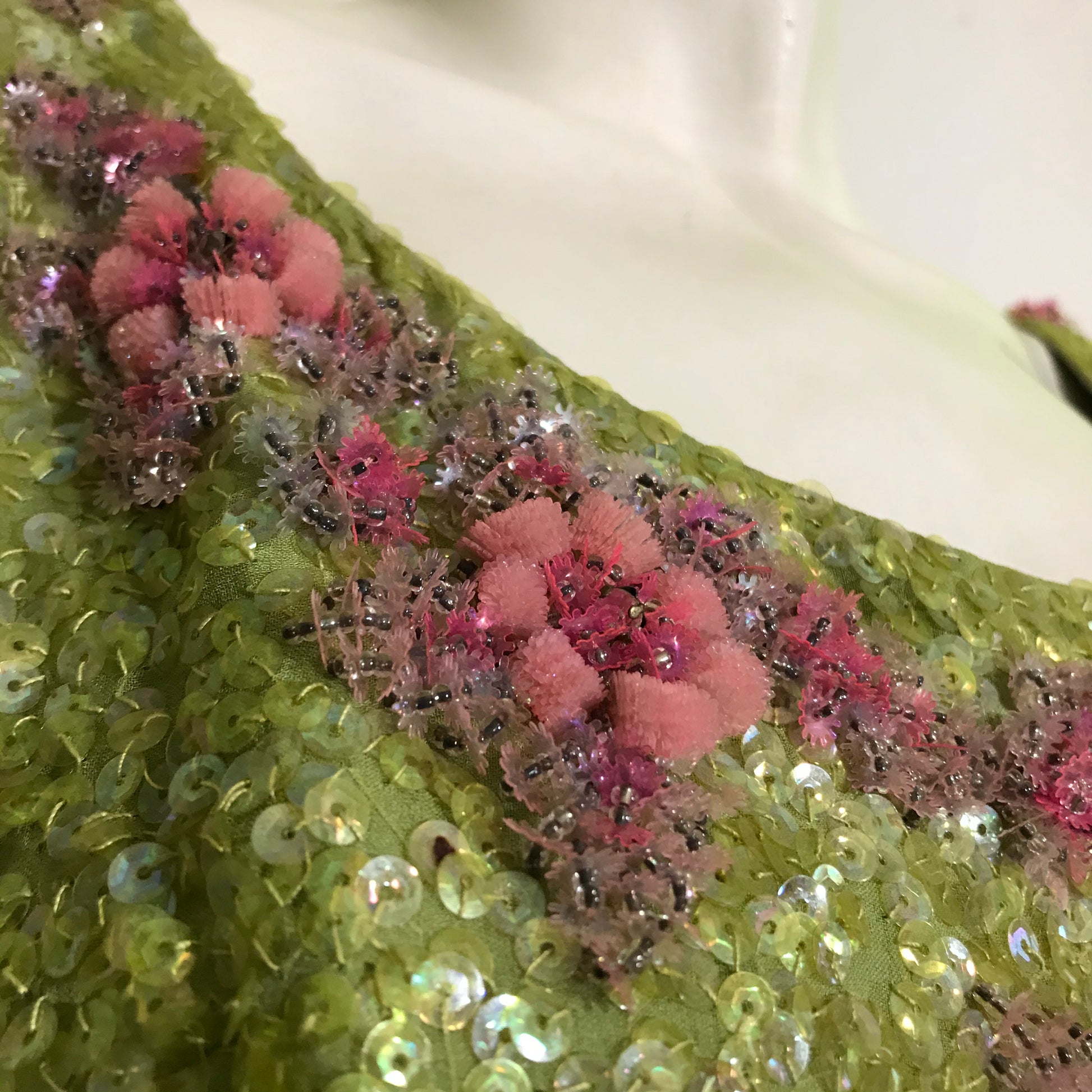 Chartreuse Glam Sequined Cocktail Dress with 3-D Pink Floral Accents circa 1960s