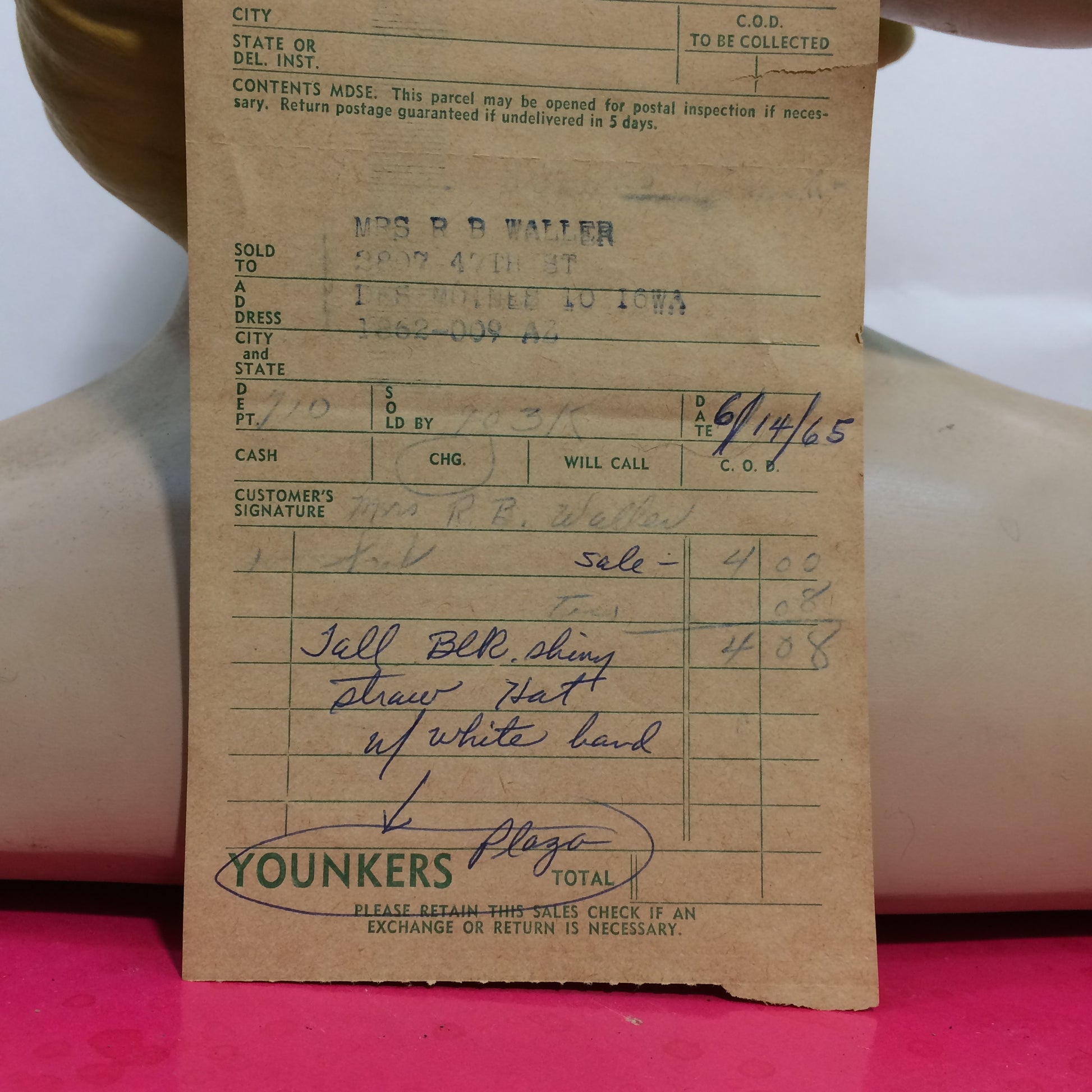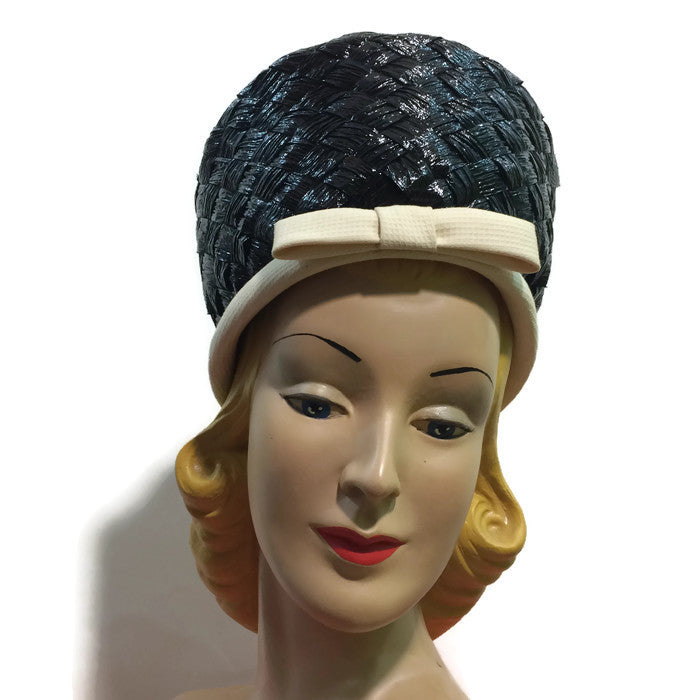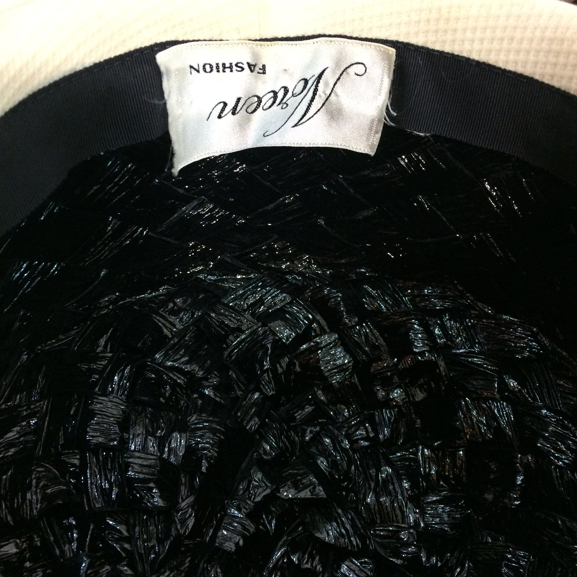 1960s tall front round glossy black braided cello hat with white pique cotton trim and front bow. By Noreen, no flaws, size 22.