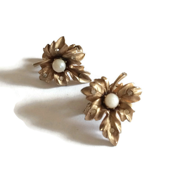 Coro gold tone metal leaf shaped clip earrings with pierced dots set with rhinestones, center faux pearls. 1", no flaws.