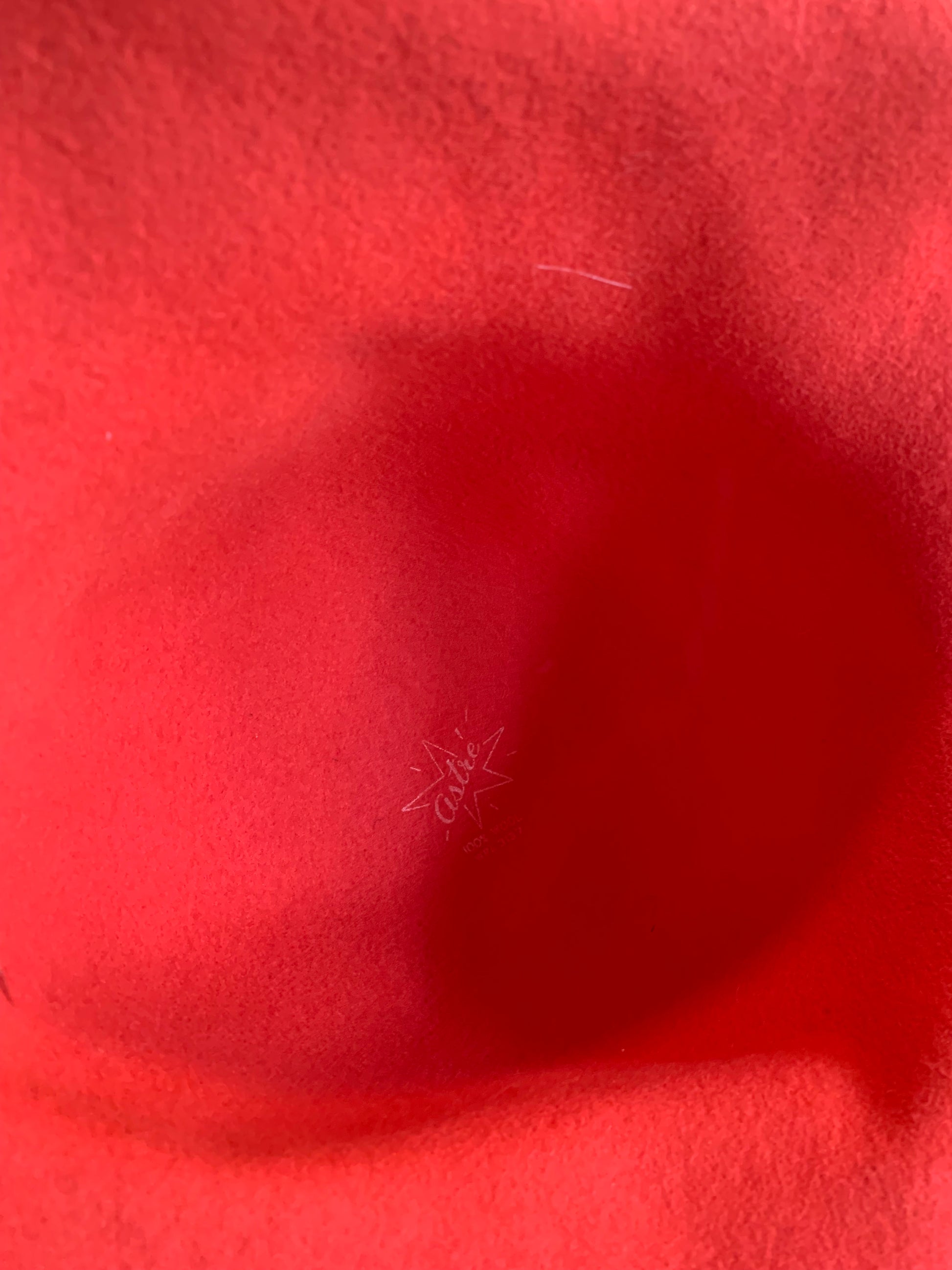Darling citrus orange felted wool 1970s hat with fringe cut edges on wide brim. No label, size 22. no flaws