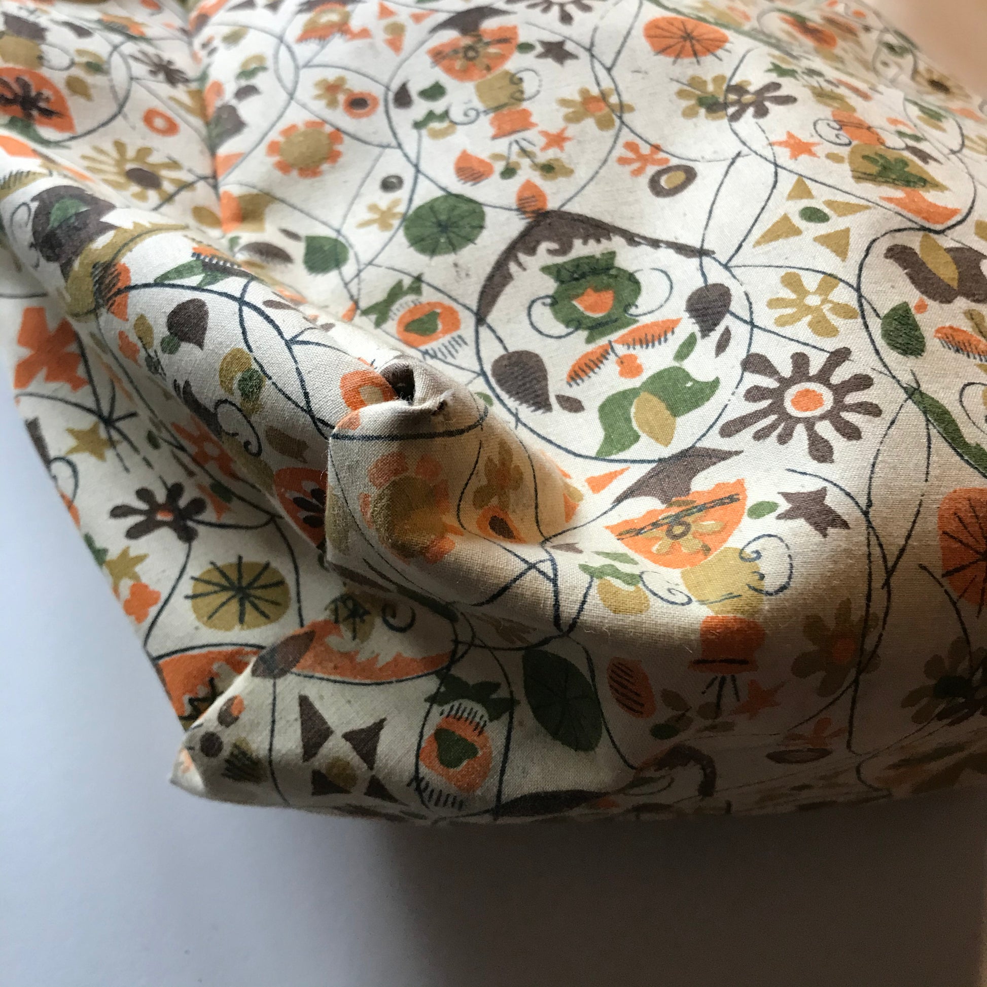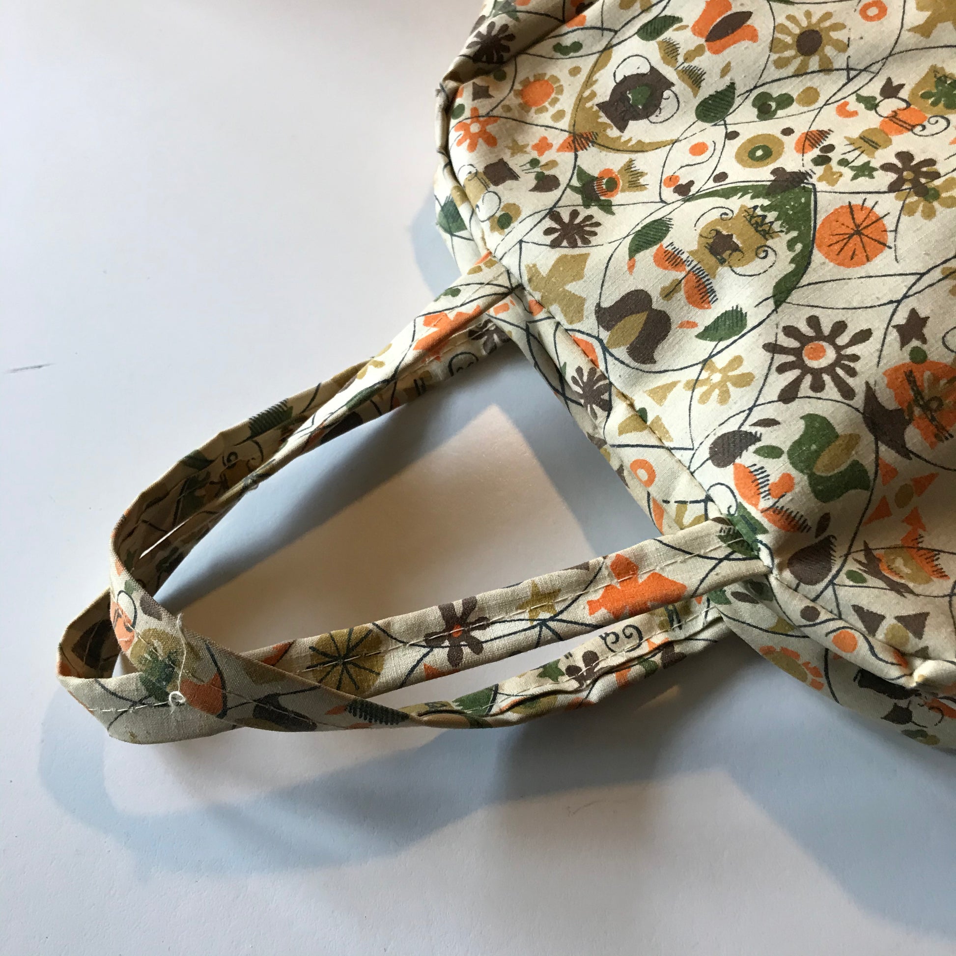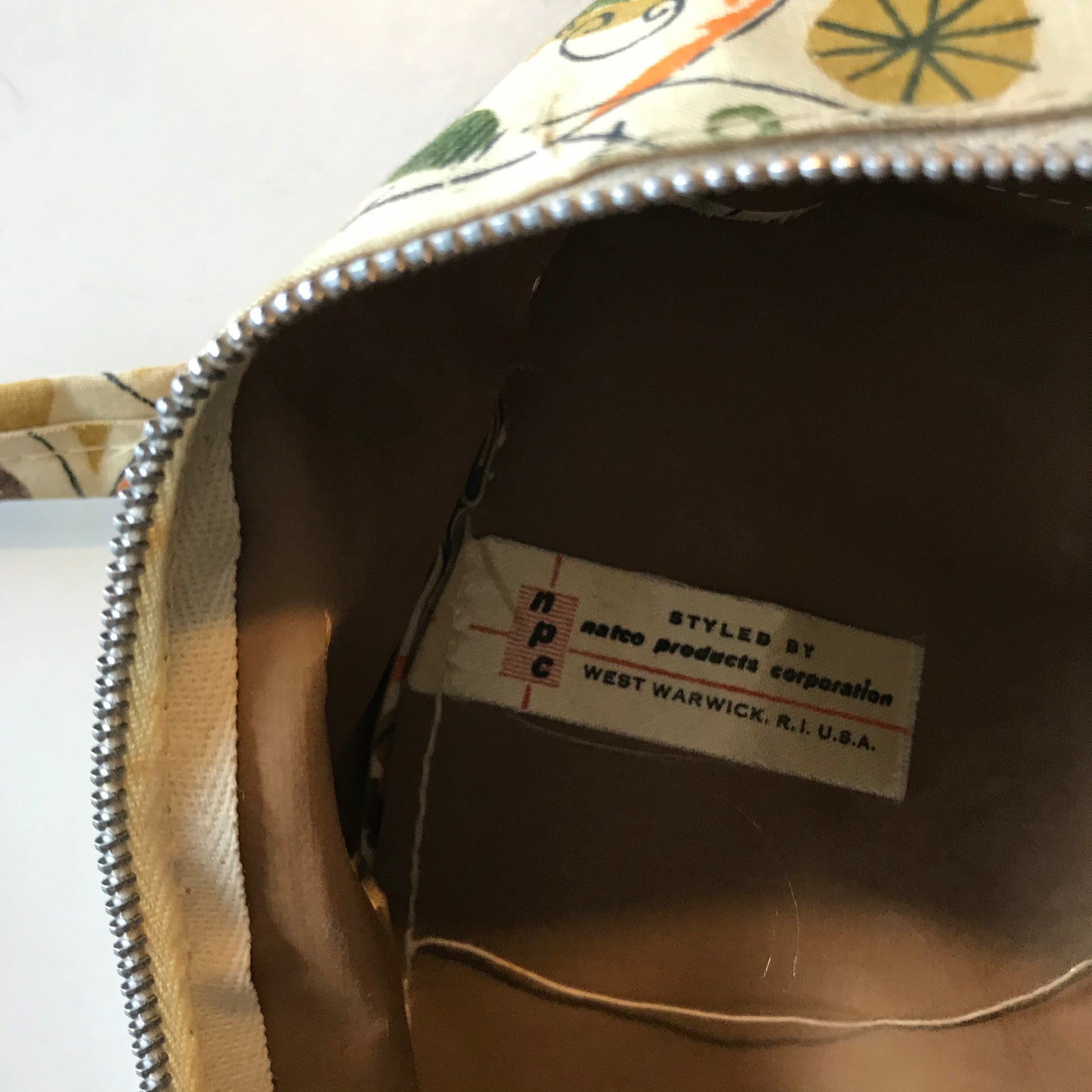 Late 60s colonial inspired novelty print canvas covered vinyl shoe bag. Buff background with green, orange and brown print. Zip top, double handled. By Natco Products. No flaws.
