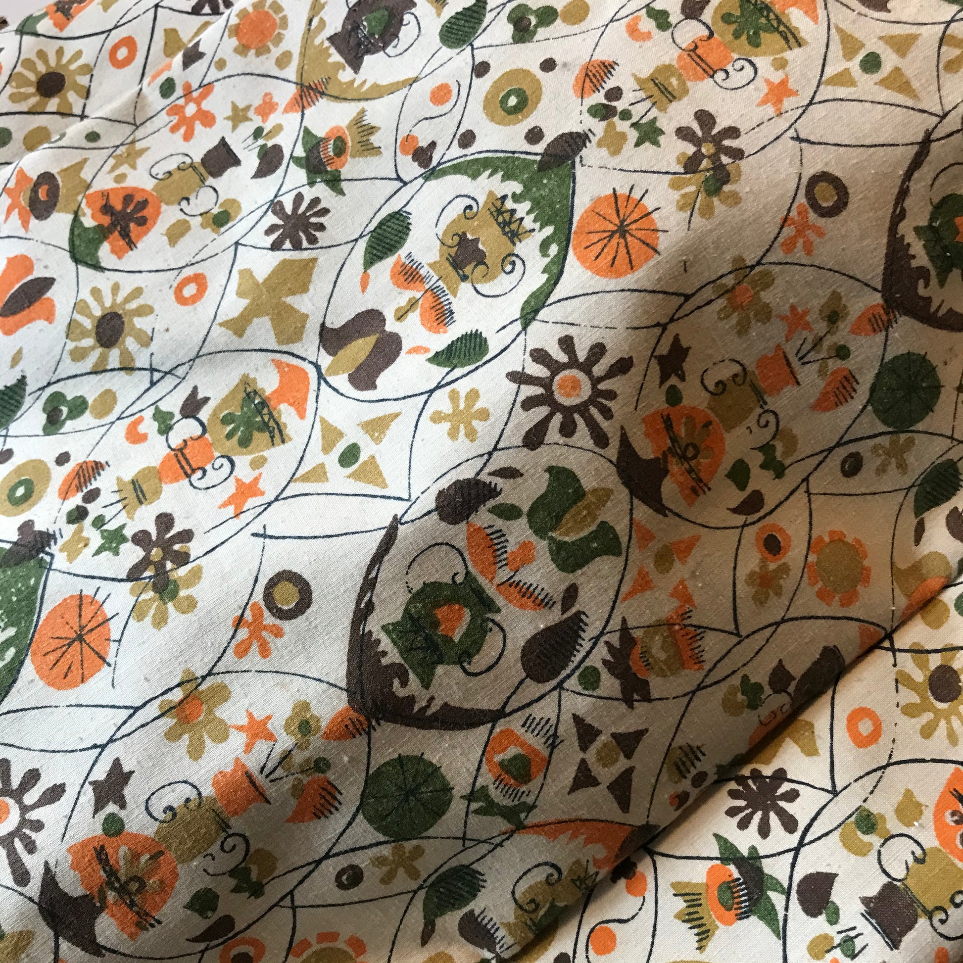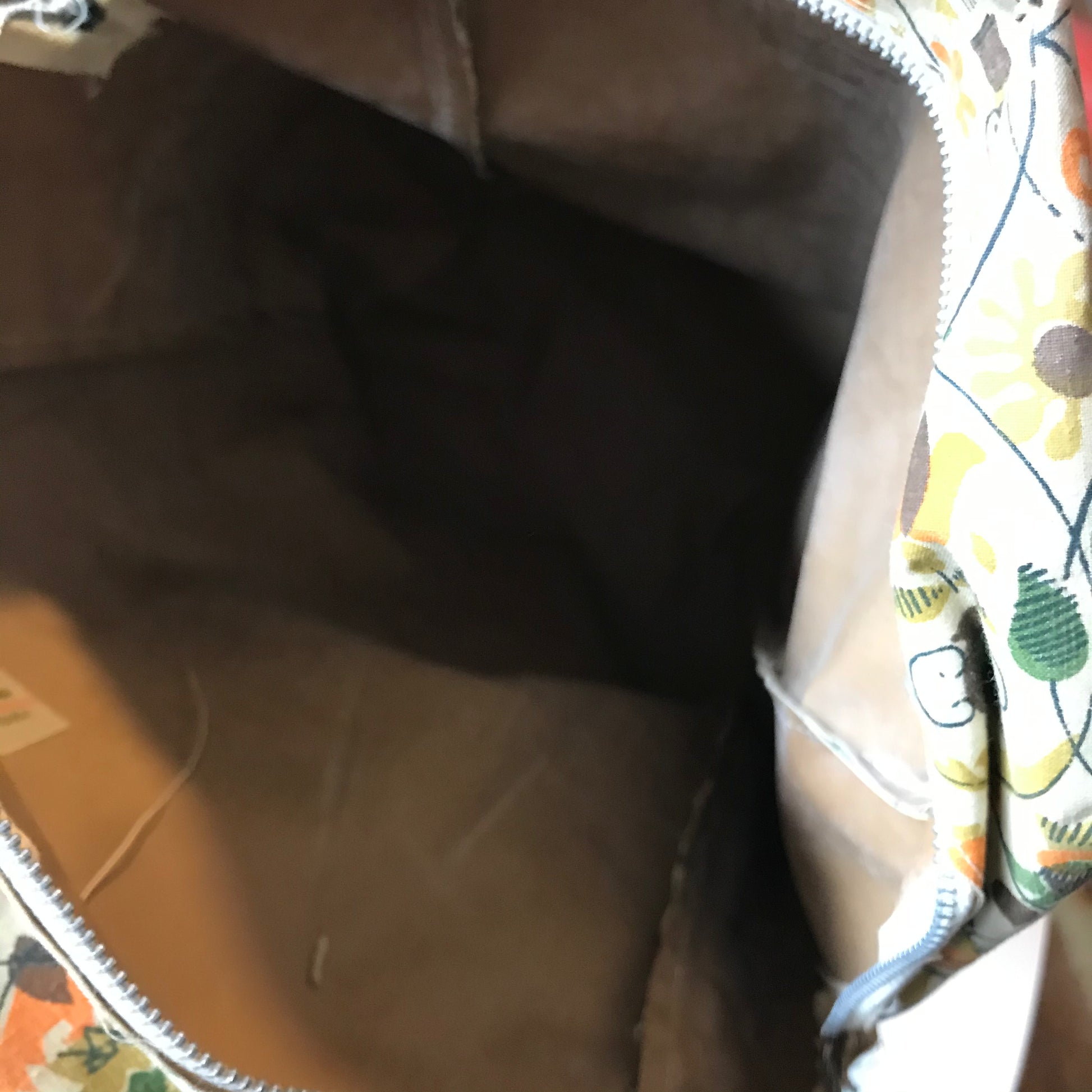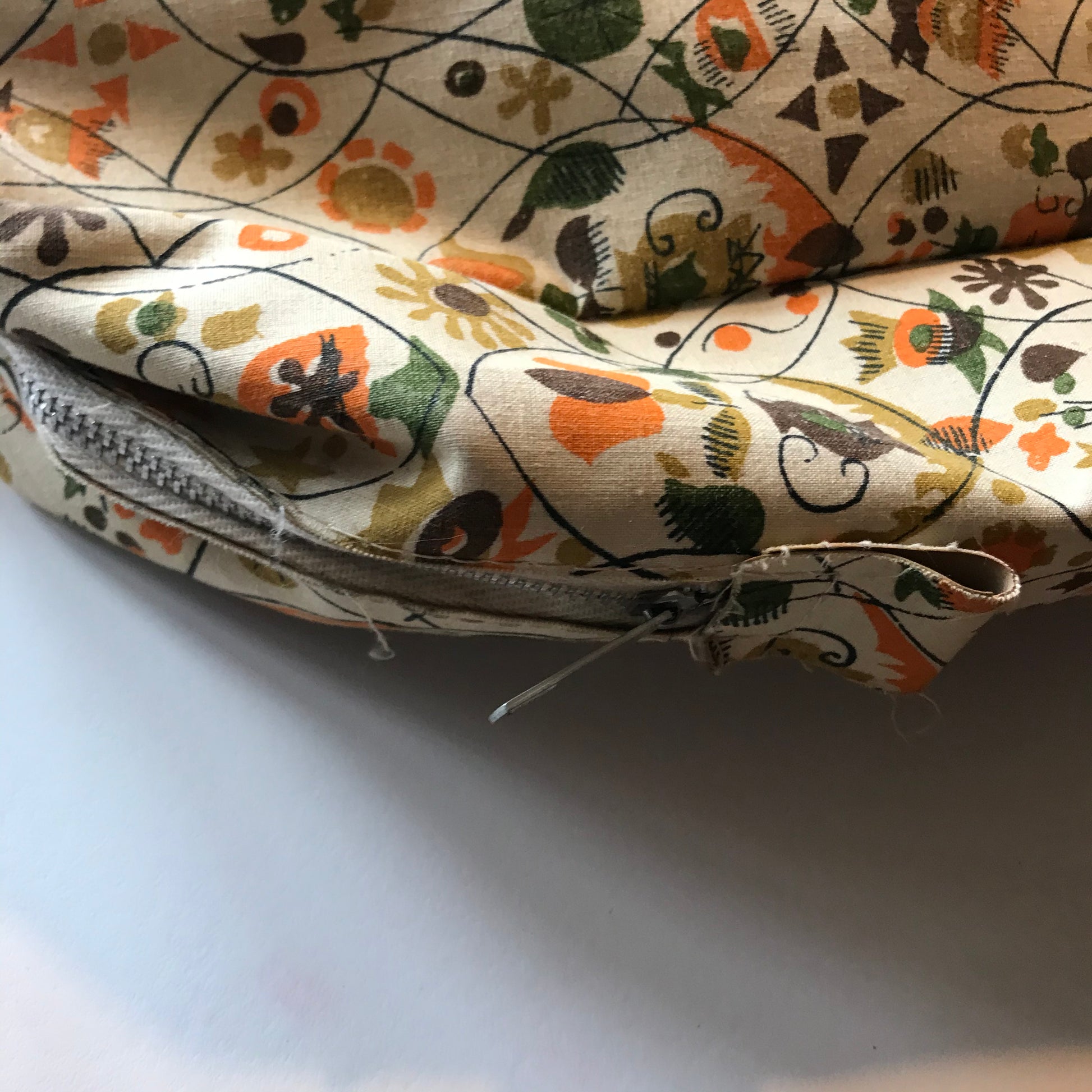 Late 60s colonial inspired novelty print canvas covered vinyl shoe bag. Buff background with green, orange and brown print. Zip top, double handled. By Natco Products. No flaws.