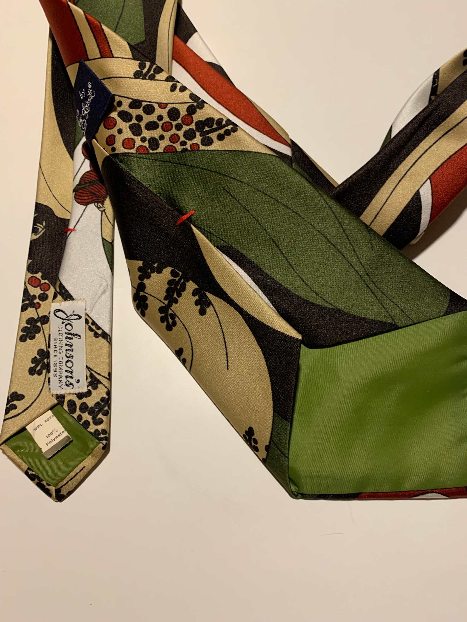 Satin finish poly 1970s tie with Geisha design. By Chemin de Fer by Leibert.
