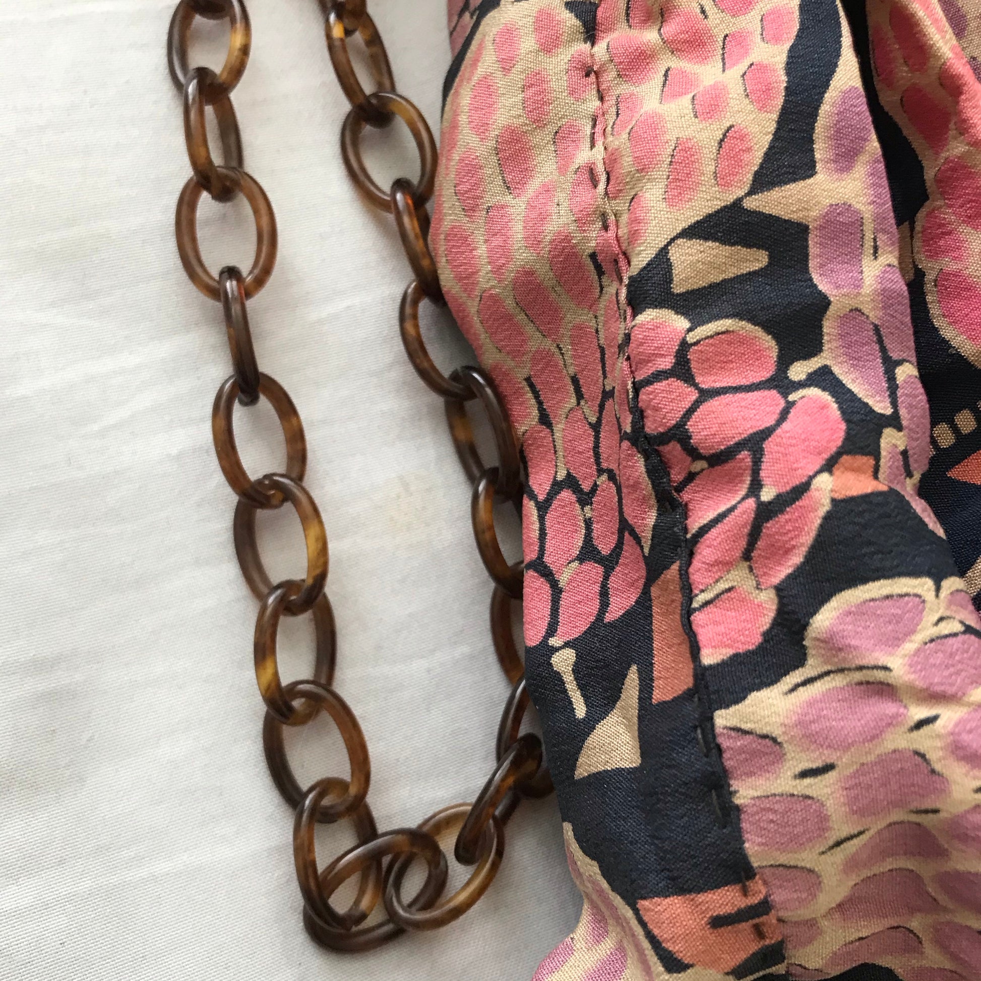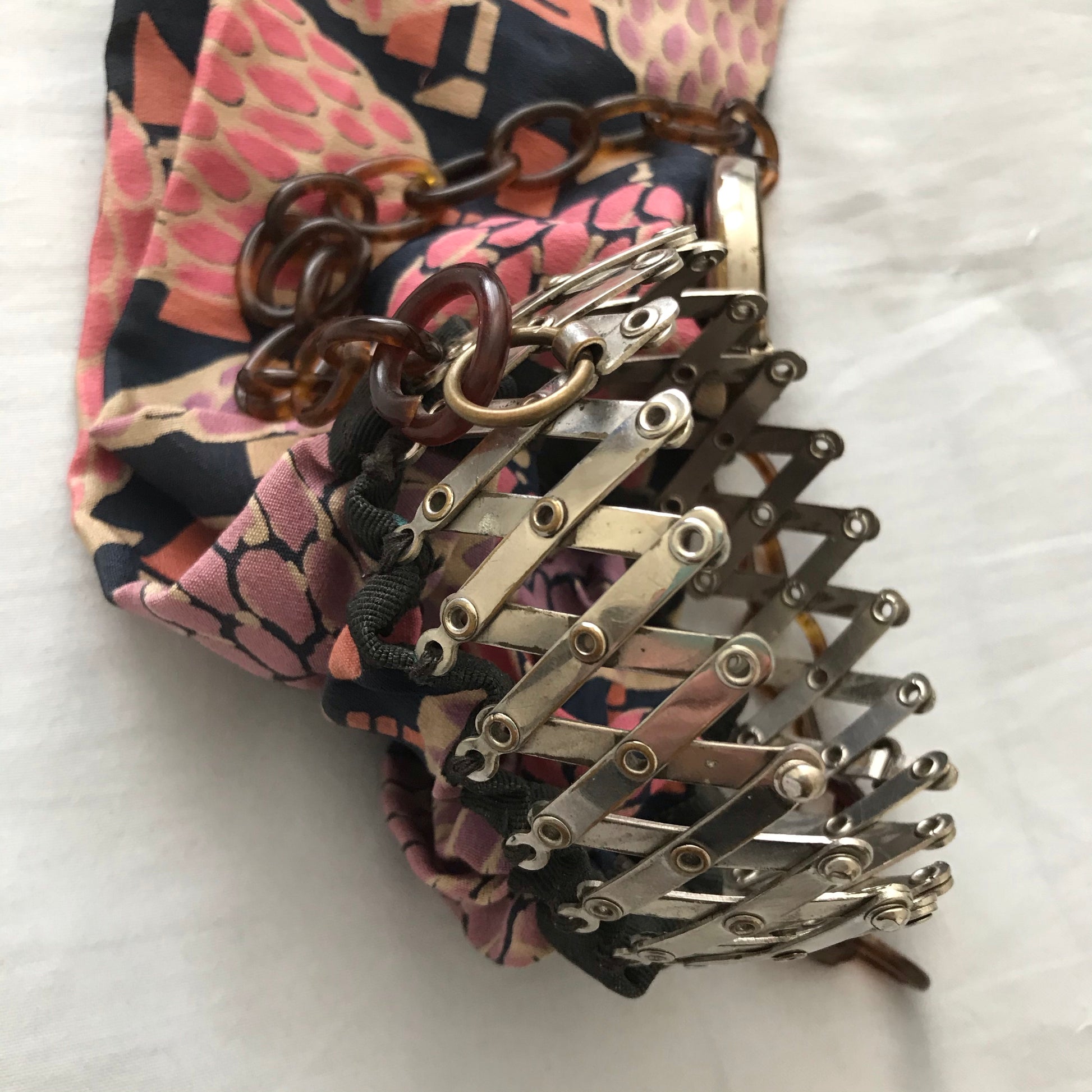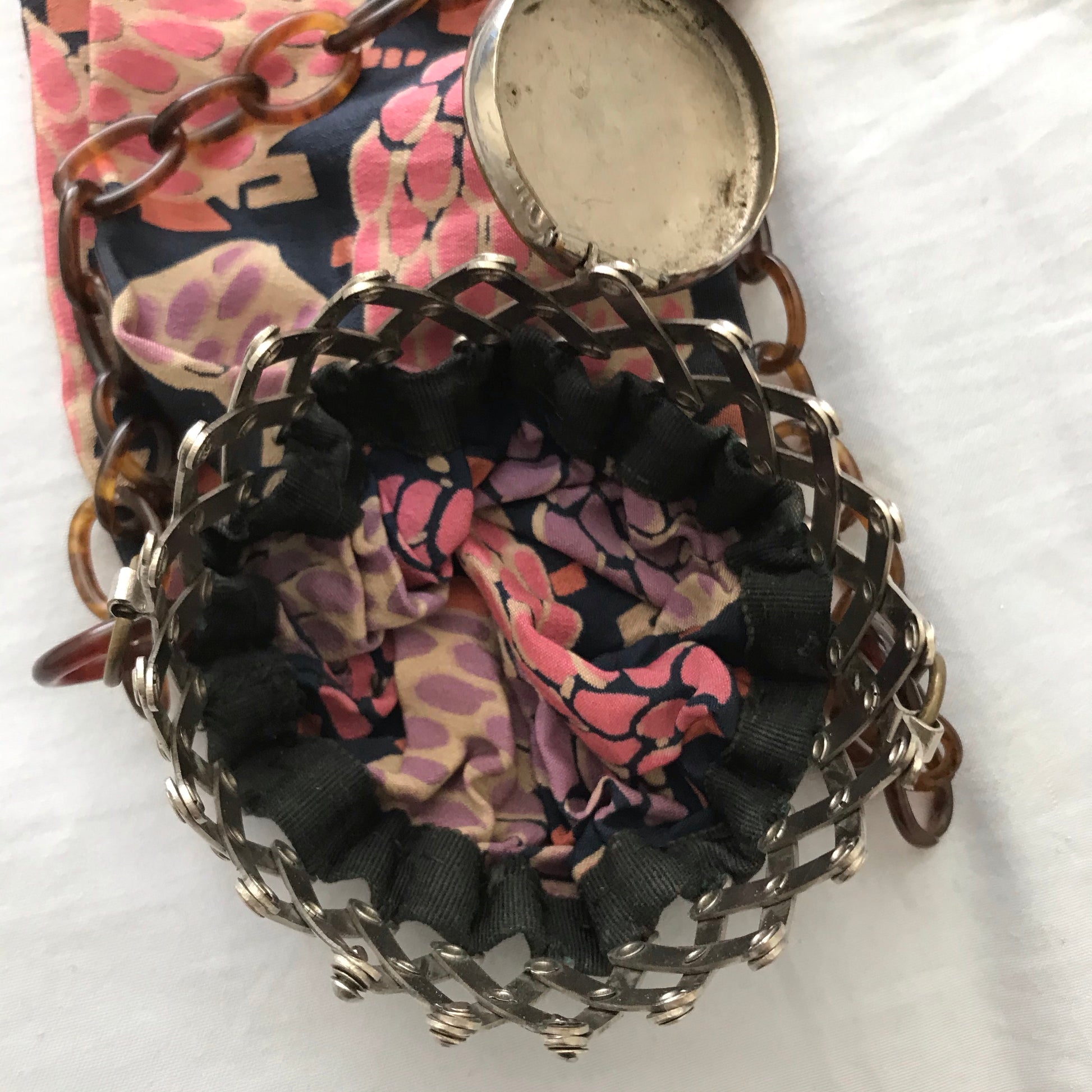 1910s pink, lilac, ivory and blue silk miser's handbag. Brown celluloid chain strap, silver tone metal accordion cinch top & folding lid. Gathered at bottom. Unlined, no flaws. Hand made. 12" long (19" including strap), fabric is 9" wide pulled out.