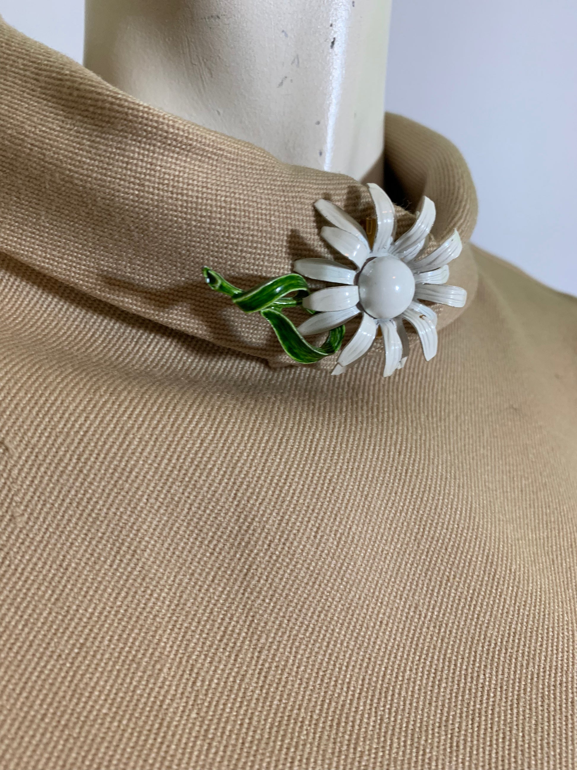 Twill weave rayon a line dress with folded collar accented with white flower brooch (was a button likely, but gone, so I added a pin!). Back metal zipper, lined. A few faint spots as shown.