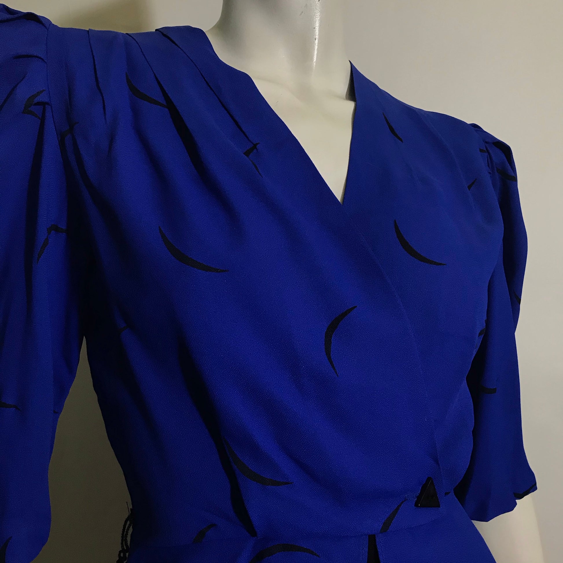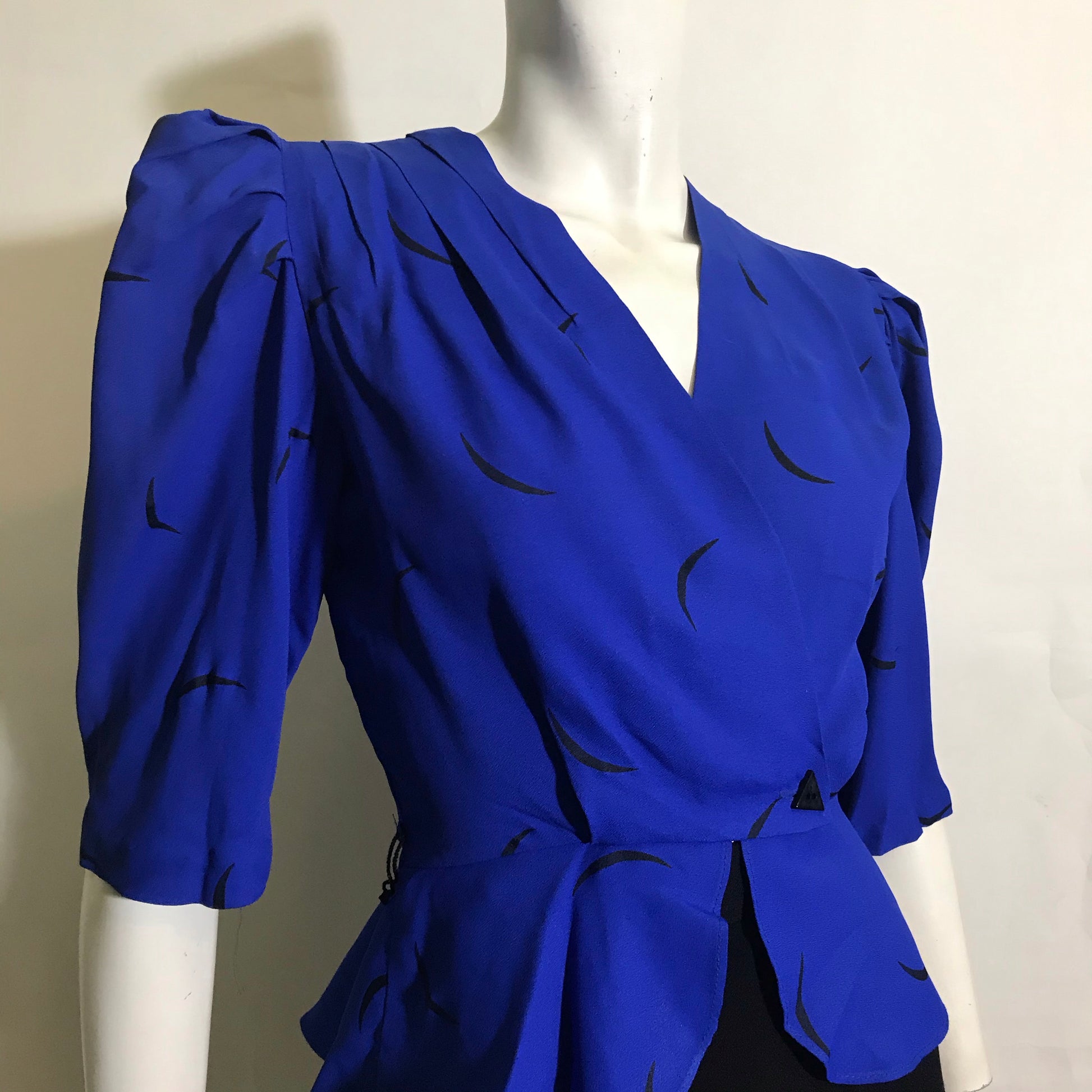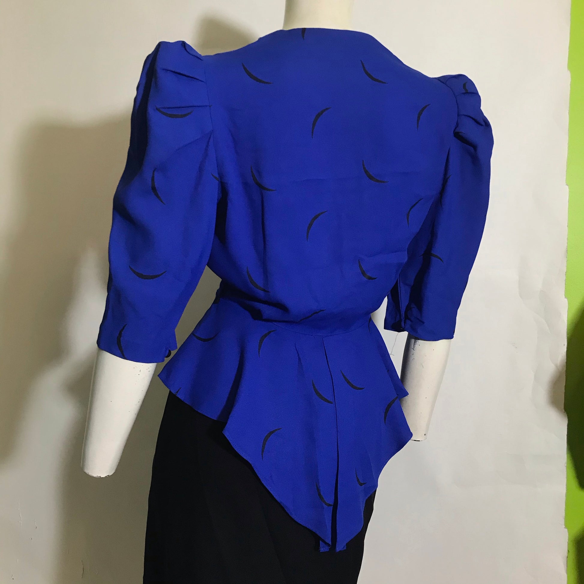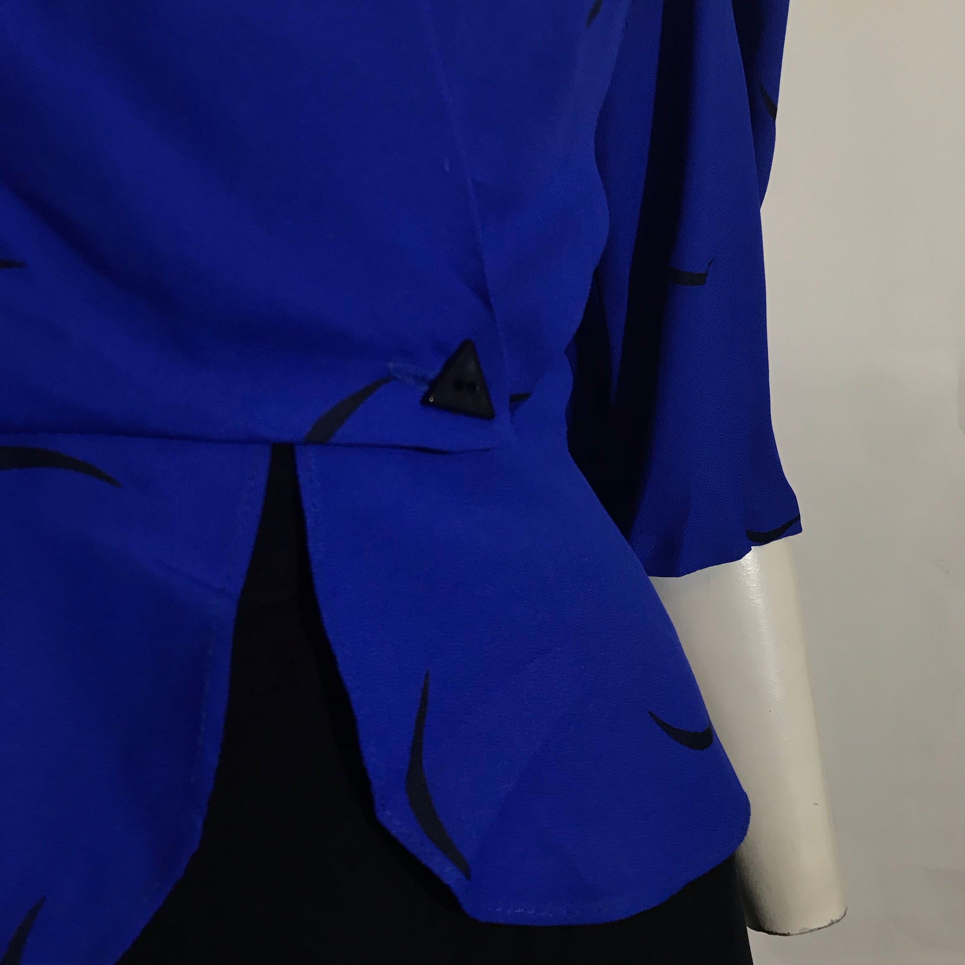 1980s very Blade Runner 2 pc rayon dress set! Blue jacket with abstract print, triangle button, big shoulder pads and peplum that is longer in back than front. No lining, no flaws.