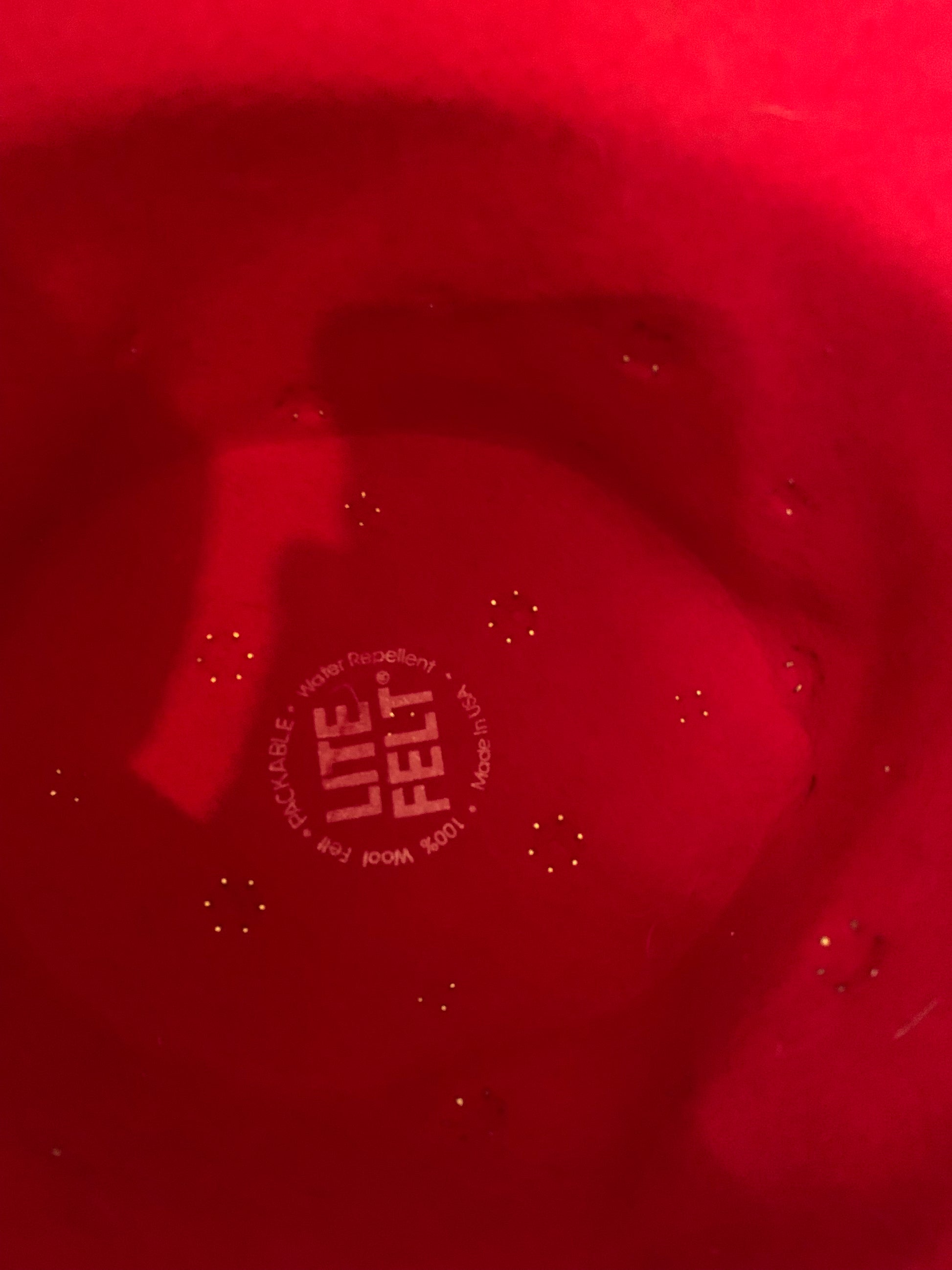 Lipstick red felted wool curved brim 1980s hat with golden metal domed studs. No label, hat made by LiteFelt. No flaws. Size 22 1/2".