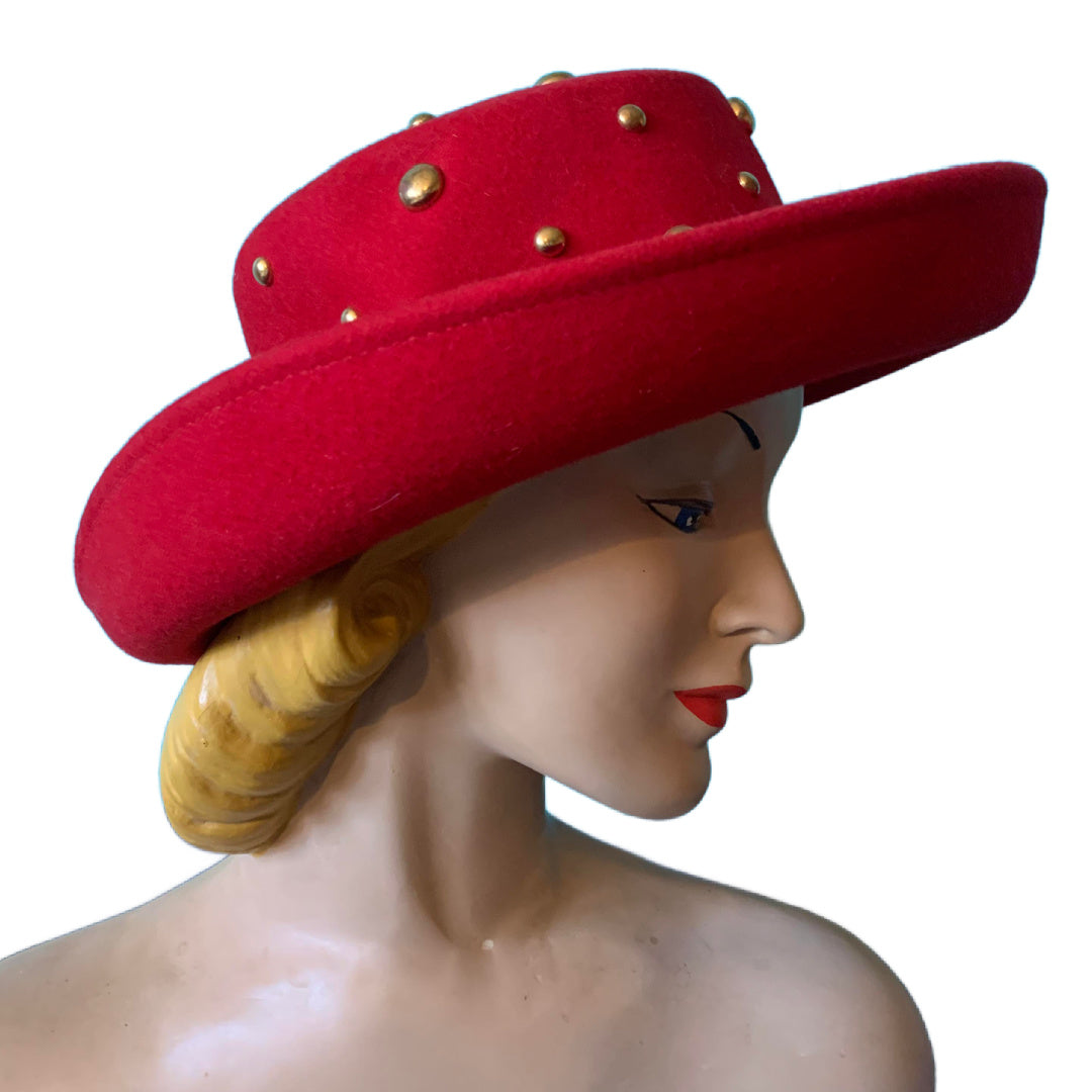 Lipstick Red Wool Hat with Golden Domed Metal Studs circa 1980s