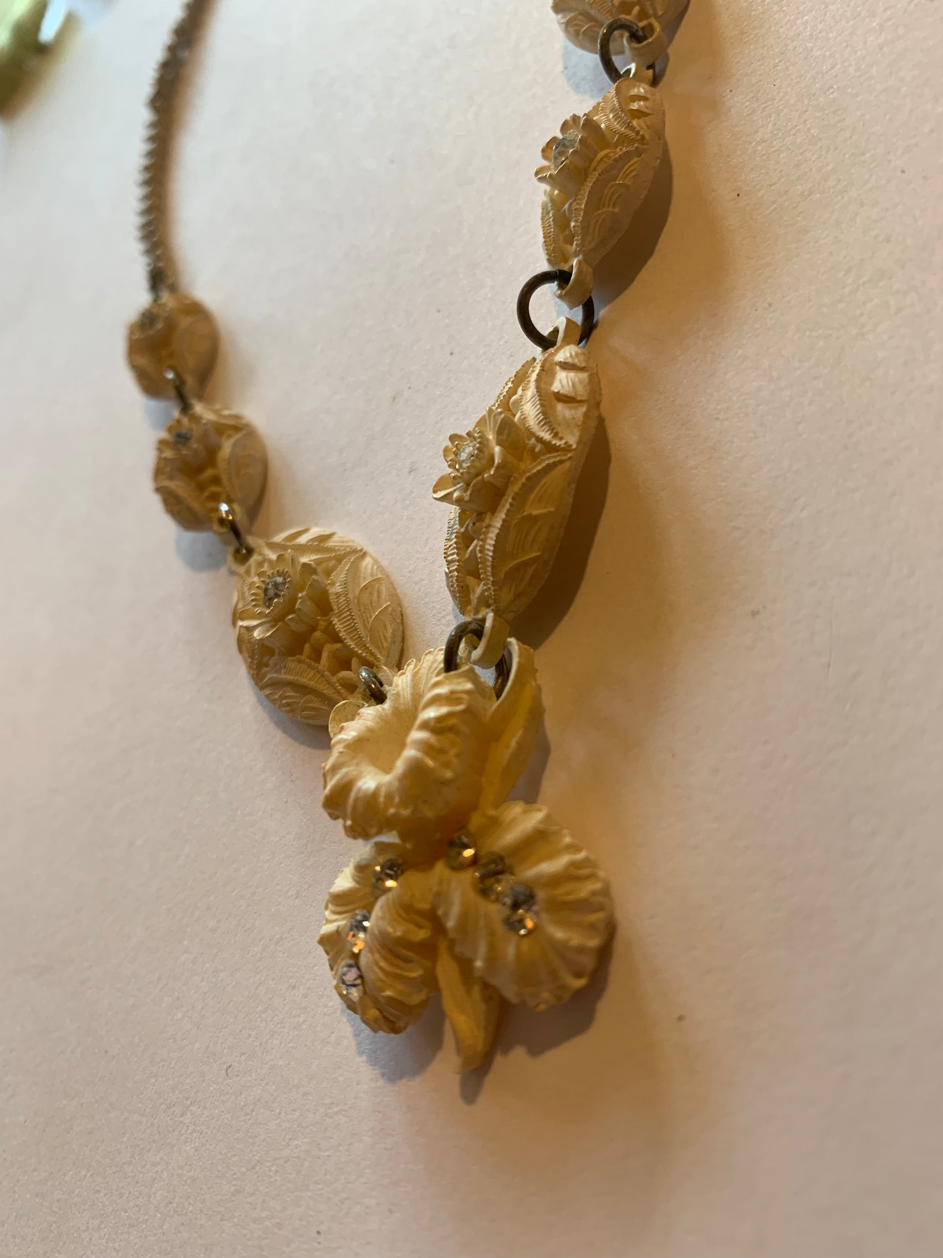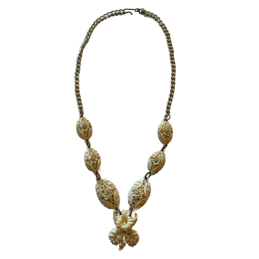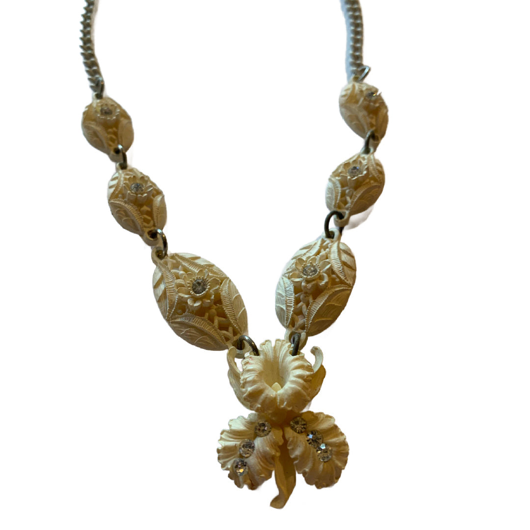 Creamy White Celluloid Orchid Pendant Necklace with Rhinestones circa 1930s