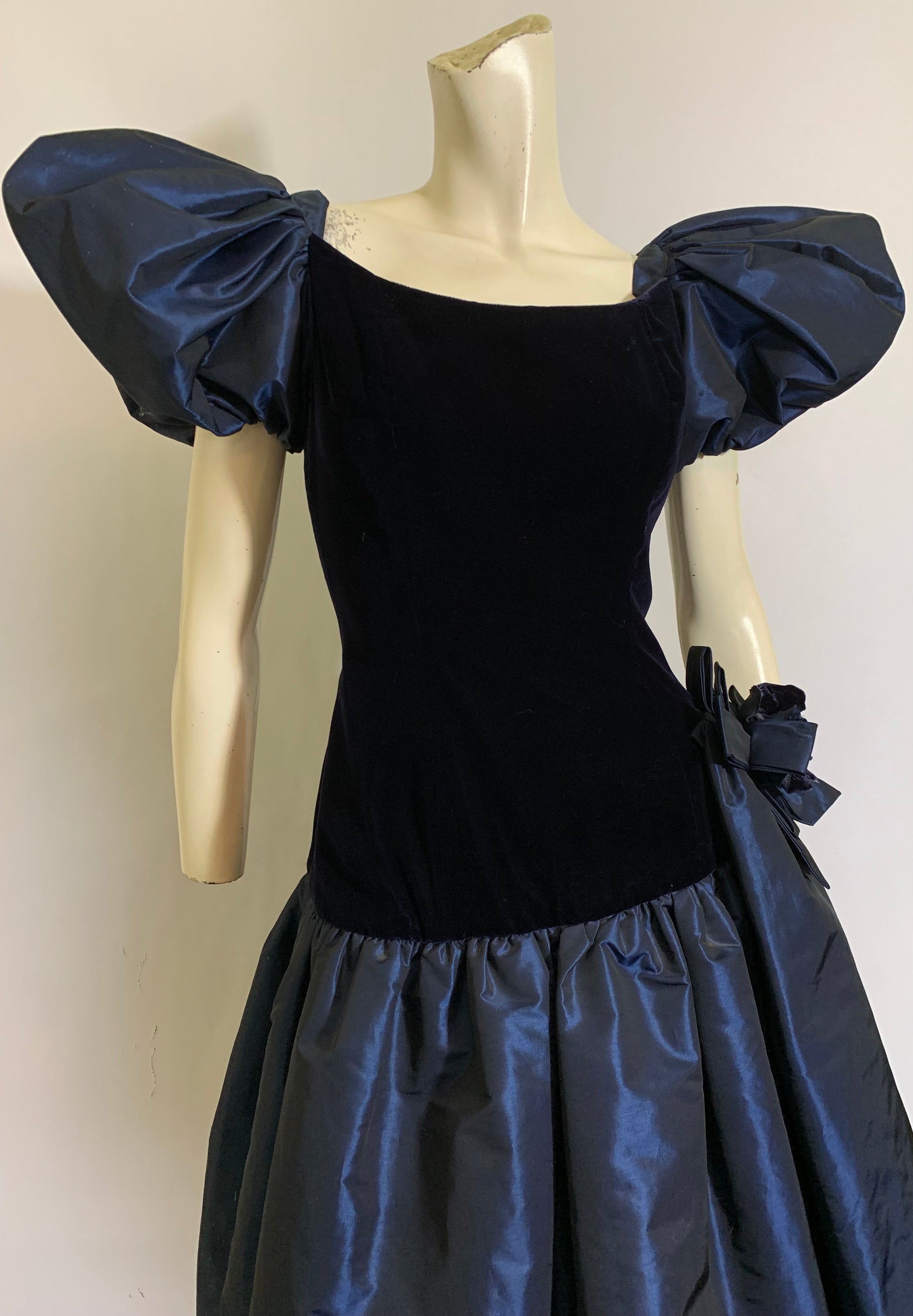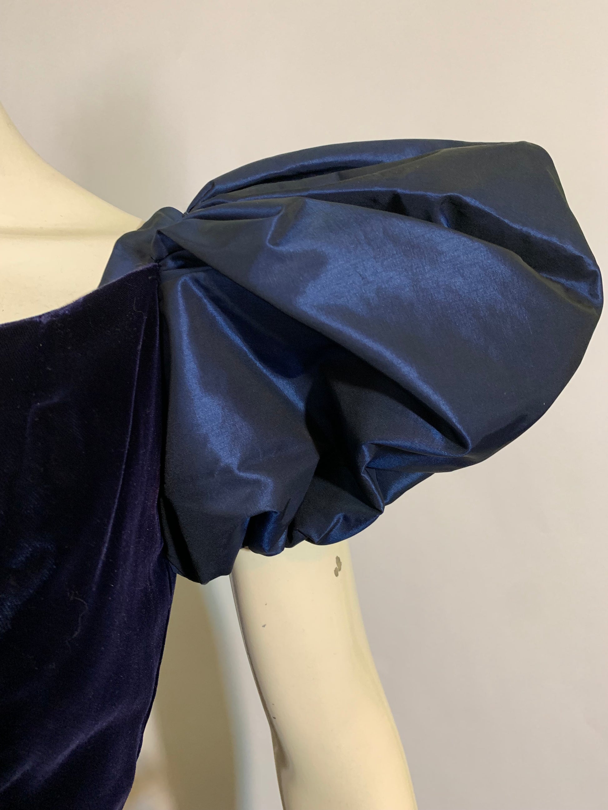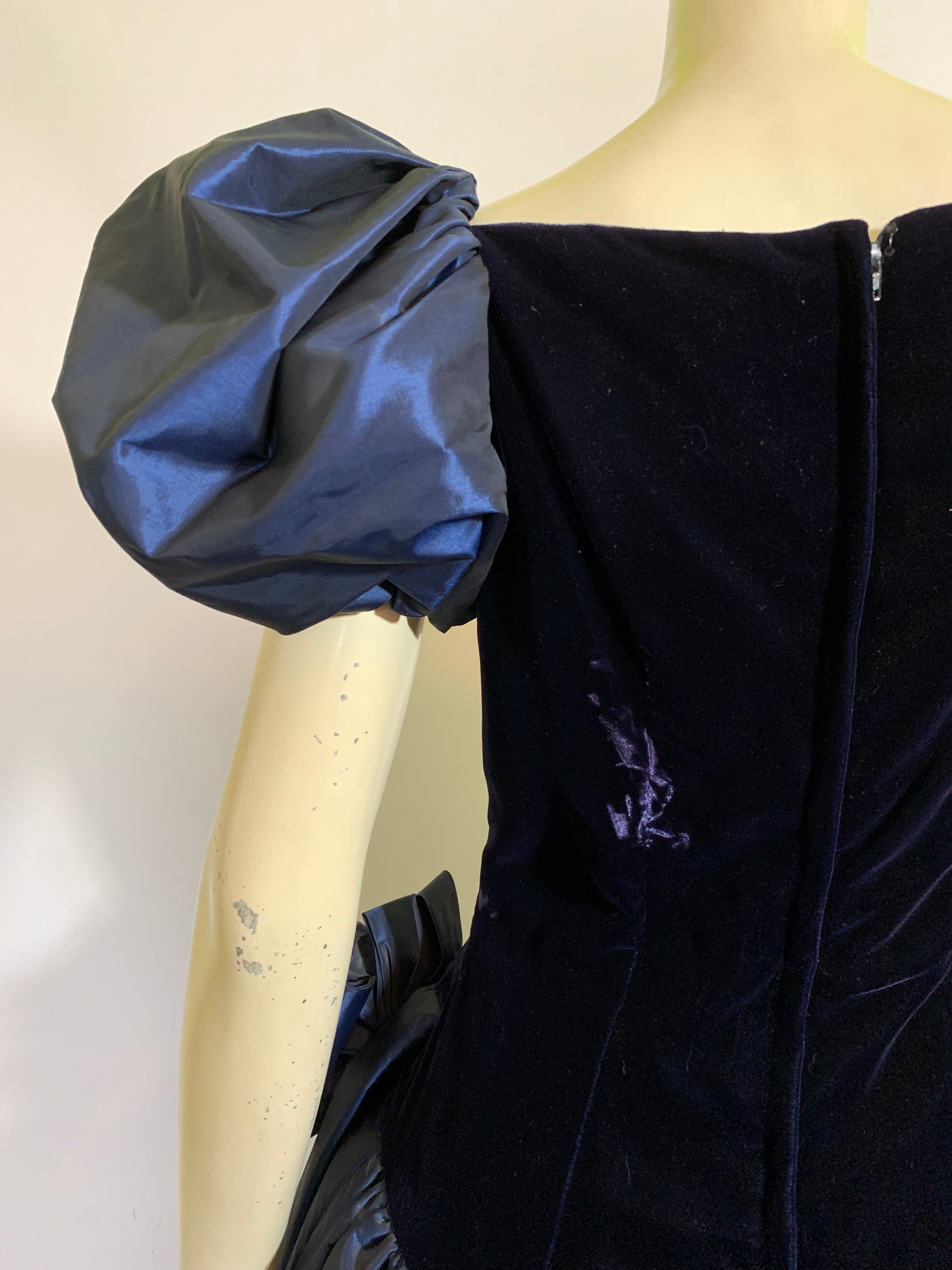 Deep Blue Changeable Taffeta and Velvet Puff Sleeve Dress circa 1980s