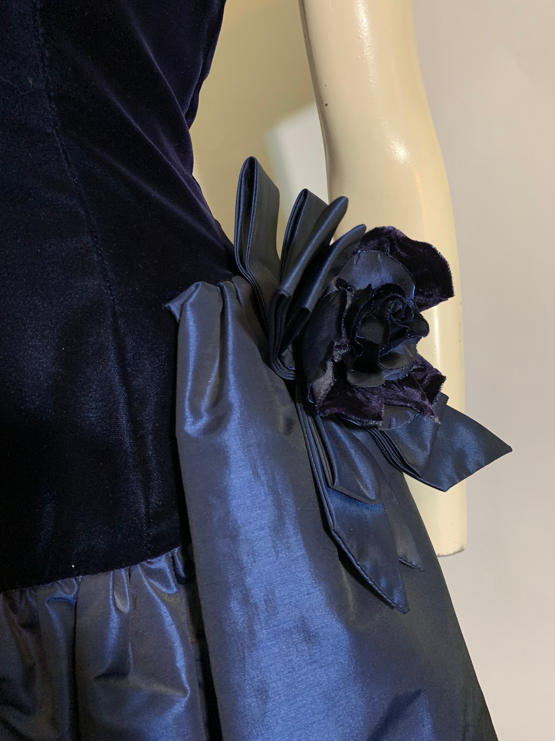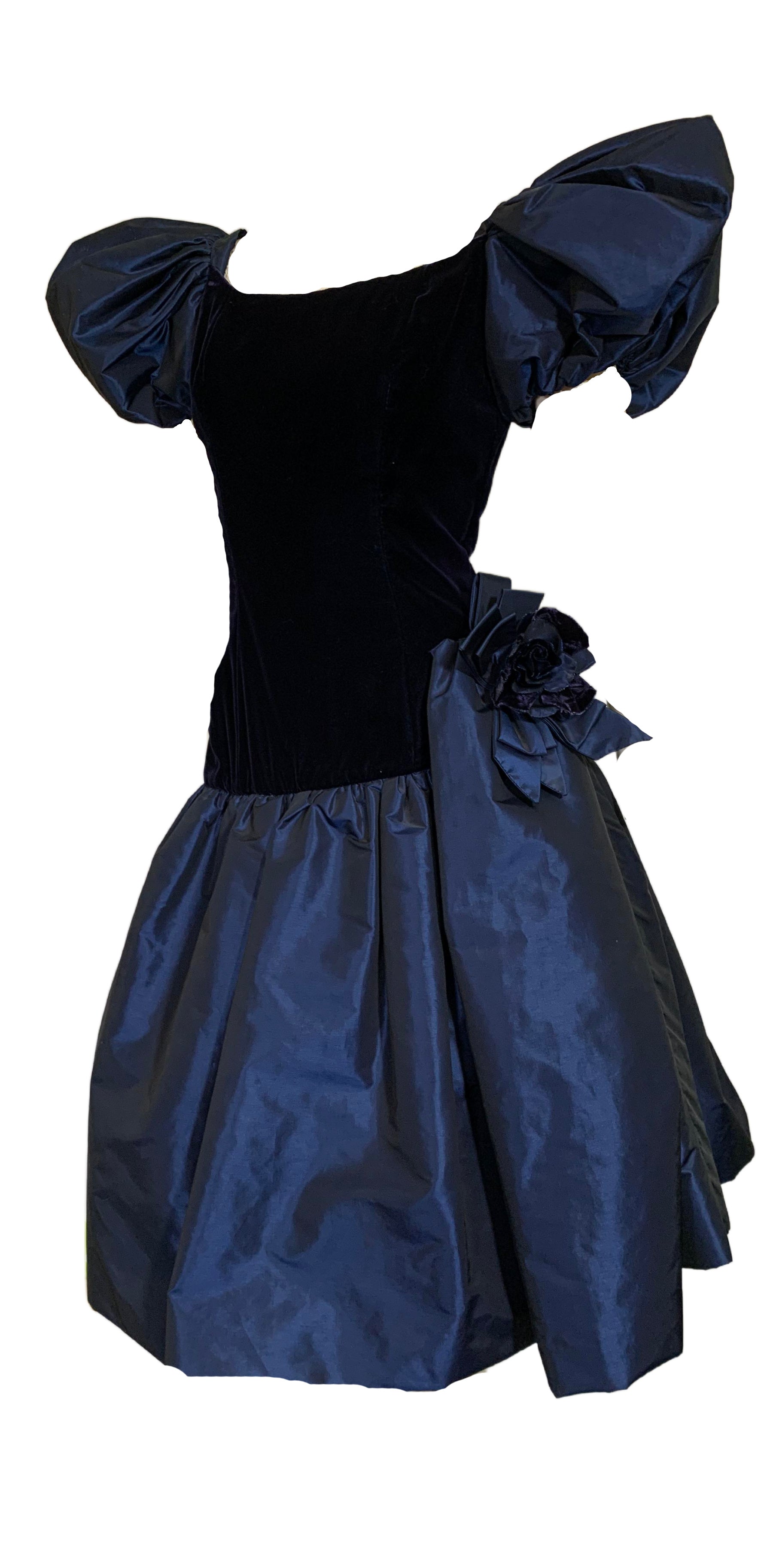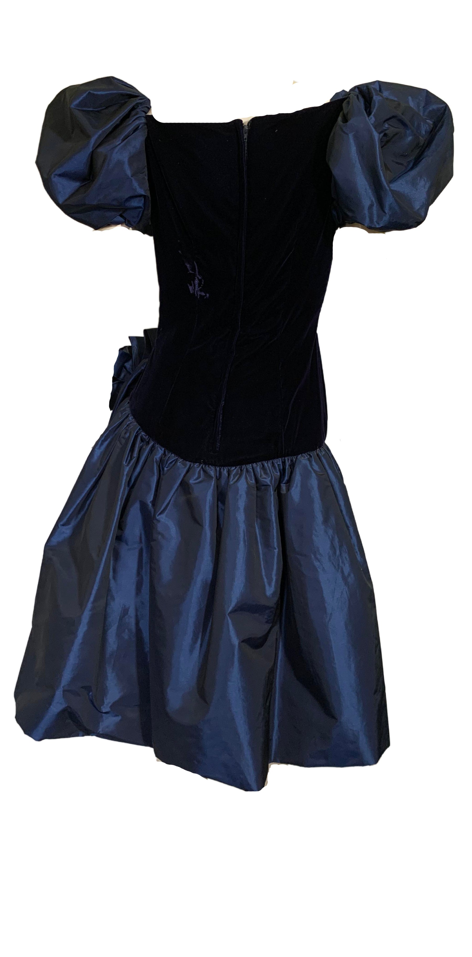 Deep Blue Changeable Taffeta and Velvet Puff Sleeve Dress circa 1980s