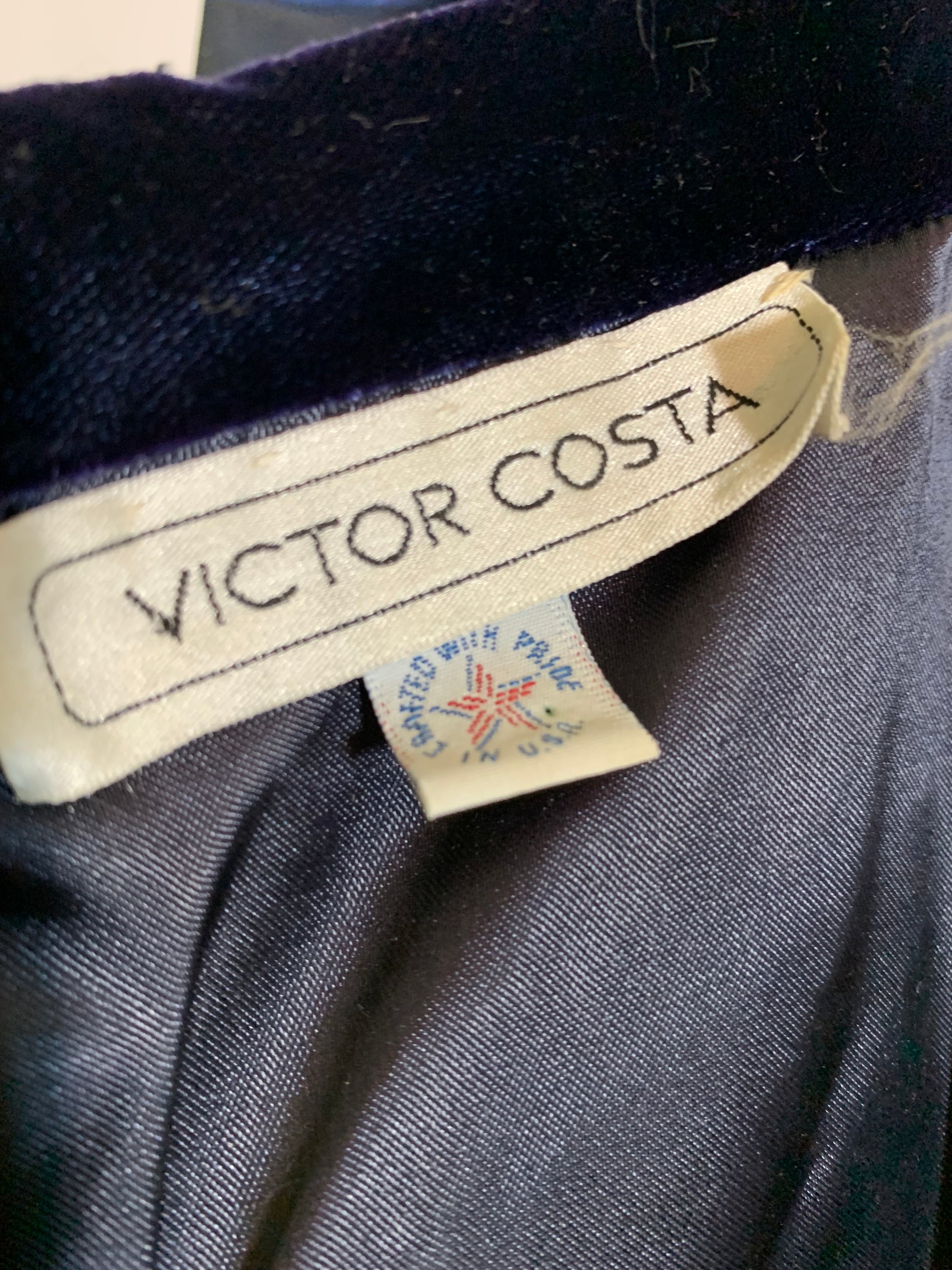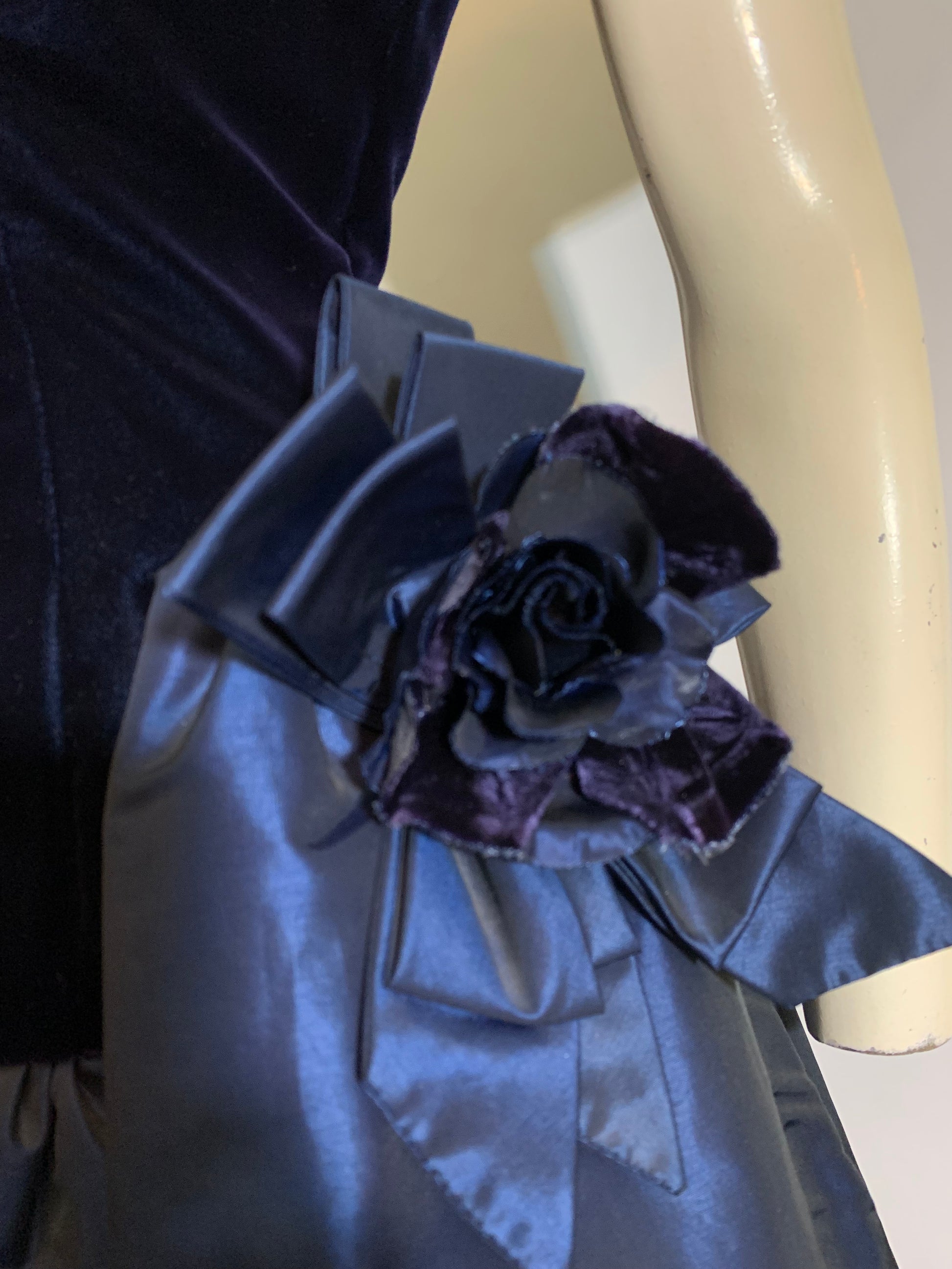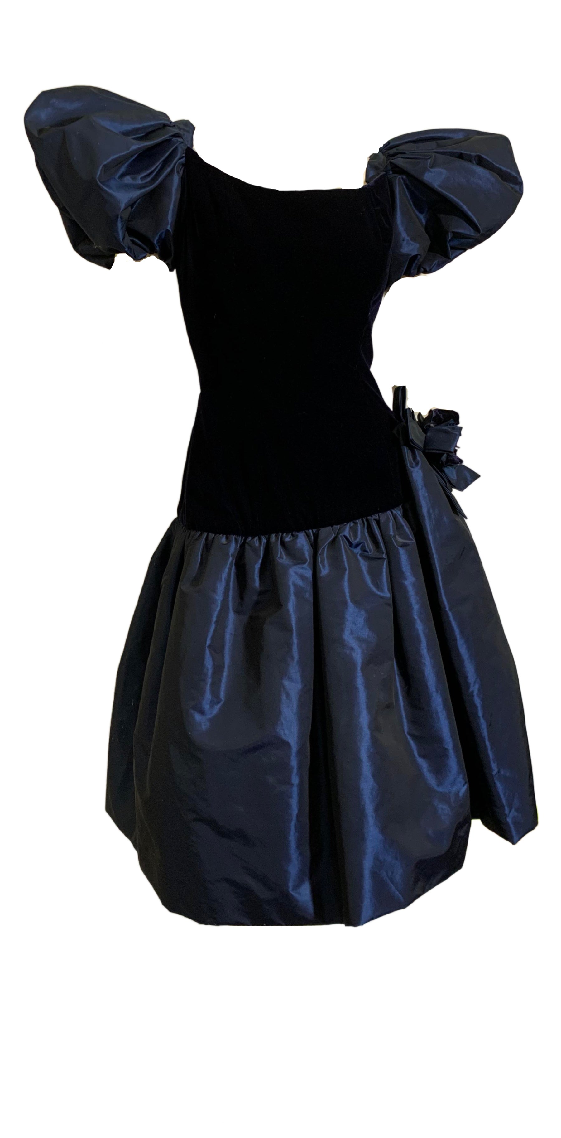 Incredible avant garde blue Victor Costa cocktail dress with black velvet bodice, changeable taffeta skirt and HUGE sculpted puff sleeves. Bow on left hip with blue rose. Back zipper. Rayon/acetate. Lined. Small area of velvet crush on back, just looks like light hitting differently.
