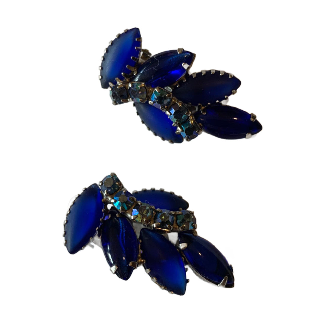 Deep Blue Crystal and Rhinestone Clip Earrings circa 1960s