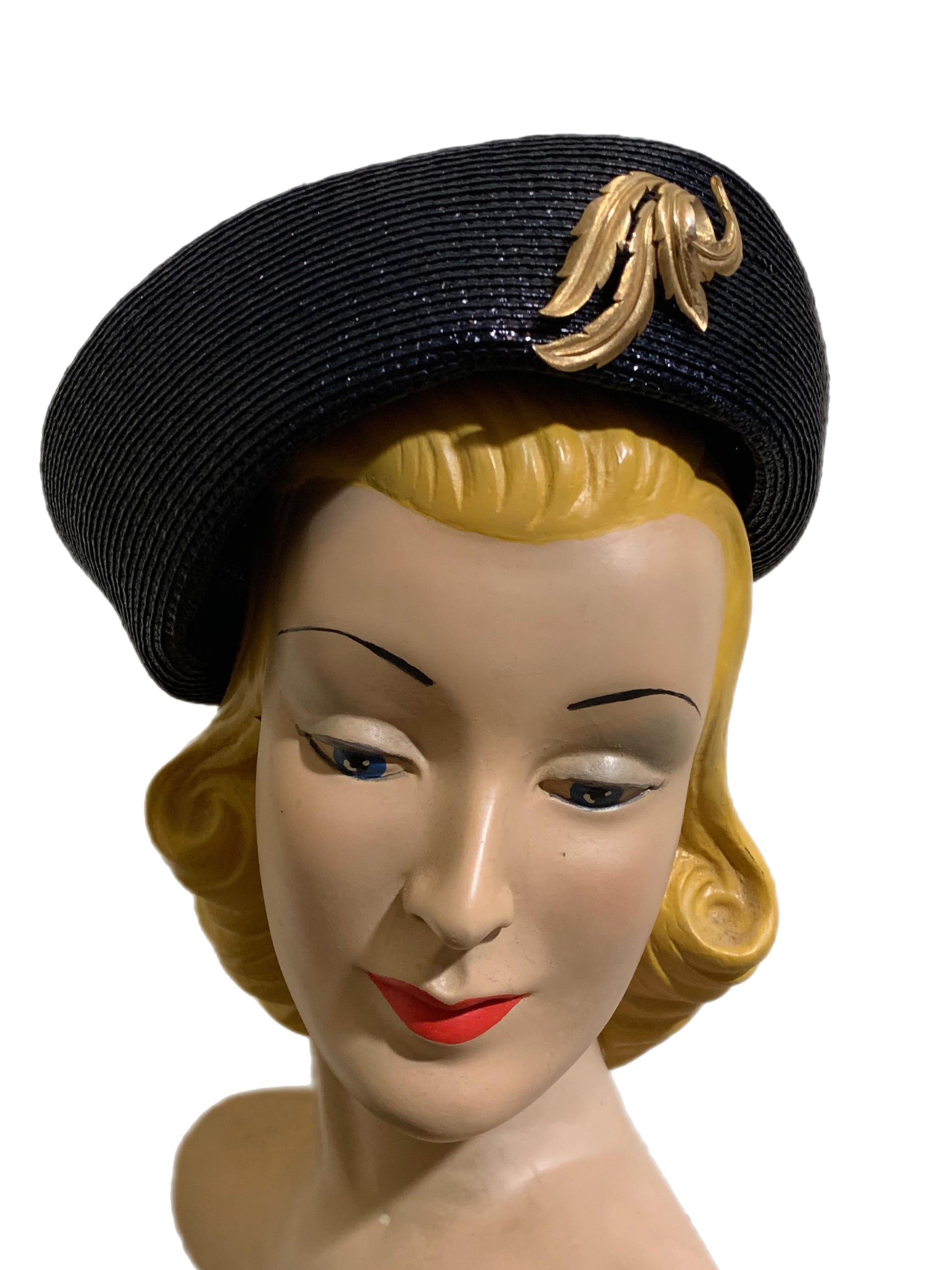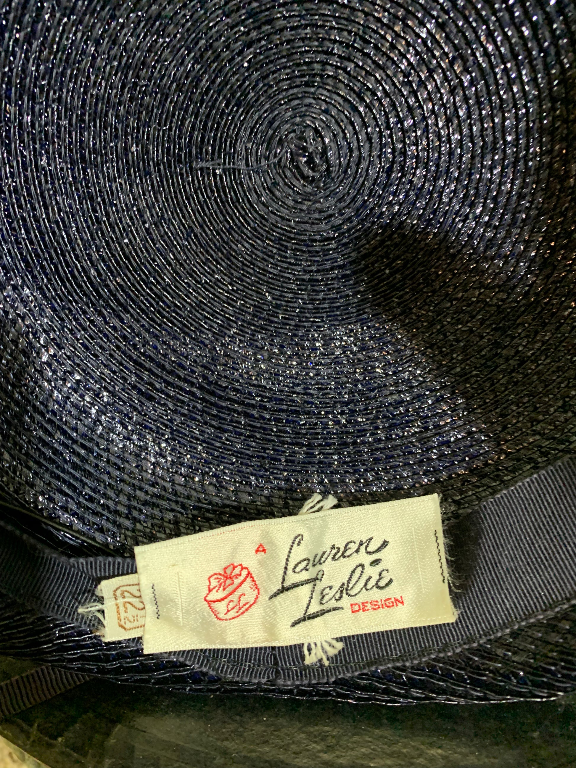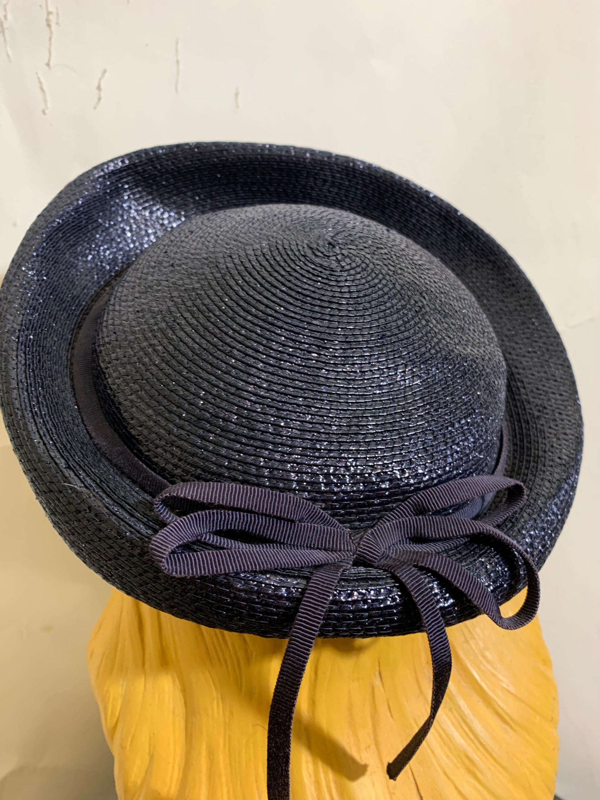 Deep Blue Glossy Sisal Rounded Hat with Bow Back circa 1960s