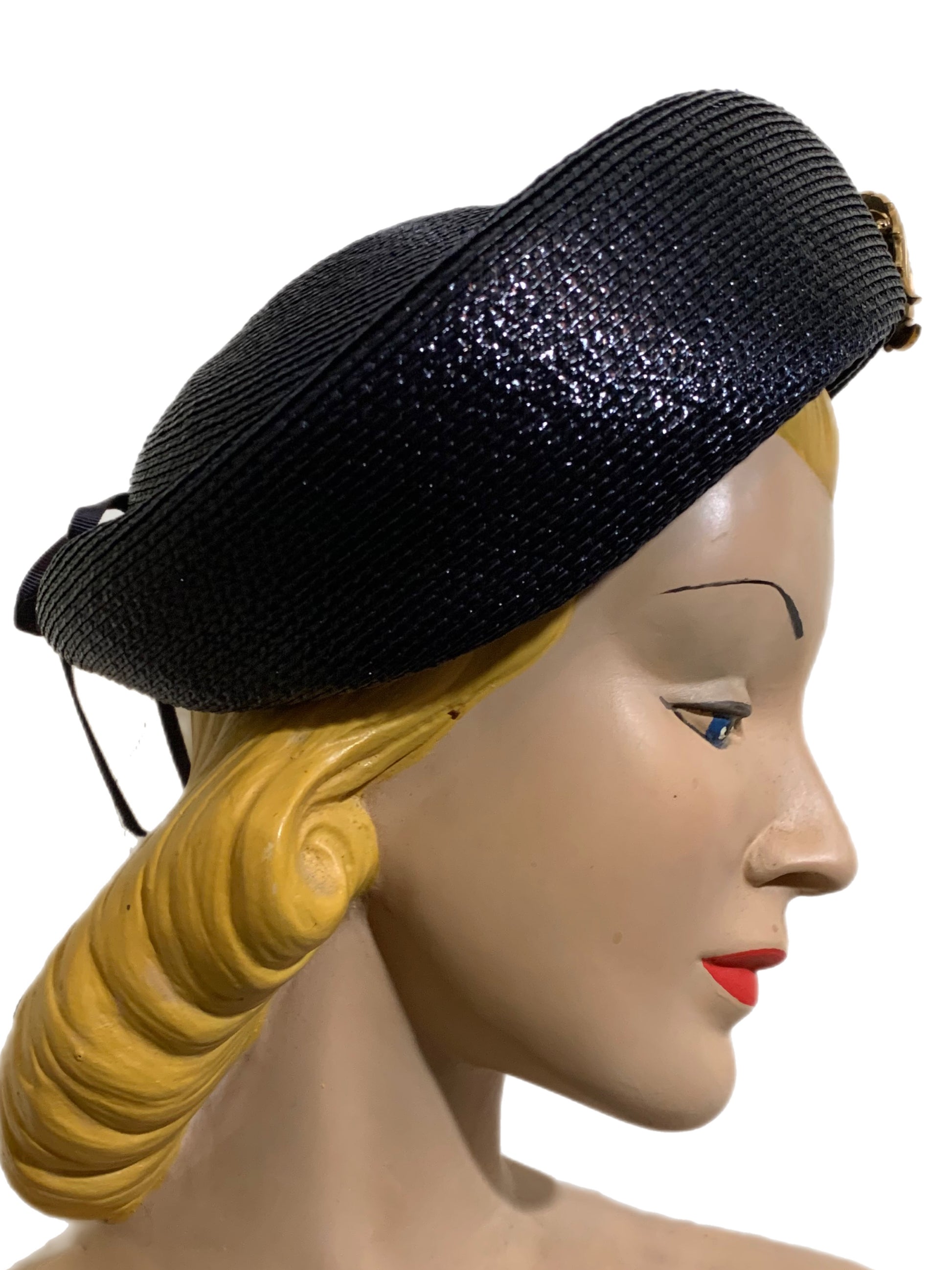 1960s blue glossy sisal round hat with bow in back. Brooch added to front by original owner. Size 22 1/2. No flaws.