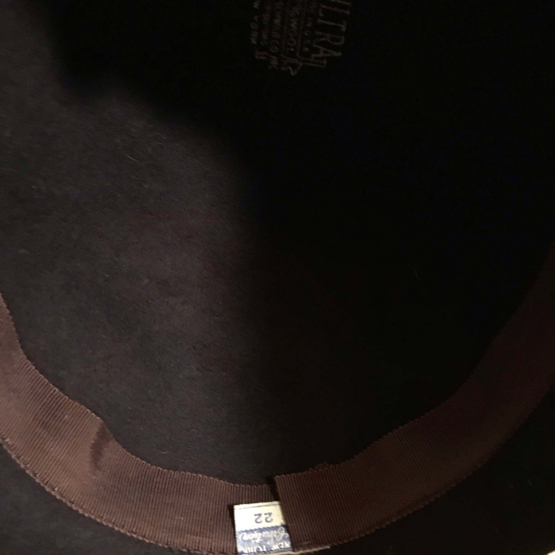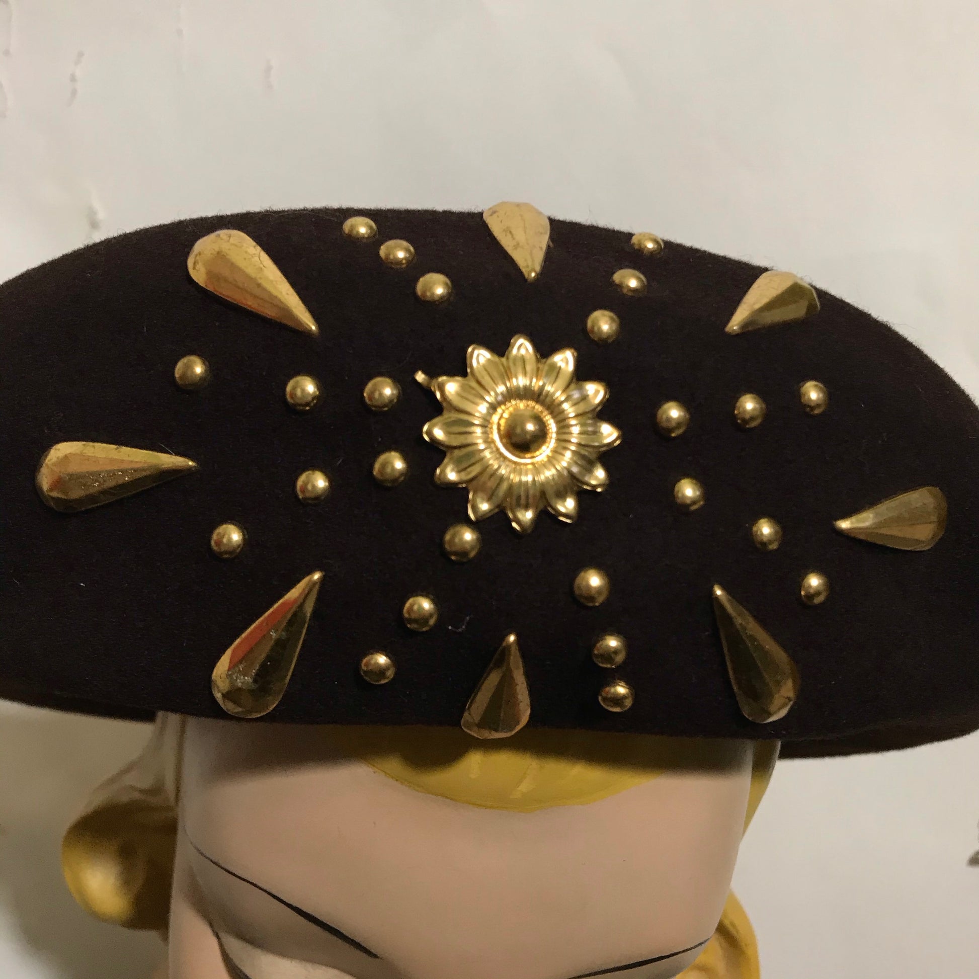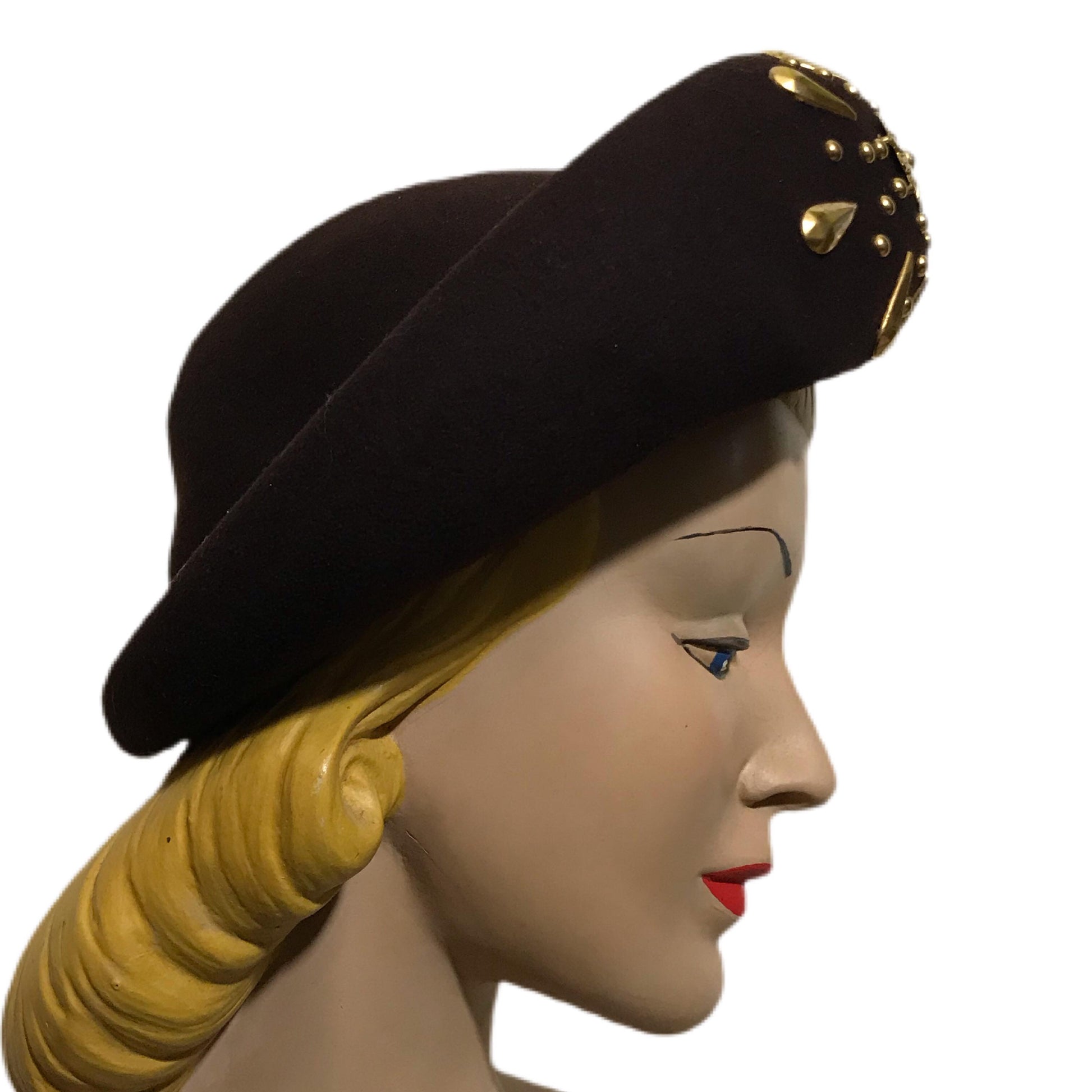 1940s round brim deep brown felted wool hat with wide front accented with gold metal studs. Size 23, no flaws.