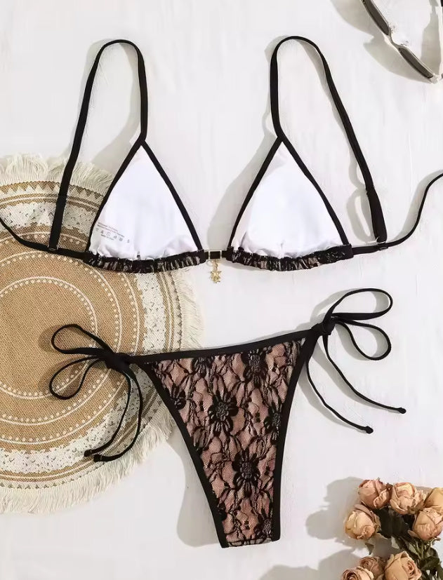 Midnight black lace string bikini, poly blend. Modern, 2-3 week delivery.