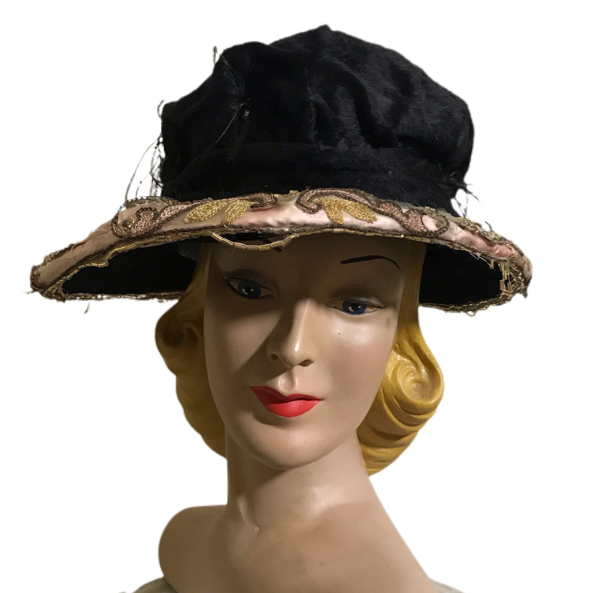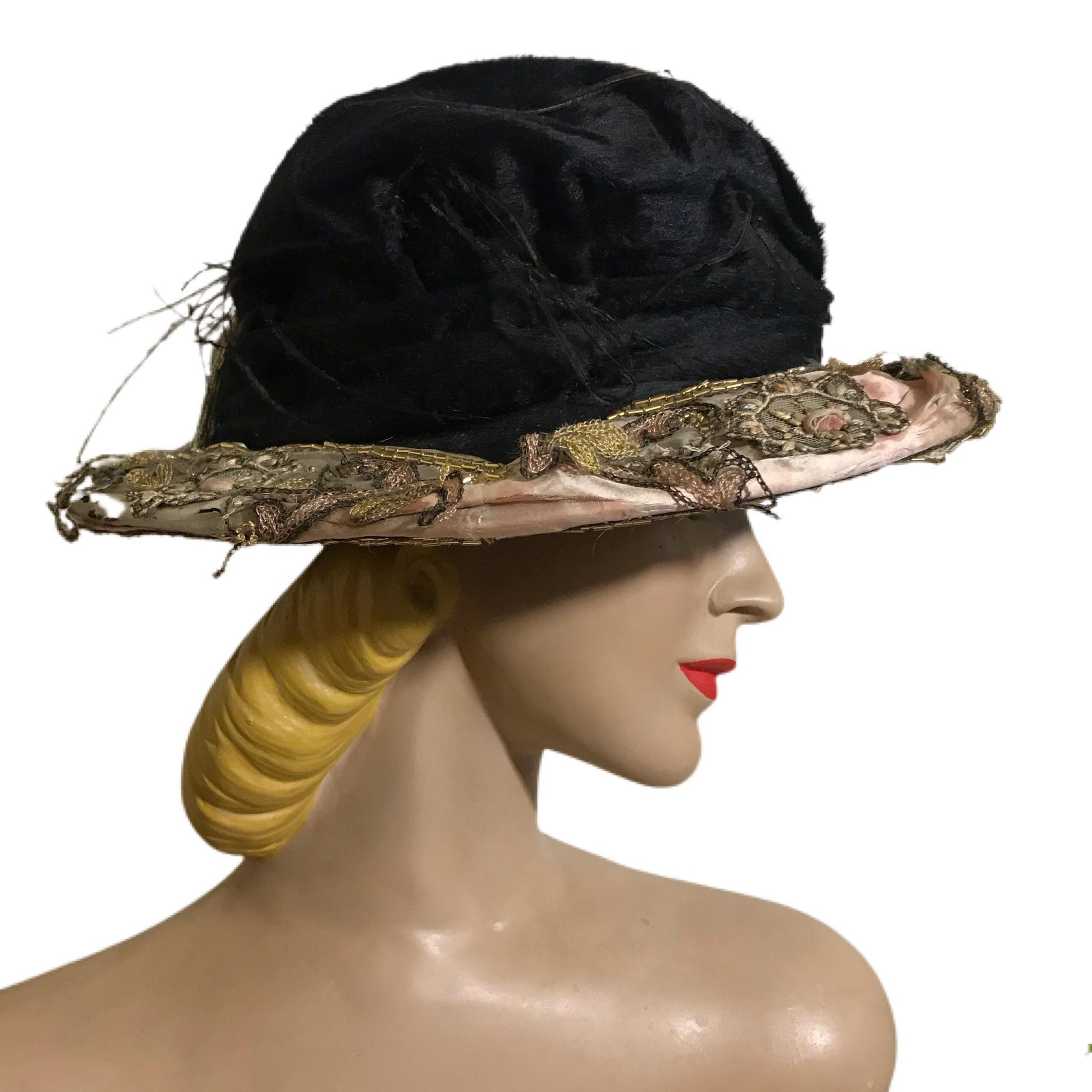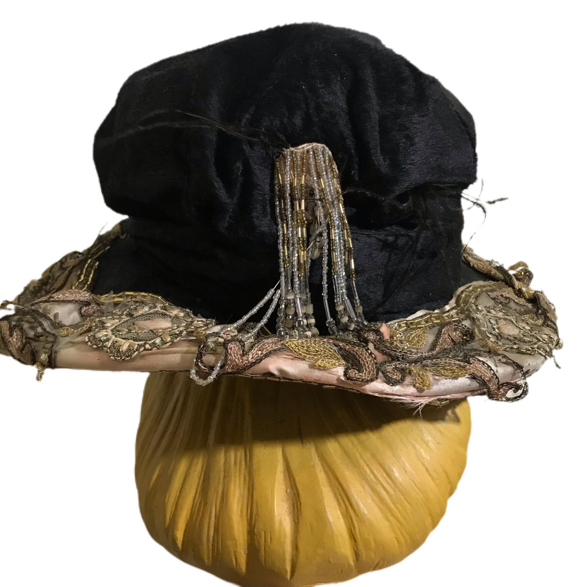 Edwardian Black & Pink Velvet Asymetrical Brim Hat with Beading and Lace circa Early 1900s