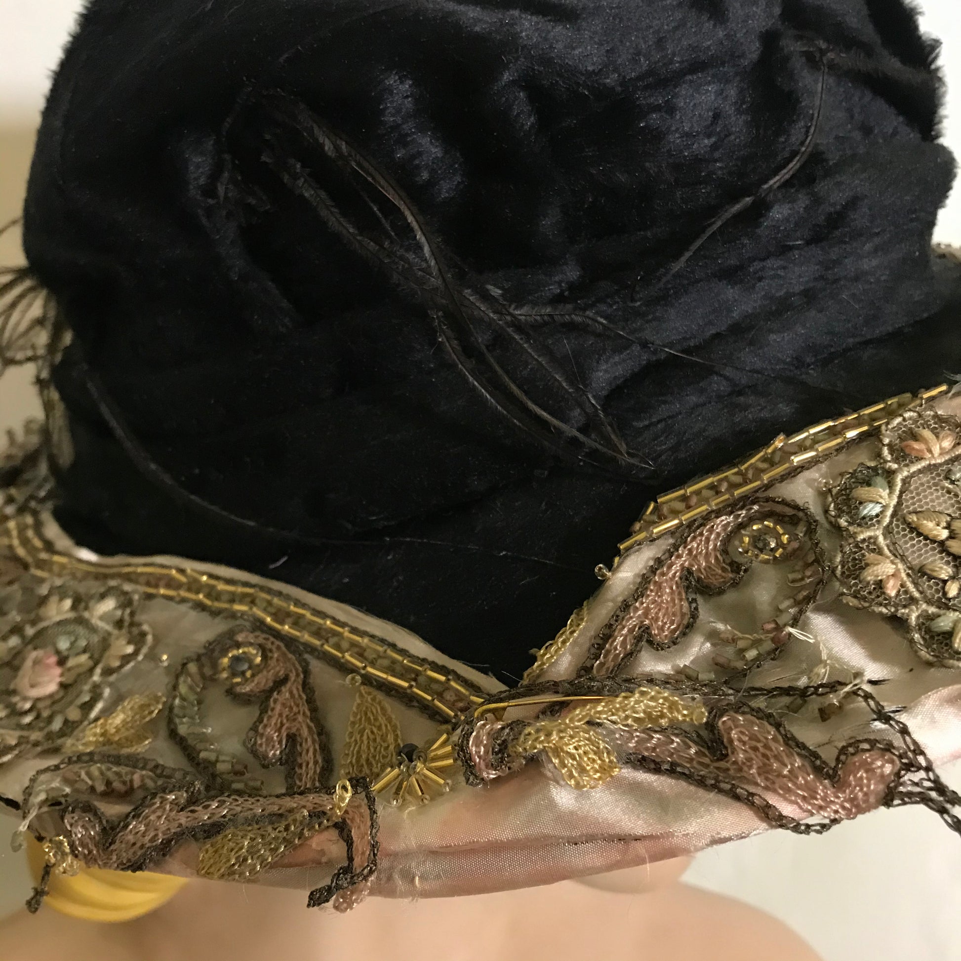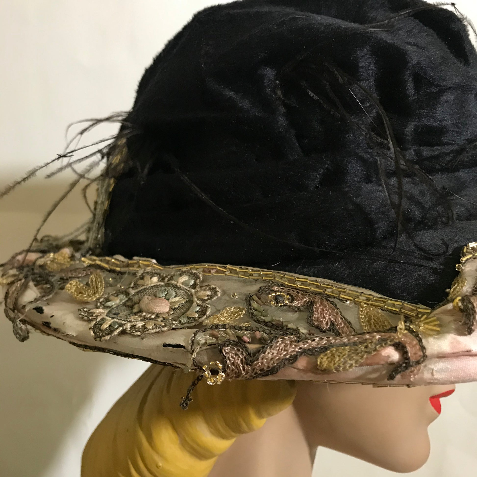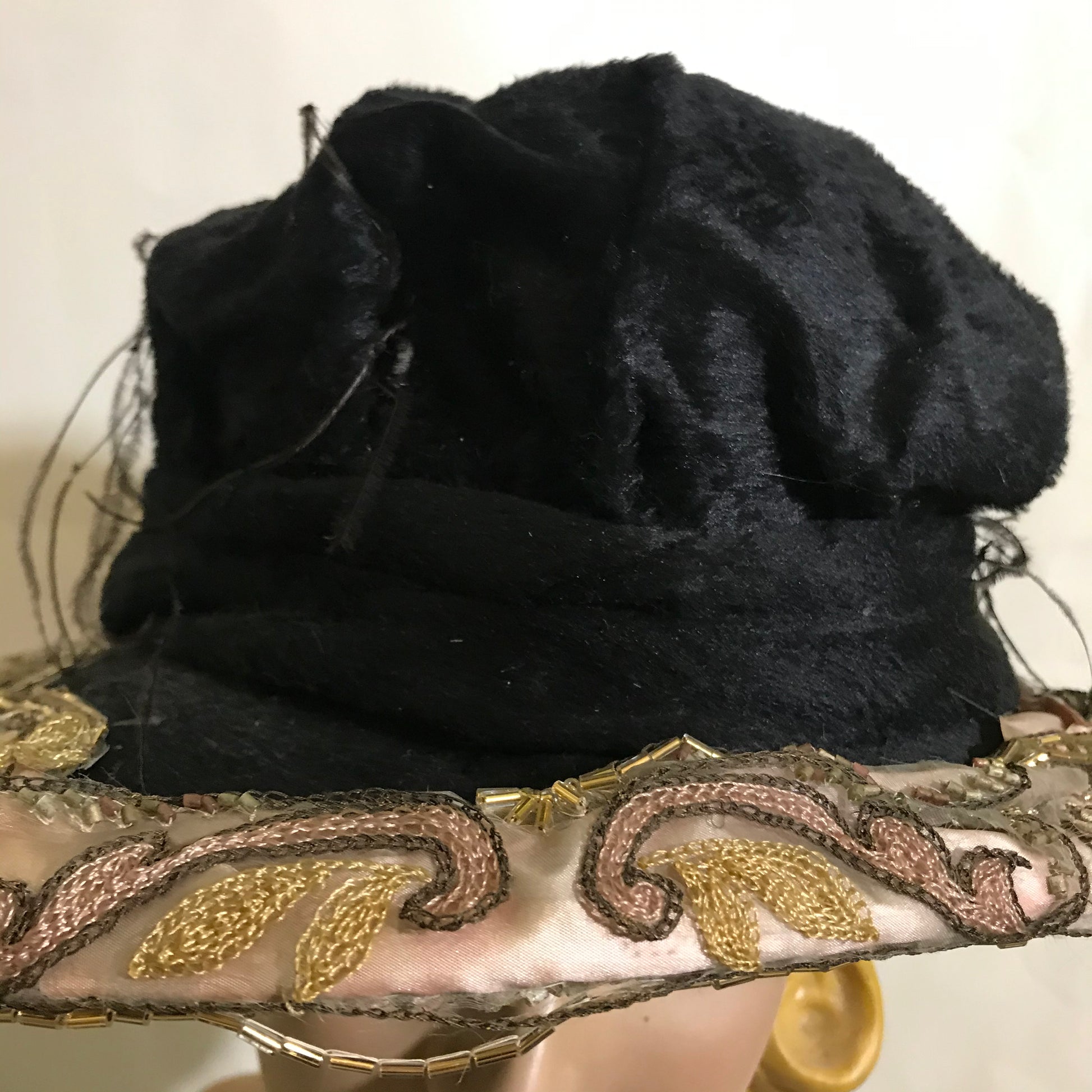 Edwardian Black & Pink Velvet Asymetrical Brim Hat with Beading and Lace circa Early 1900s