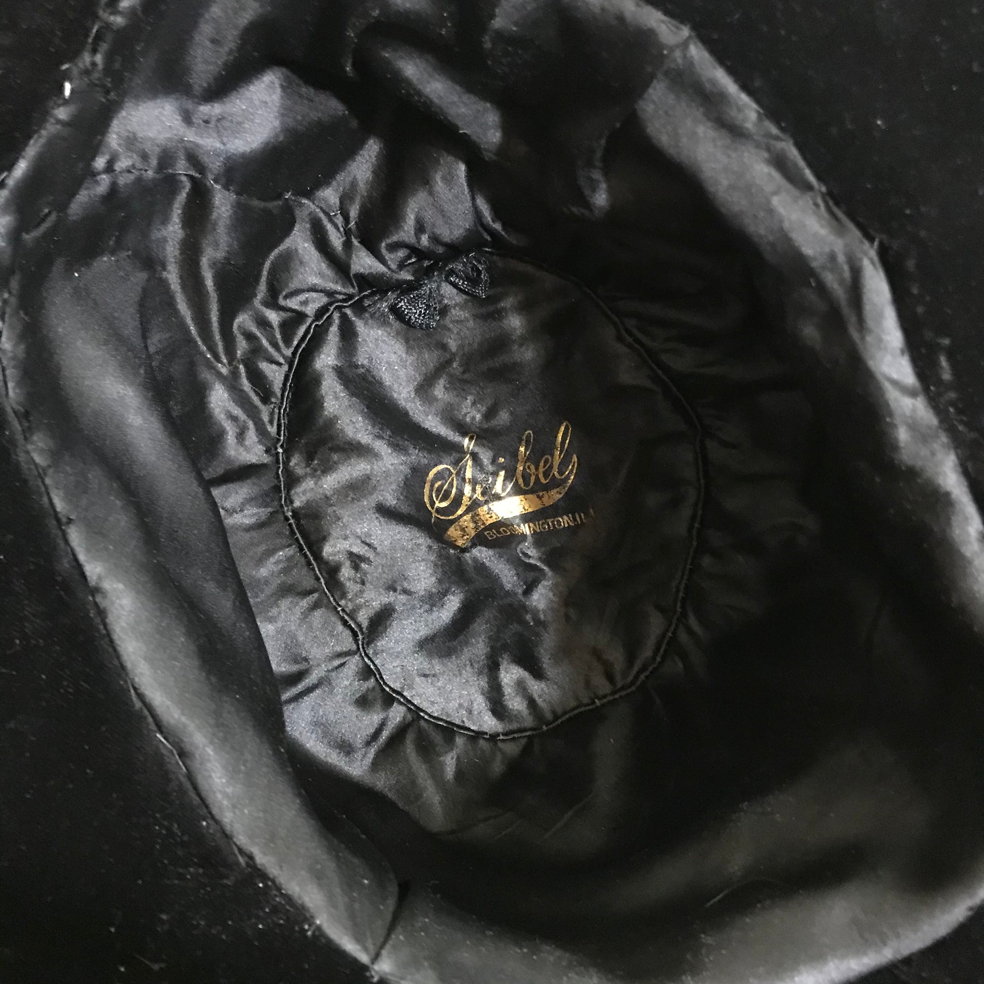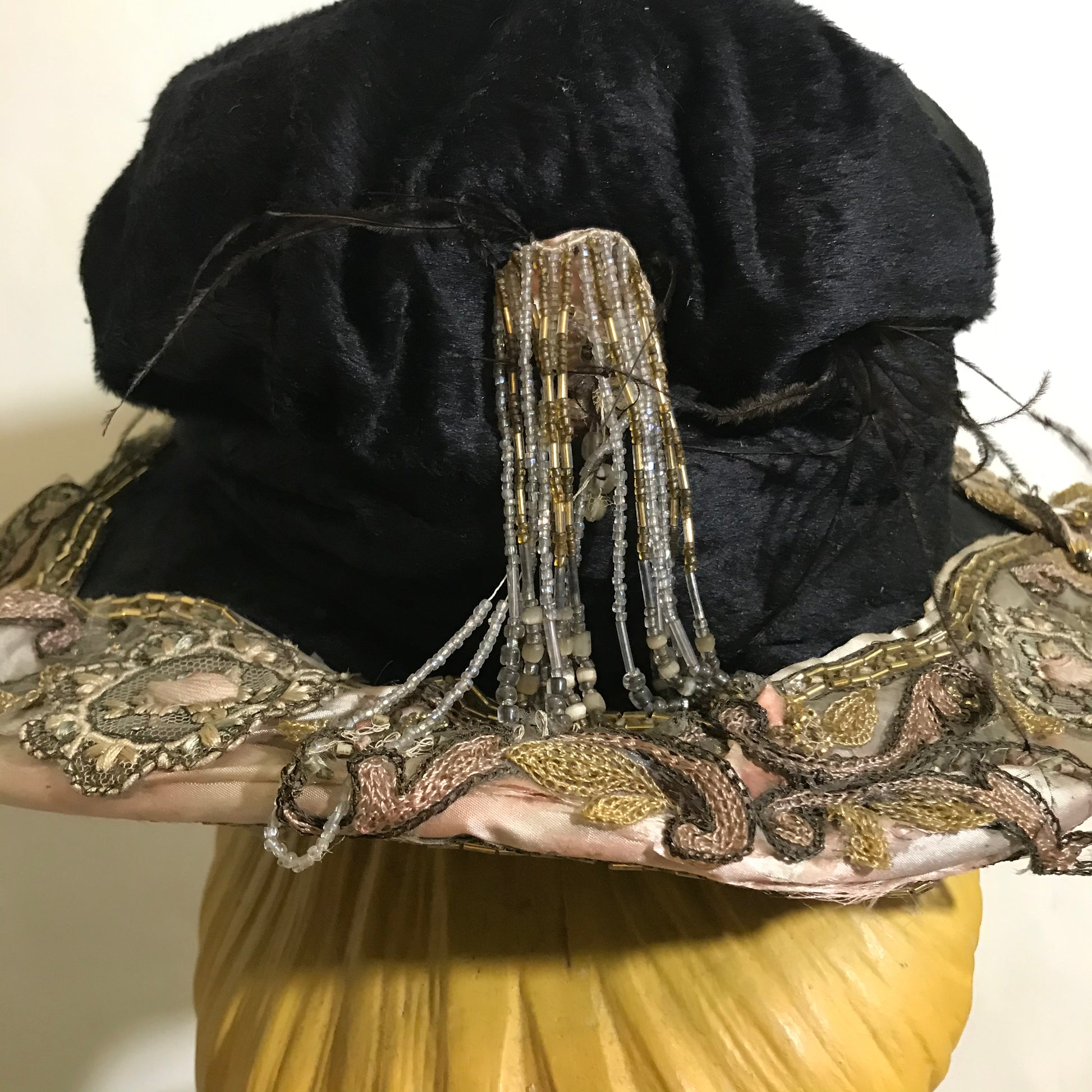 Gorgeous early 1900s wire based large crown black silk and velvet hat with pale pink silk brim, lace trim and beads- back beaded tassel accent. Some black feathers. Lined in silk. Some wear as shown, solid and wearable. Size 22 1/2.