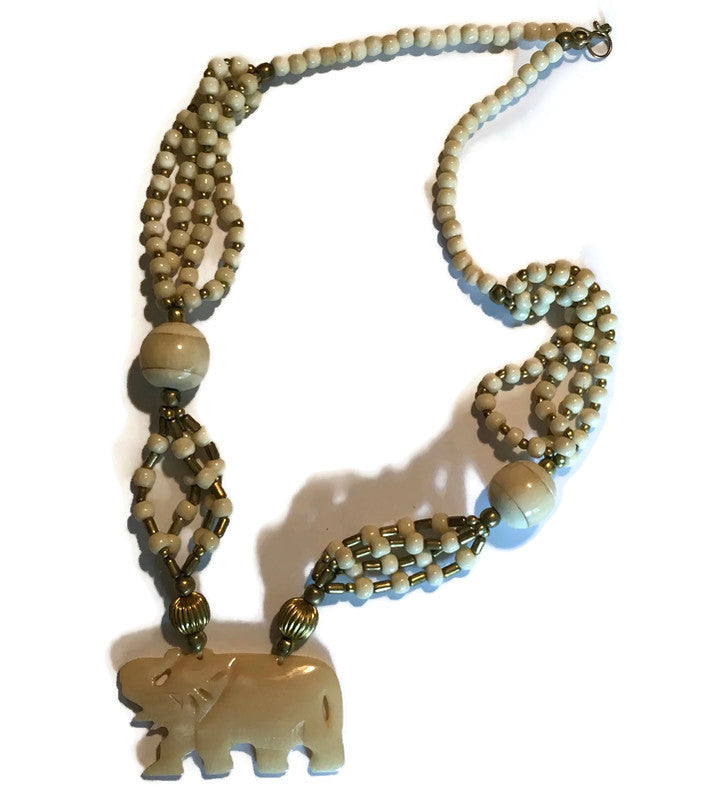 Elephant Pendant Ivory Marble Beaded Necklace circa 1980s