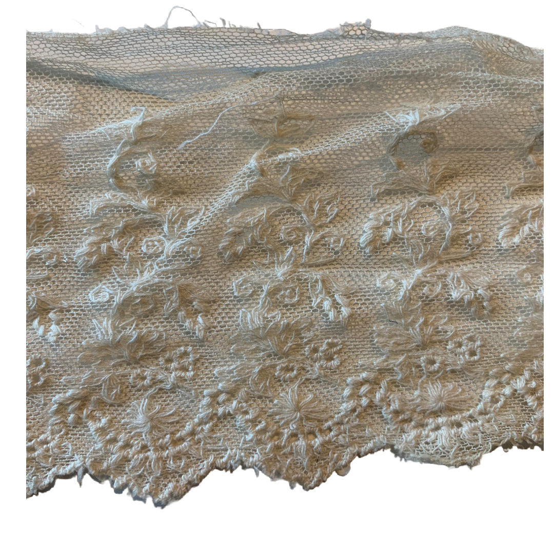 32" long, 4" wide soft white silk mesh trim with embroidery. Torn along top of mesh.