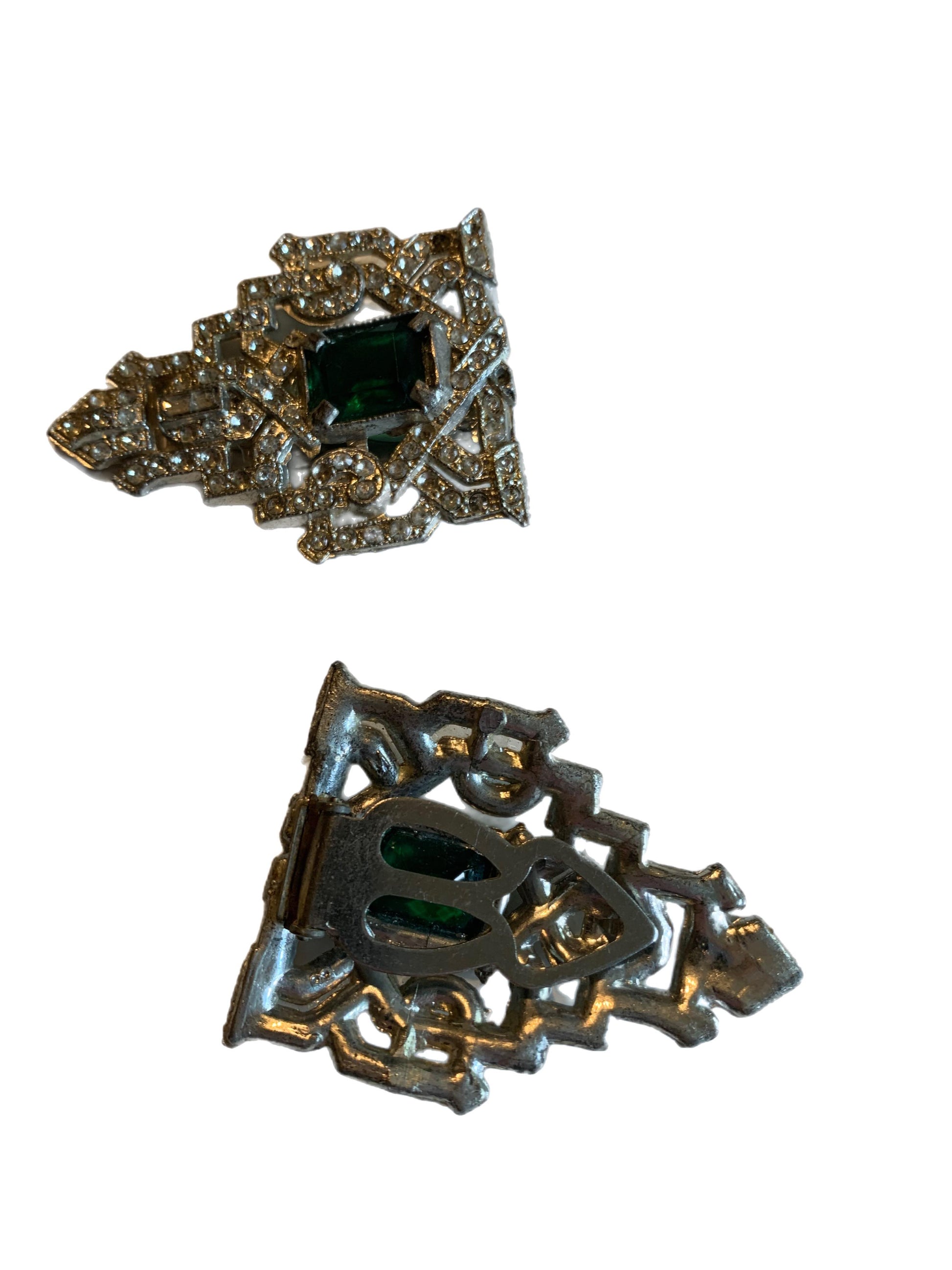 Bright silver tone pot metal 1930s fur clips with gorgeous green glass and clear rhinestones. Toothed clips. No flaws or markings.