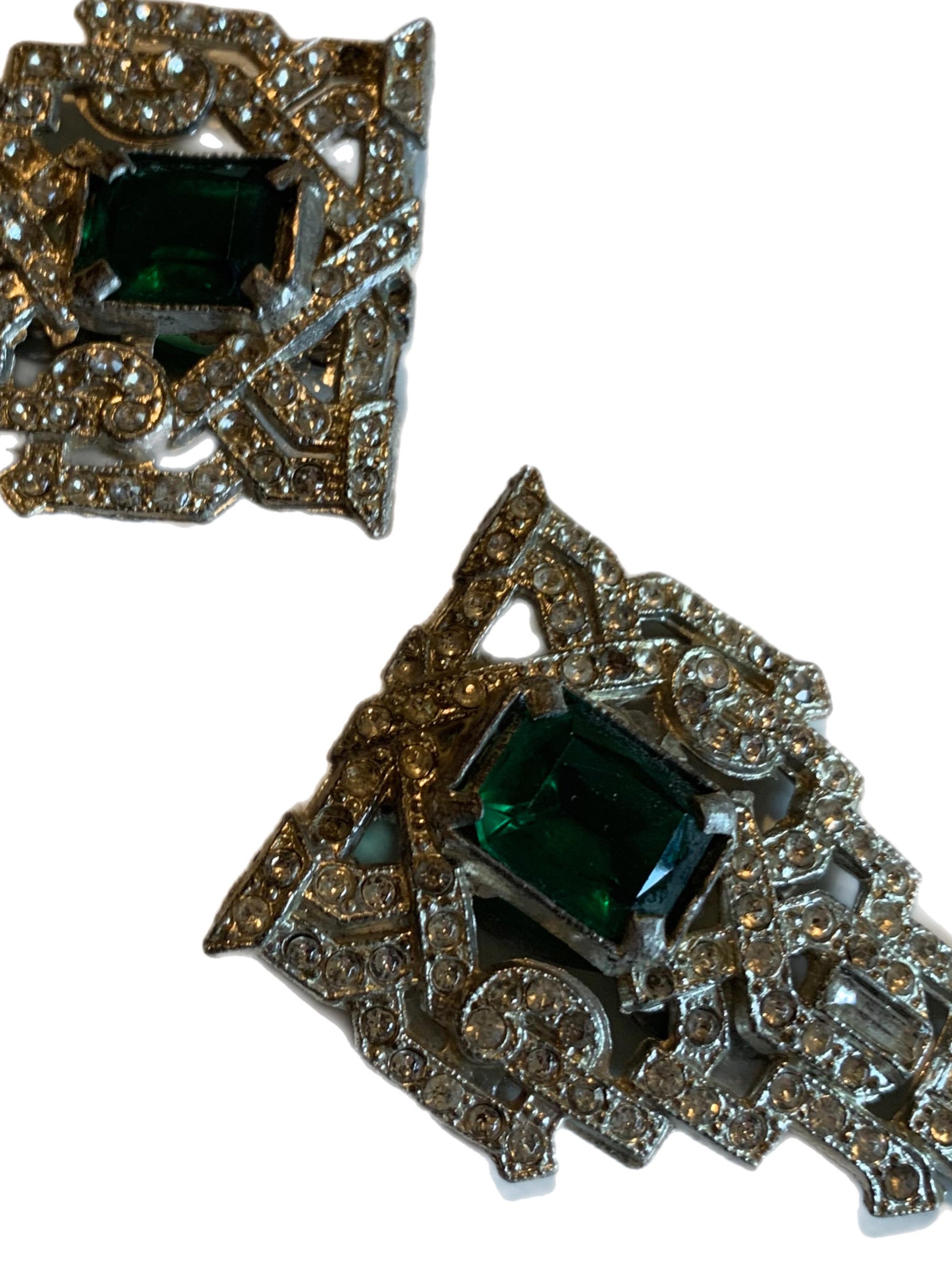 Emerald Green Glass and Rhinestones Set of Fur Clips circa 1930s